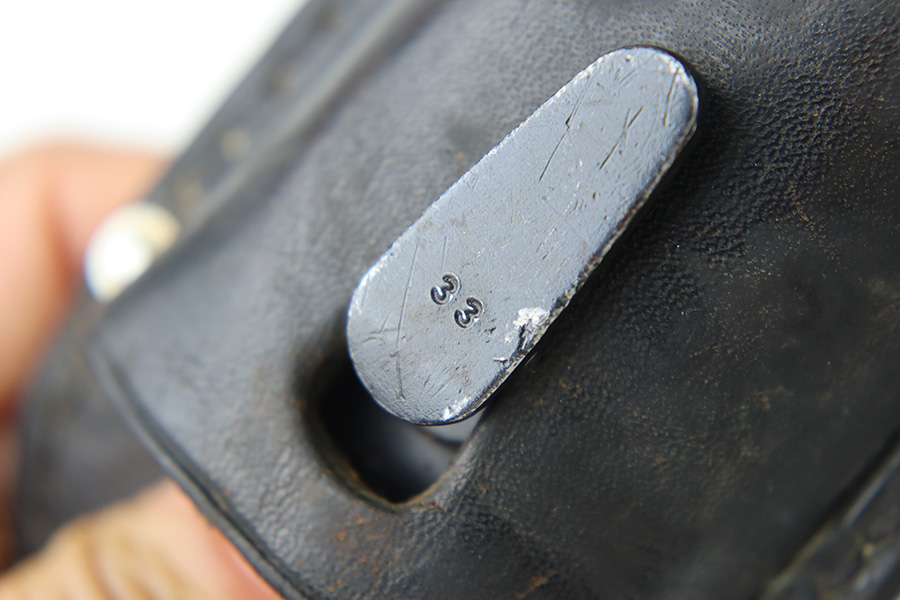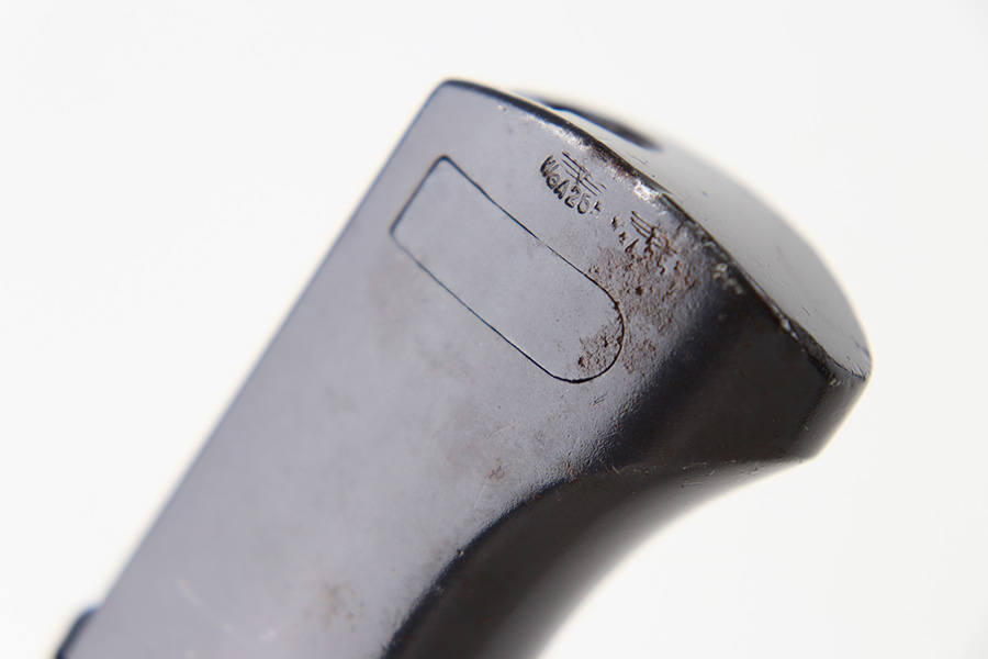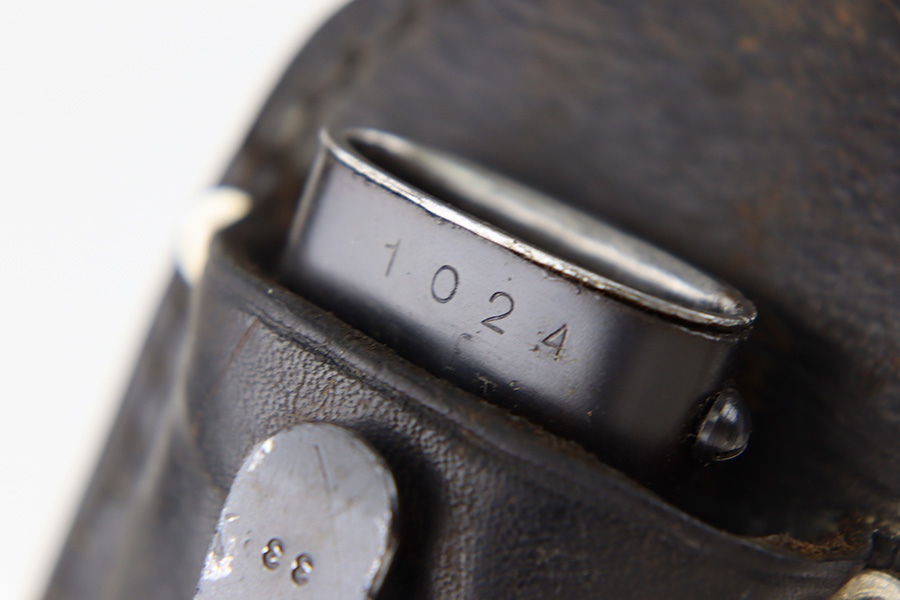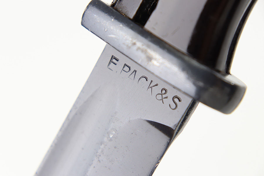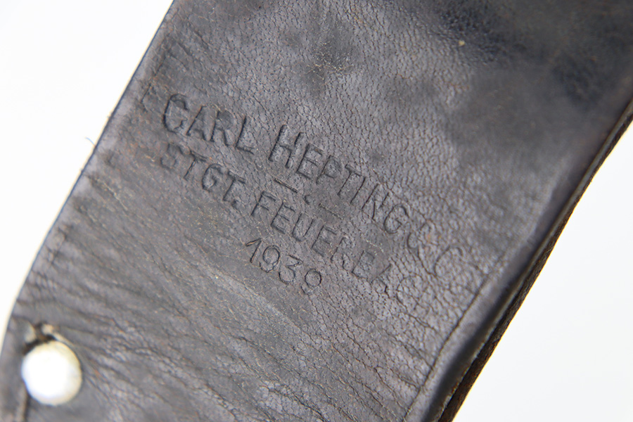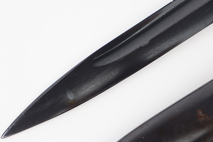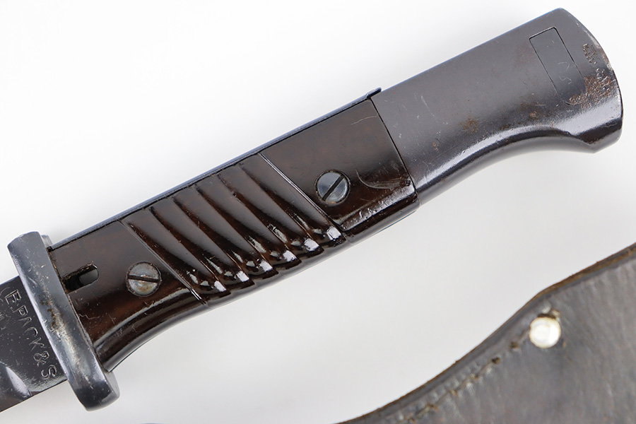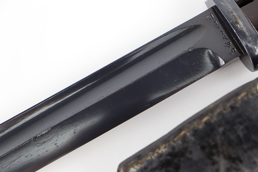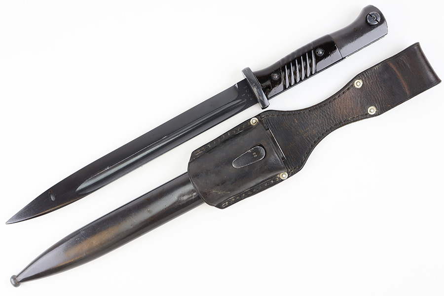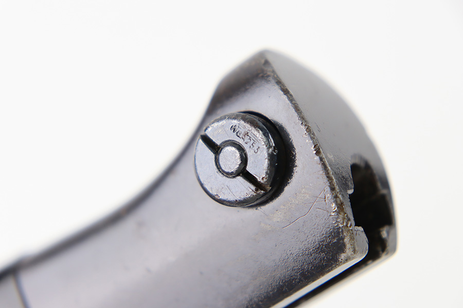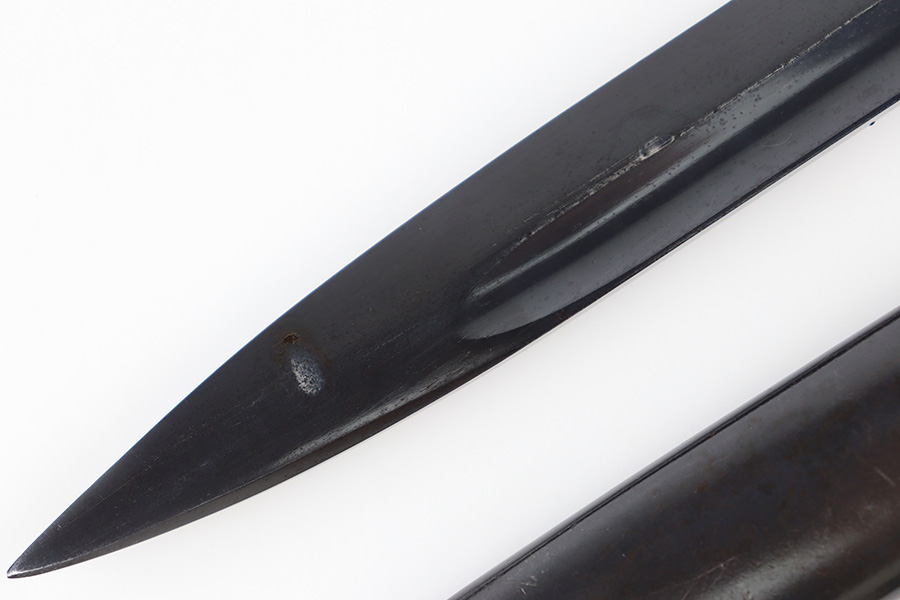 10/10/23 – This is an excellent condition K98 bayonet with a matching numbered scabbard and leather frog. The bayonet blade is excellent with minimal finish loss and some mild brown speckling patina throughout. Serial numbered on one side, and maker stamped on the other side of the ricasso. The spine of the blade is “40” dated. The cross guard is stamped “33”, as is the knob on the front of the scabbard (we’re not sure the significance). The handle has no cracks or chips, and the pommel has mild patina throughout and thinning of the finish, but most of the original bluing is intact. The scabbard is excellent as well with minimal patina and no dents or major issues. The leather frog is maker stamped and 1939 dated on the backside, as shown. A very nice high-end example.
