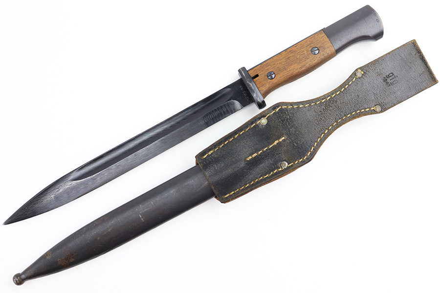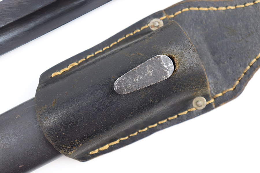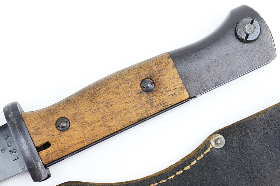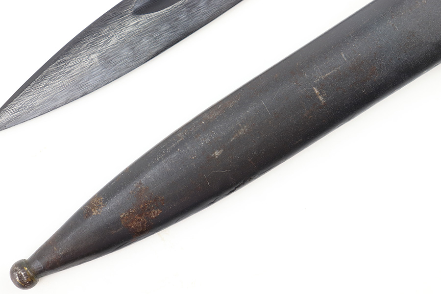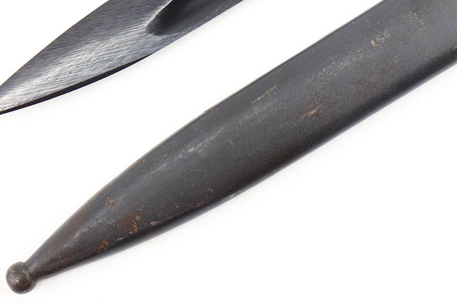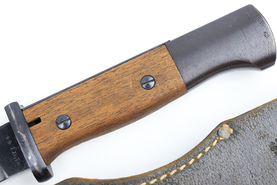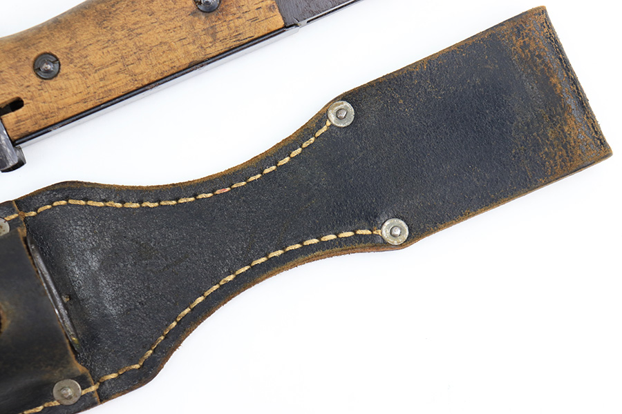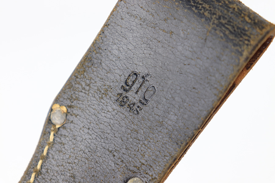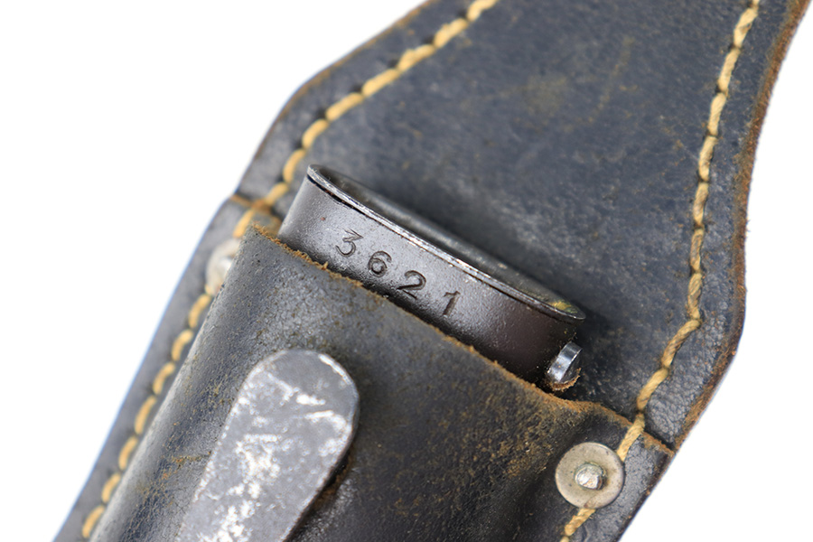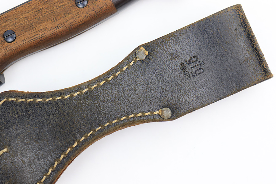 8/17/23 – This is an original, late WW2 production K98 bayonet with a matching numbered scabbard and leather frog. The bayonet blade is in excellent, near mint condition with very nice blued finish throughout. There’s some mild scabbard rub wear and minimal finish loss near the tip of the blade. No signs of sharpening. One side of the blade is marked “44 fnj” and the other side is numbered “3621b”. The cross guard has light finish loss throughout, but no dark discoloration. The wood grips are mint. The metal spine of the handle and pommel have light patina and spots of freckling. The scabbard has some dark patina mostly near the toe on both sides. Overall excellent with no dents or major issues. The leather frog is in great condition with some mild wrinkling and scuffs in the leather. The top rounded area of leather has the largest concentration of wear. The back of the frog is “gfg 1943” maker and date marked.