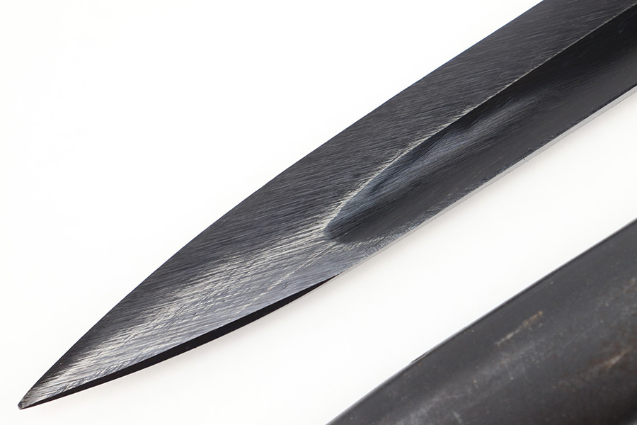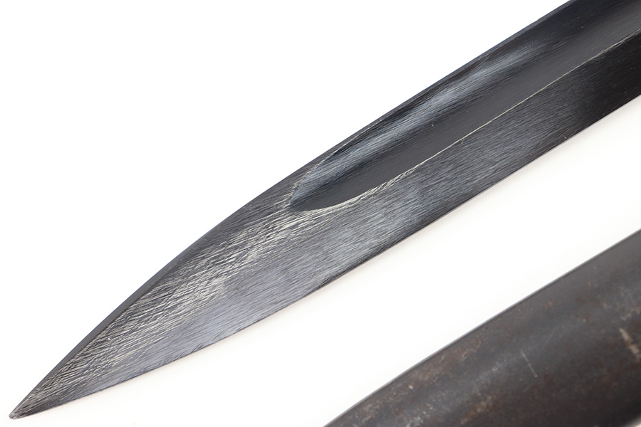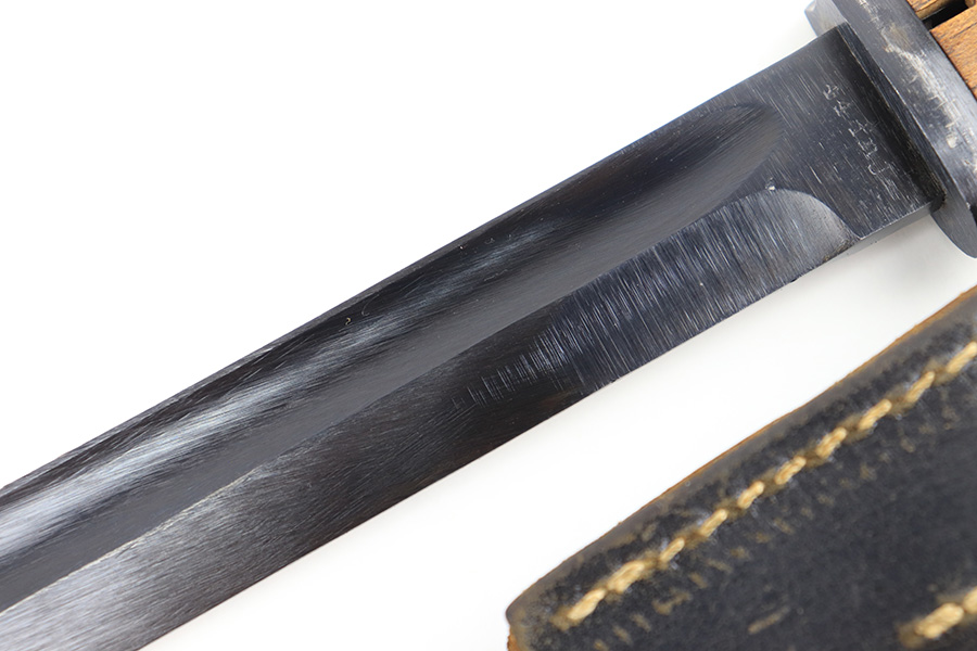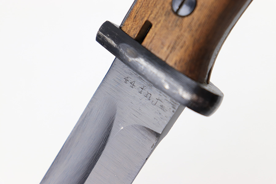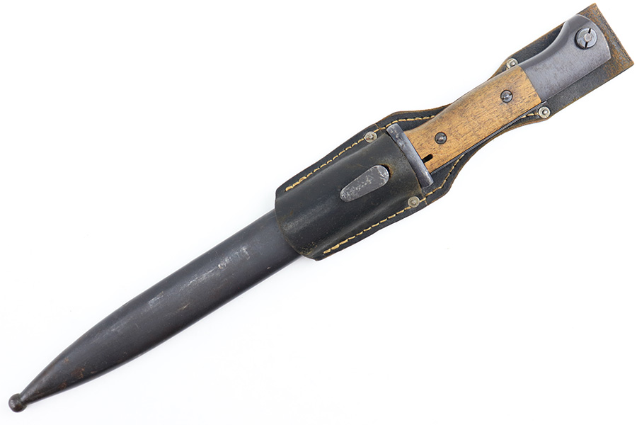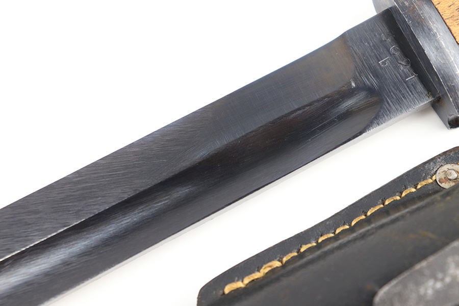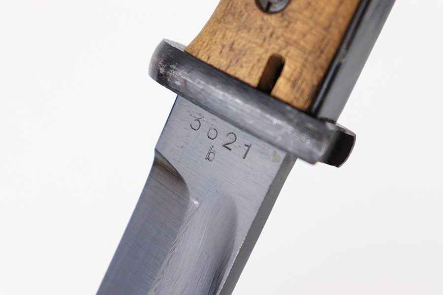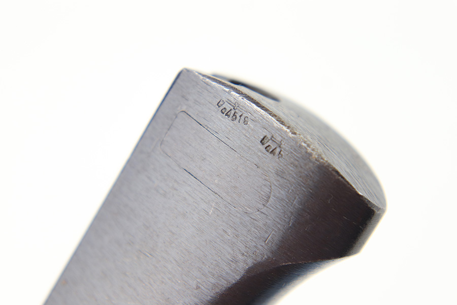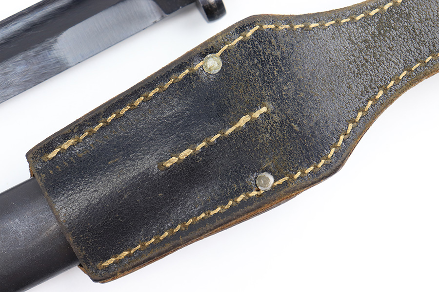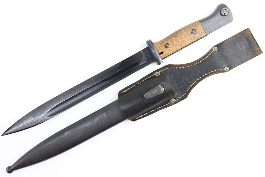 8/17/23 – This is an original, late WW2 production K98 bayonet with a matching numbered scabbard and leather frog. The bayonet blade is in excellent, near mint condition with very nice blued finish throughout. There’s some mild scabbard rub wear and minimal finish loss near the tip of the blade. No signs of sharpening. One side of the blade is marked “44 fnj” and the other side is numbered “3621b”. The cross guard has light finish loss throughout, but no dark discoloration. The wood grips are mint. The metal spine of the handle and pommel have light patina and spots of freckling. The scabbard has some dark patina mostly near the toe on both sides. Overall excellent with no dents or major issues. The leather frog is in great condition with some mild wrinkling and scuffs in the leather. The top rounded area of leather has the largest concentration of wear. The back of the frog is “gfg 1943” maker and date marked.