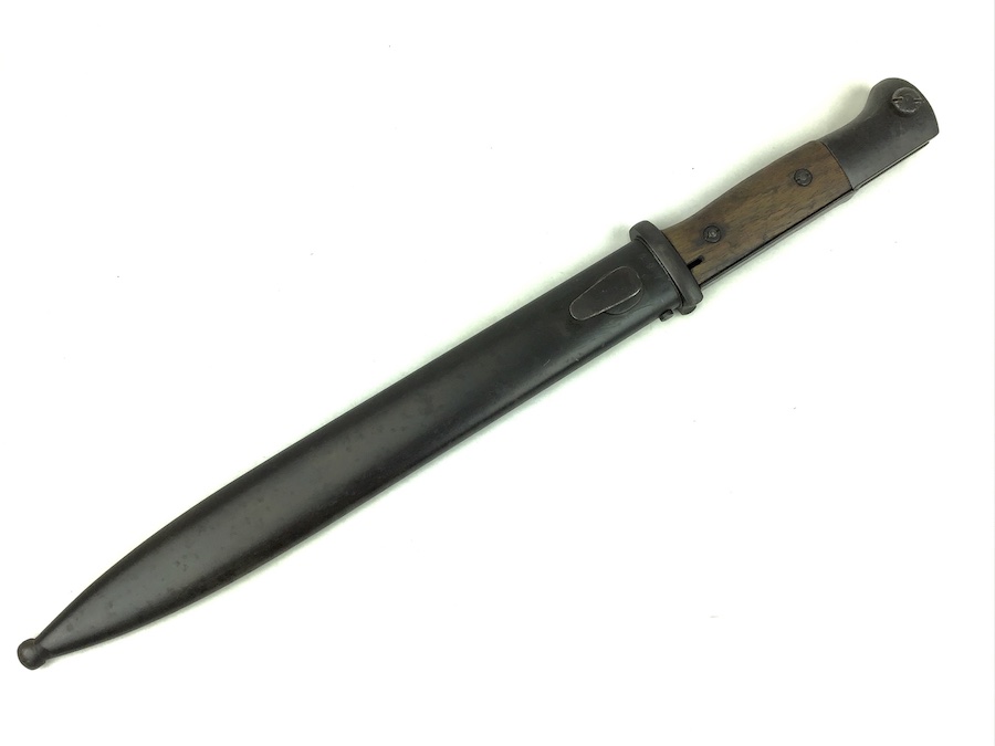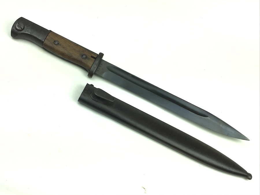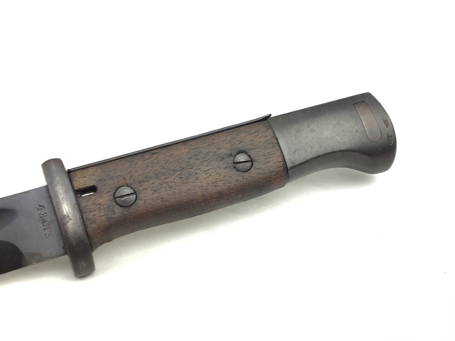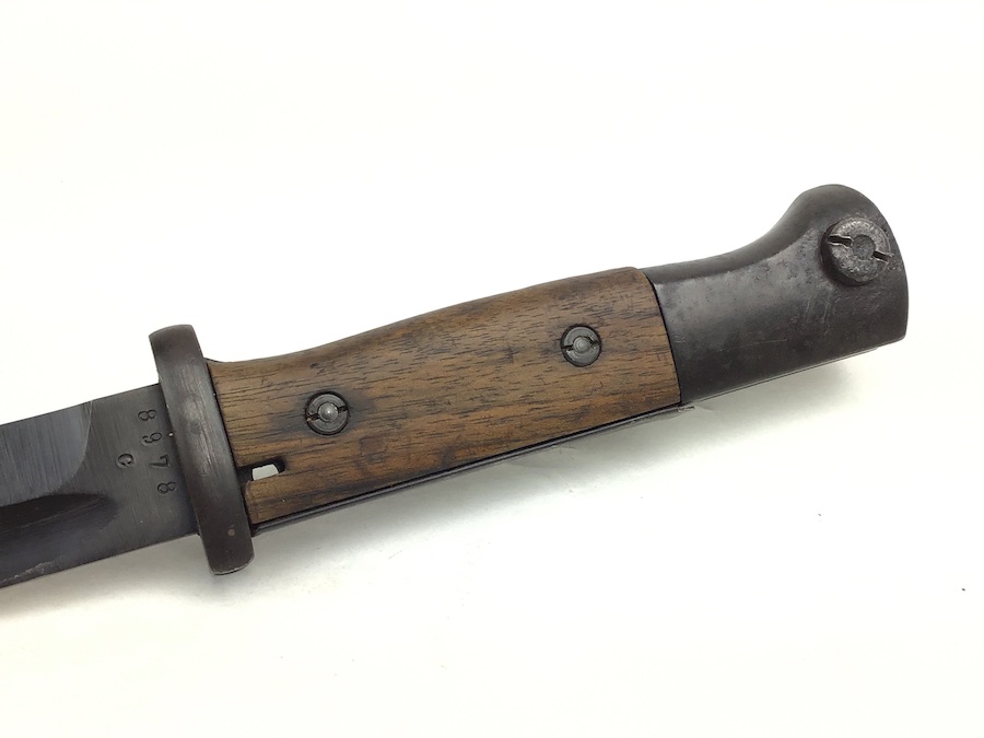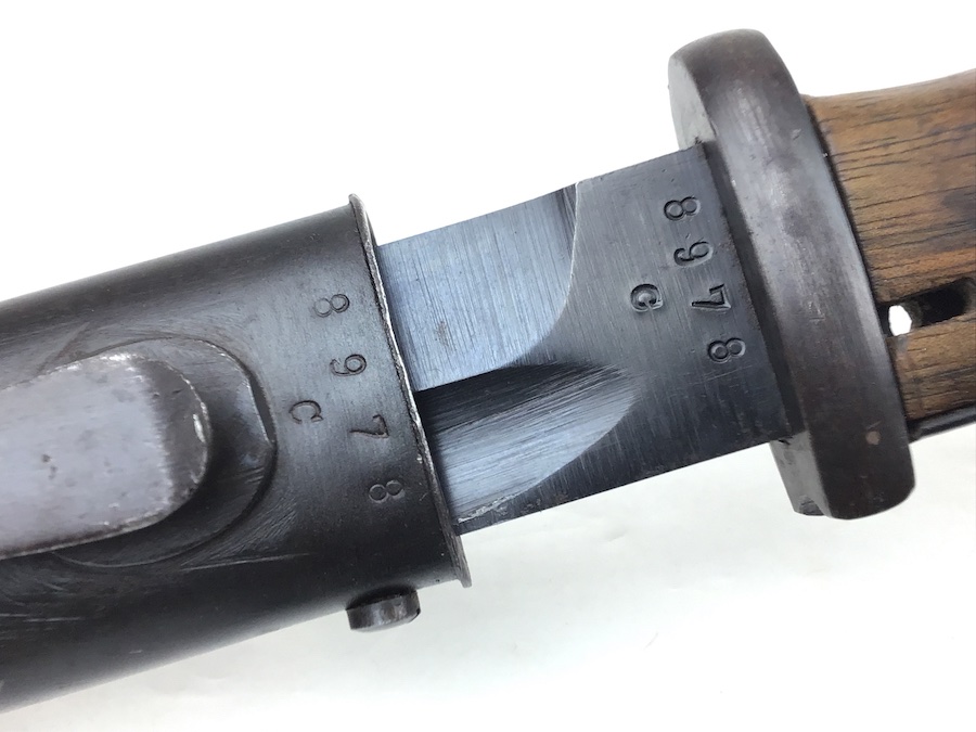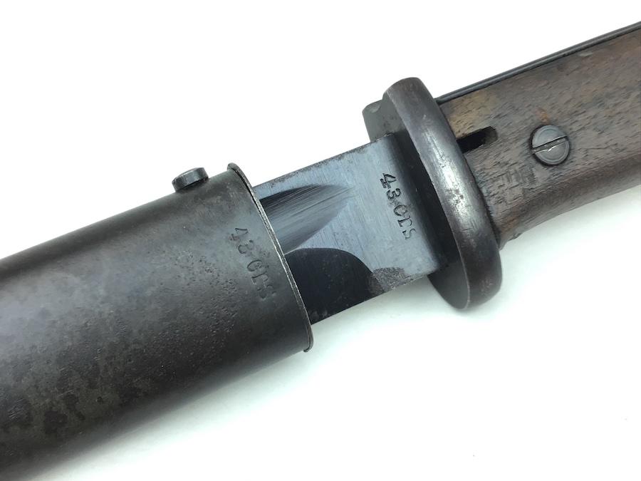 3/12/20 – This is an original 1943 dated K98 bayonet with a matching serial numbered scabbard. Ricasso & scabbard are stamped “43 CRS” on one side and “8978 c” on the other. The bayonet has a secure, hardwood handle with no cracks or chips. Some patina throughout the metal portions of the handle with minor use dings. The blade itself has beautiful bluing and minimal signs of use and no evidence of sharpening. The scabbard has some finish thinning and beginning signs of patina speckled throughout. Overall a very nice, minty collector grade bayonet.