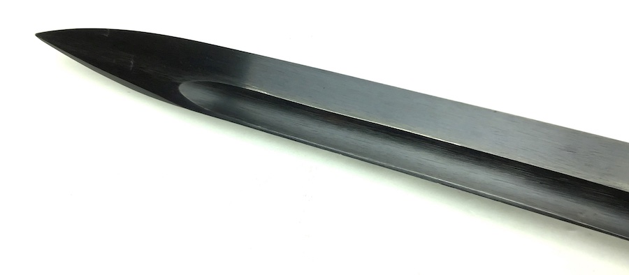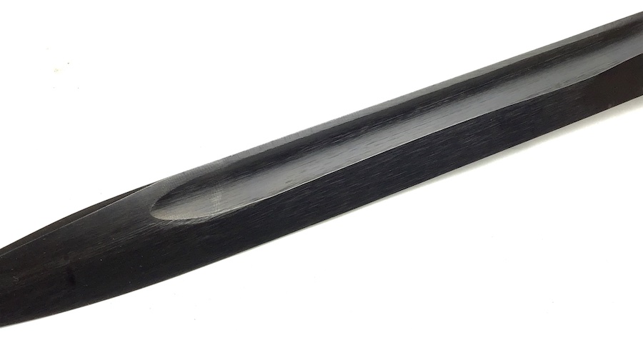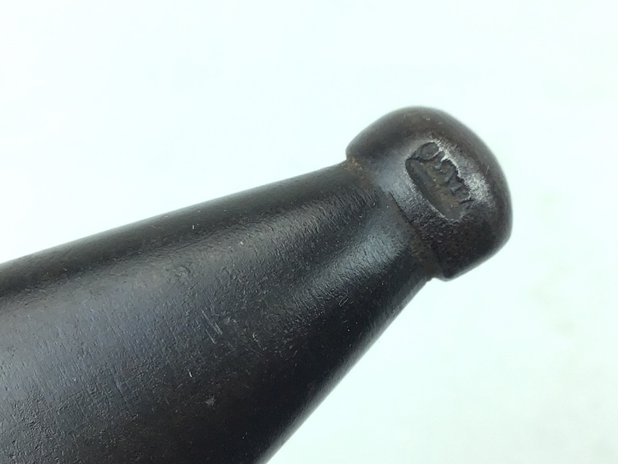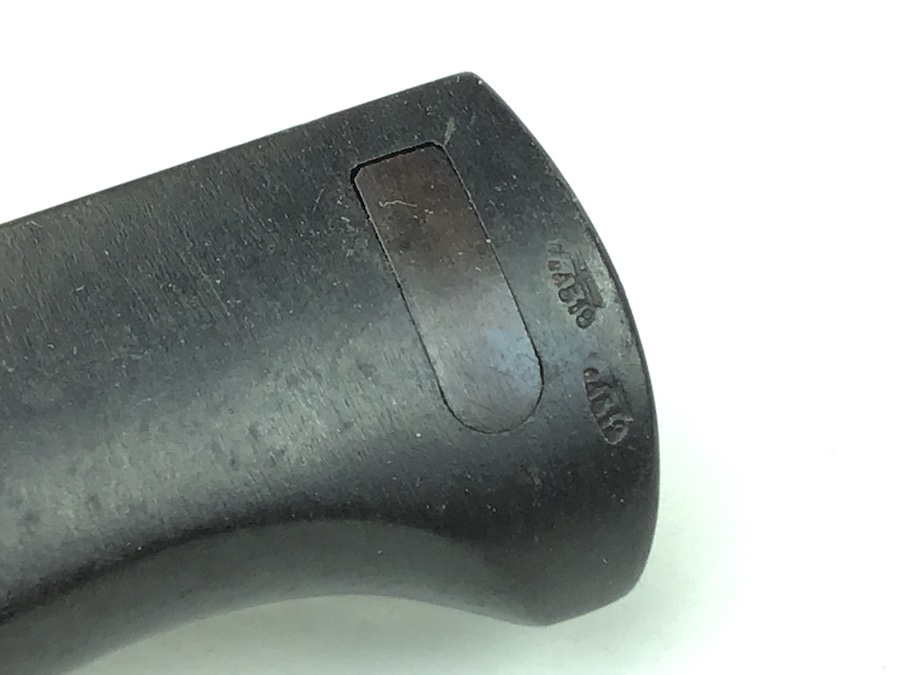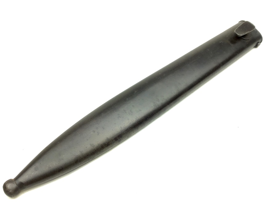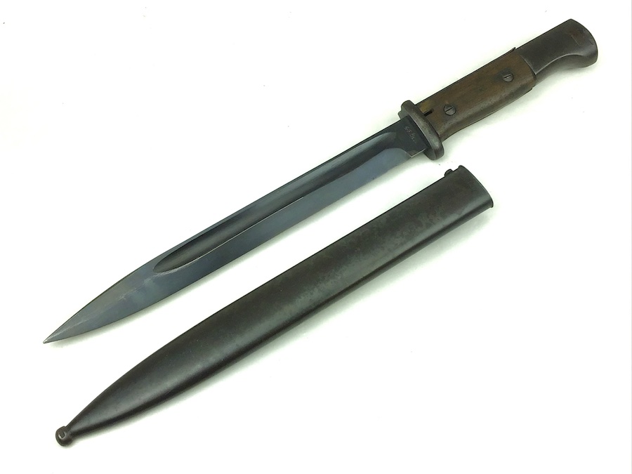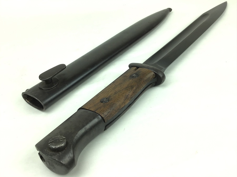 3/12/20 – This is an original 1943 dated K98 bayonet with a matching serial numbered scabbard. Ricasso & scabbard are stamped “43 CRS” on one side and “8978 c” on the other. The bayonet has a secure, hardwood handle with no cracks or chips. Some patina throughout the metal portions of the handle with minor use dings. The blade itself has beautiful bluing and minimal signs of use and no evidence of sharpening. The scabbard has some finish thinning and beginning signs of patina speckled throughout. Overall a very nice, minty collector grade bayonet.