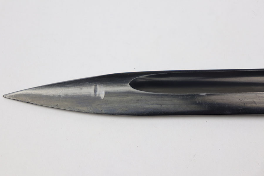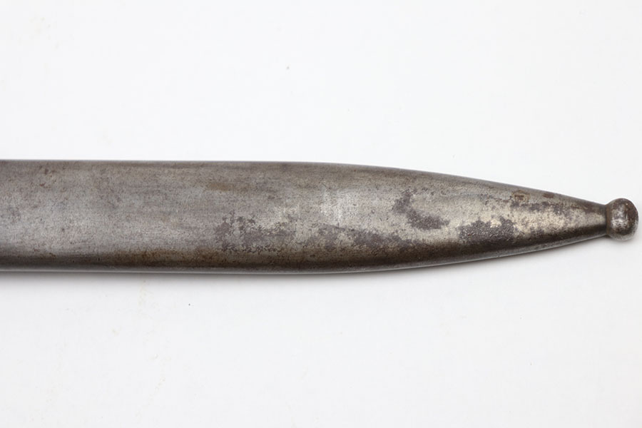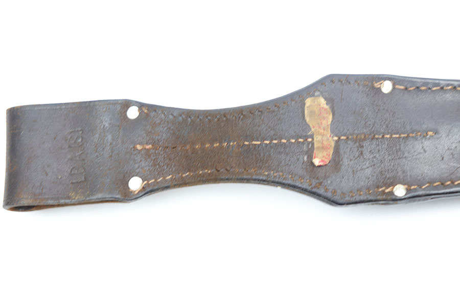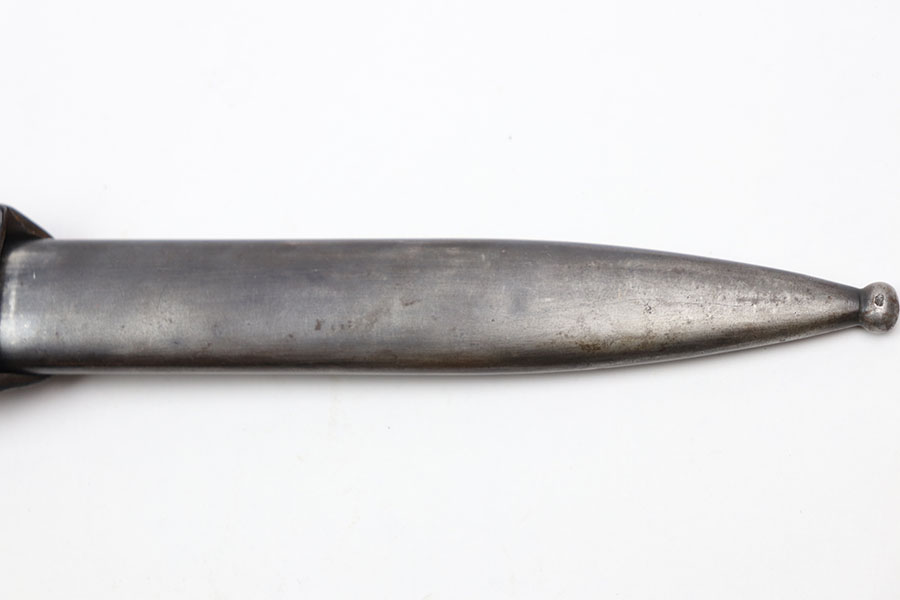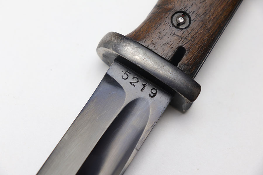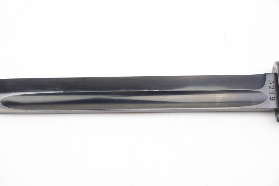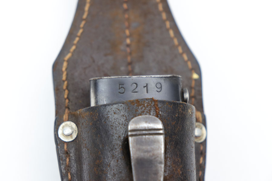 12/3/20 – This is an original early WW2 production K98 bayonet. The bayonet is matching numbered “5219” on both the scabbard and blade. The blade is excellent, in near mint condition. The wood handle is also excellent but the metal pommel has patina throughout. Further, the scabbard is missing most of the finish and has patina / minor rust near the toe. No dents. The leather frog has light wear throughout and a faint maker stamp on the back.