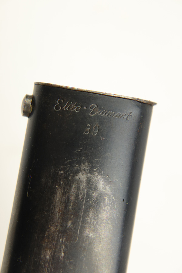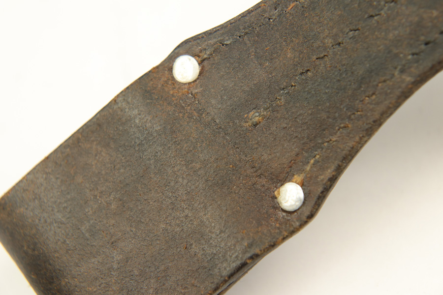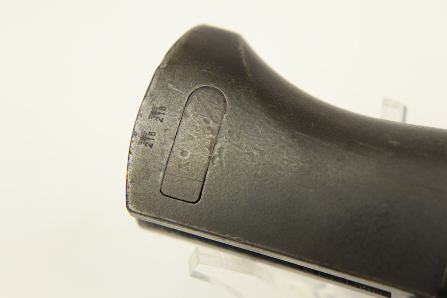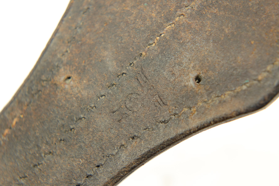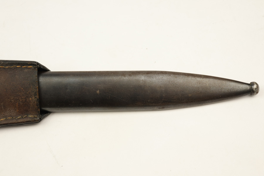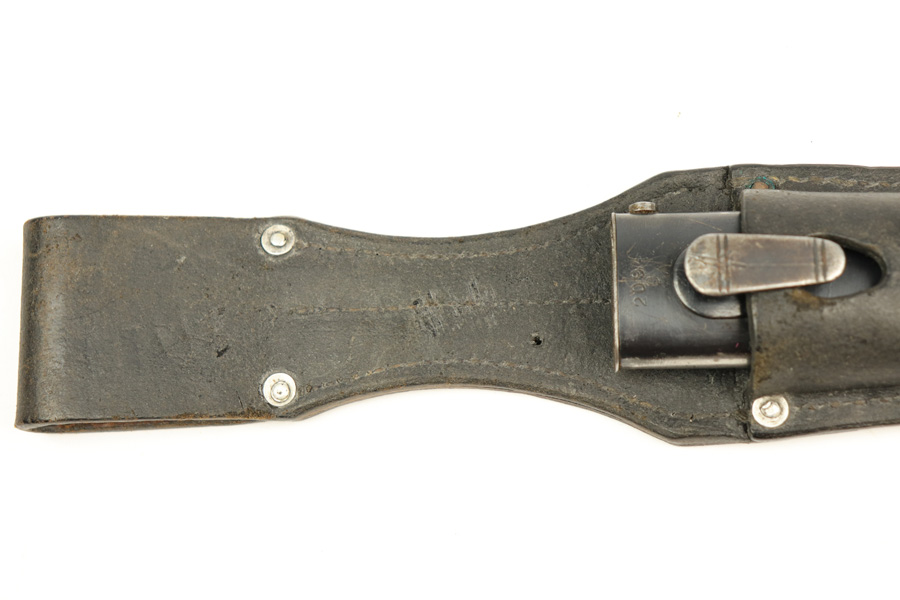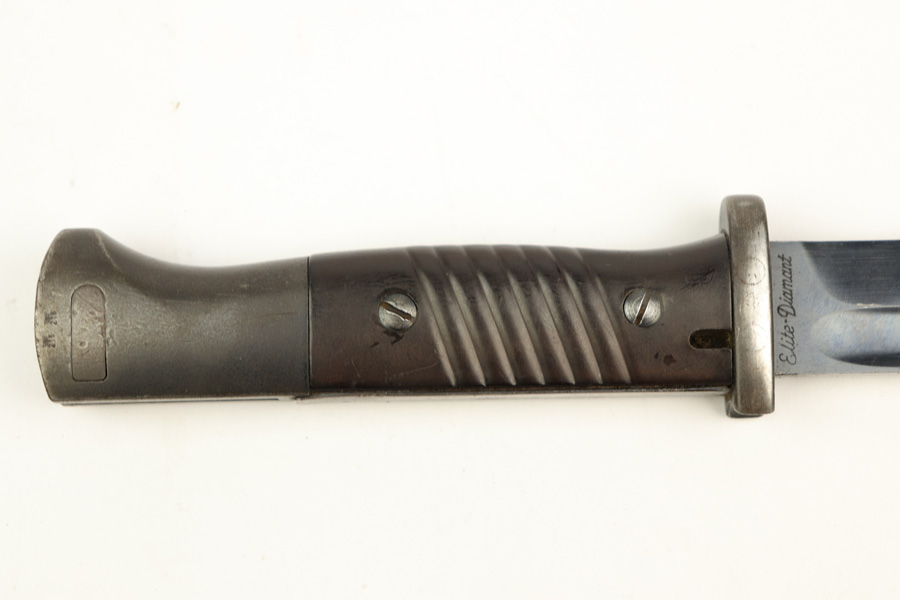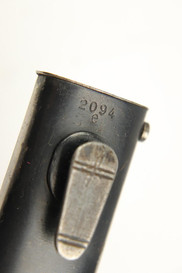 11/20/18 – This is a beautiful and rare K98 bayonet with unique maker and a Kriegsmarine stamp on the leather frog. The bayonet and scabbard are matching serial numbered 2094e. They’re also both maker stamped by Elite Diamart. The scabbard and blade are both 1939 dated. The blade is unsharpened and in beautiful condition. The scabbard has patina throughout but no dents or other significant flaws. The frog appears to have a replaced rivet, but the rivet still looks aged. The back of the frog is Kriegsmarine stamped. Guaranteed original and authentic.