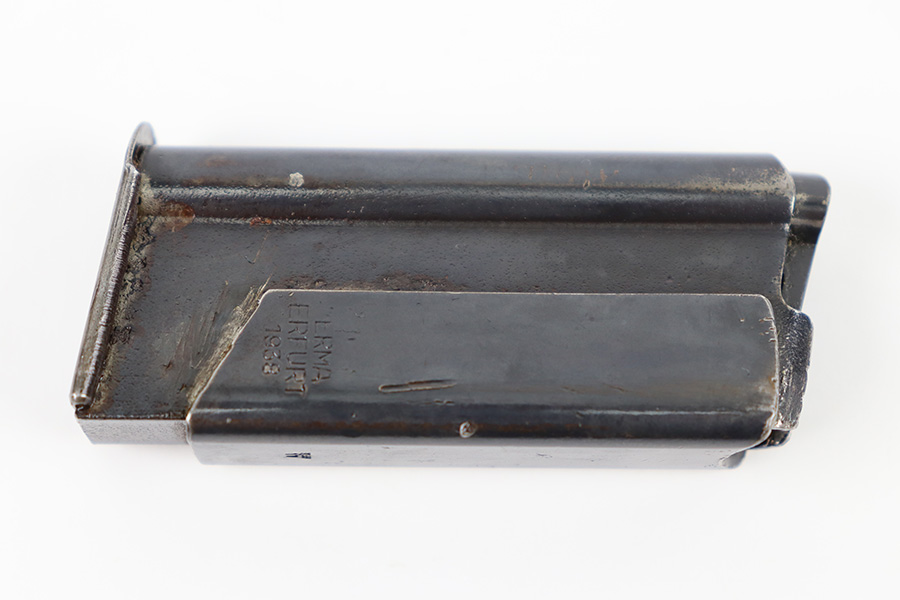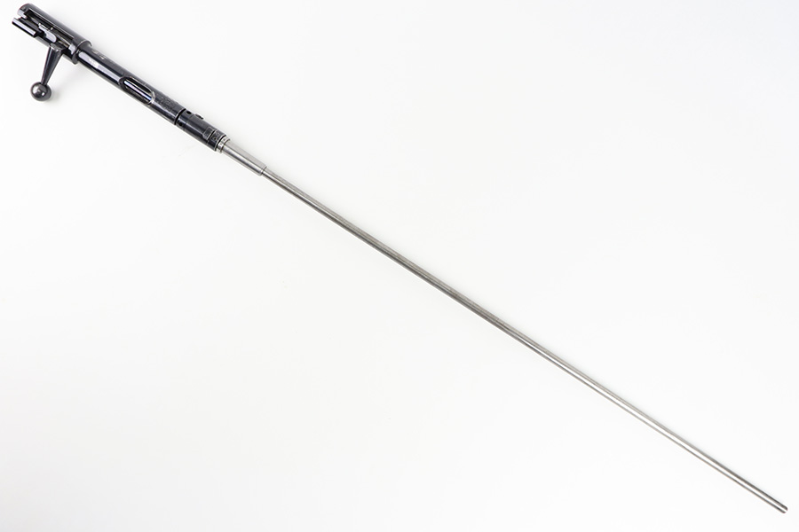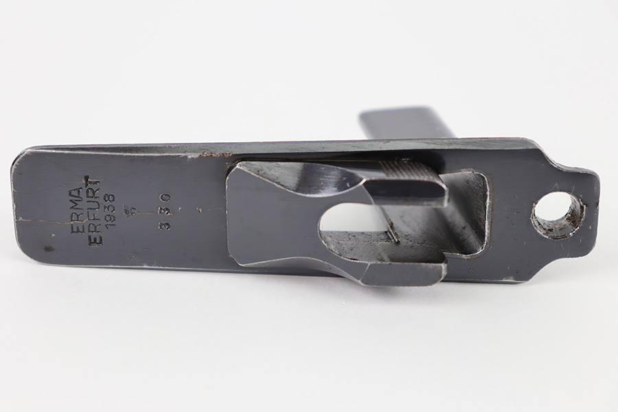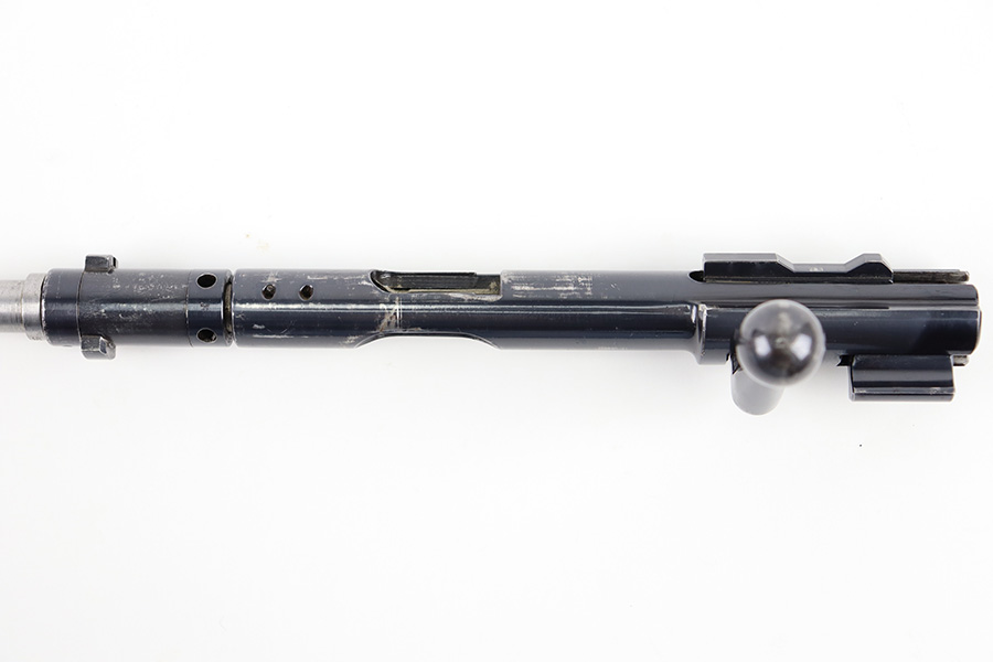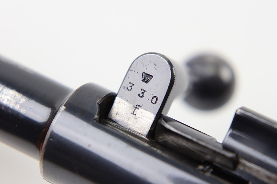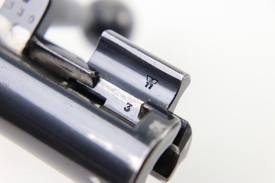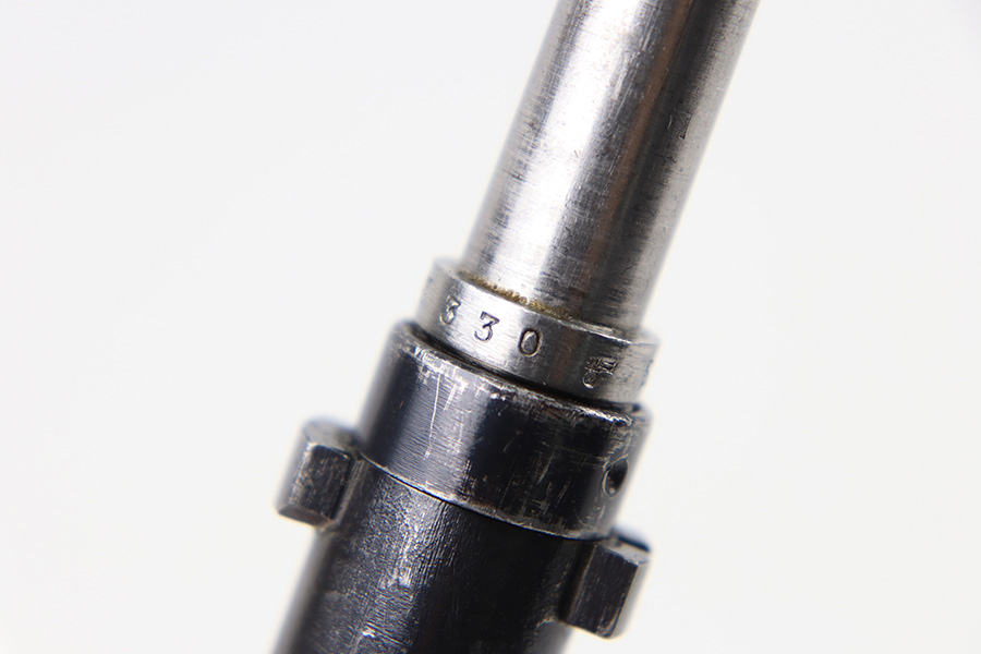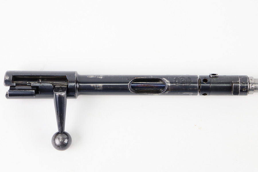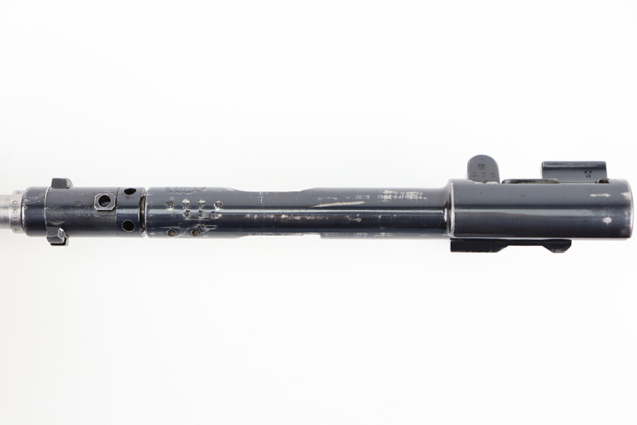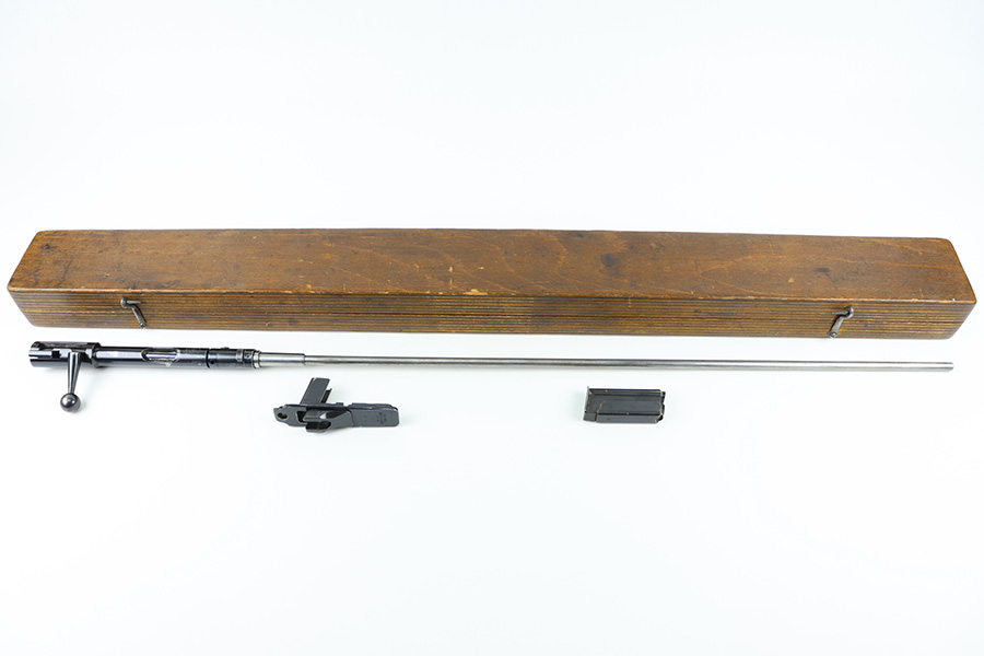 10/24/23 – This is an excellent condition, all matching and original K98 conversion kit by Erma Erfurt. This kit was made in 1938, and converts any K98 into a .22 caliber target rifle. The barrel, receiver, and bolt assembly is all matching serial numbered, as is the original baseplate / magazine well attachment. The finish is excellent throughout, with most of the original blued finish intact. There’s some small areas of finish loss, but no rust or pitting anywhere on this kit. The barrel has a nice bore that’s shiny with strong rifling throughout, 9/10 overall because there’s traces of residue from previous use / cleaning (this would clean out easily). The only flaw is that one of the magazines is missing, so the kit is not 100% complete. Otherwise a beautiful example of a scarce conversion kit from WW2. The wood case measures 33.5 inches long.
