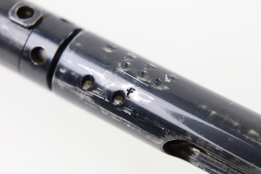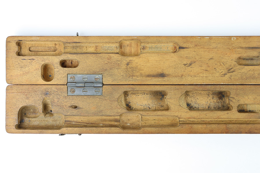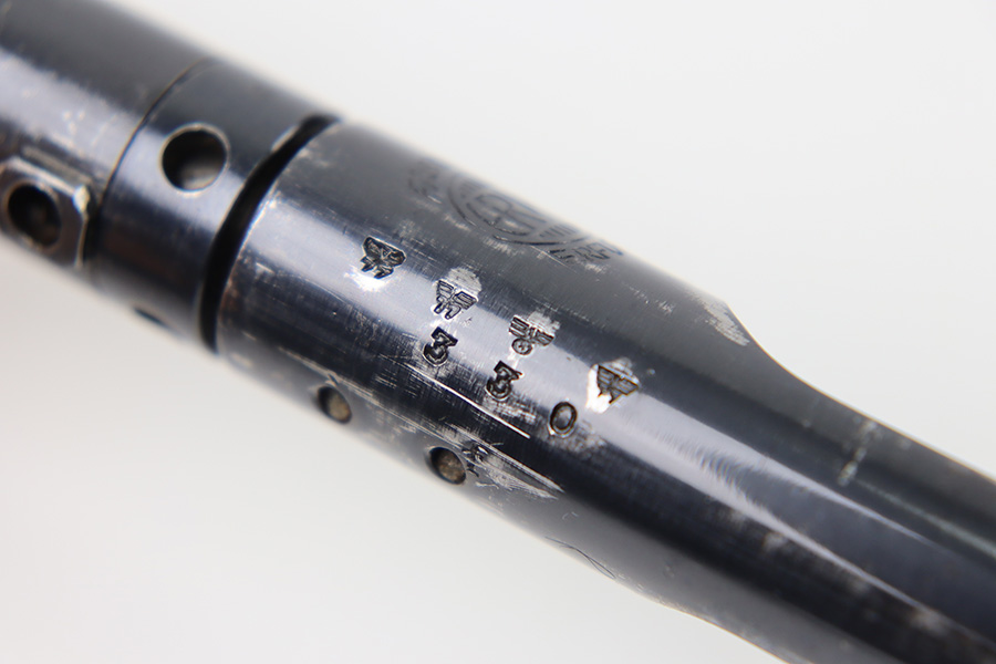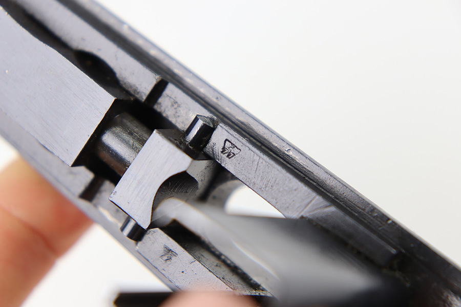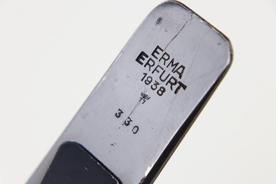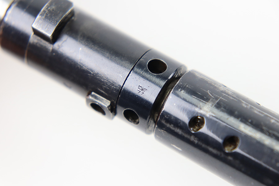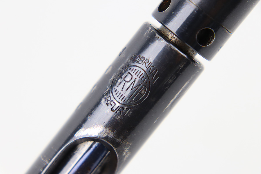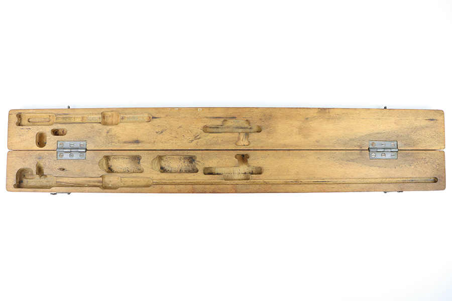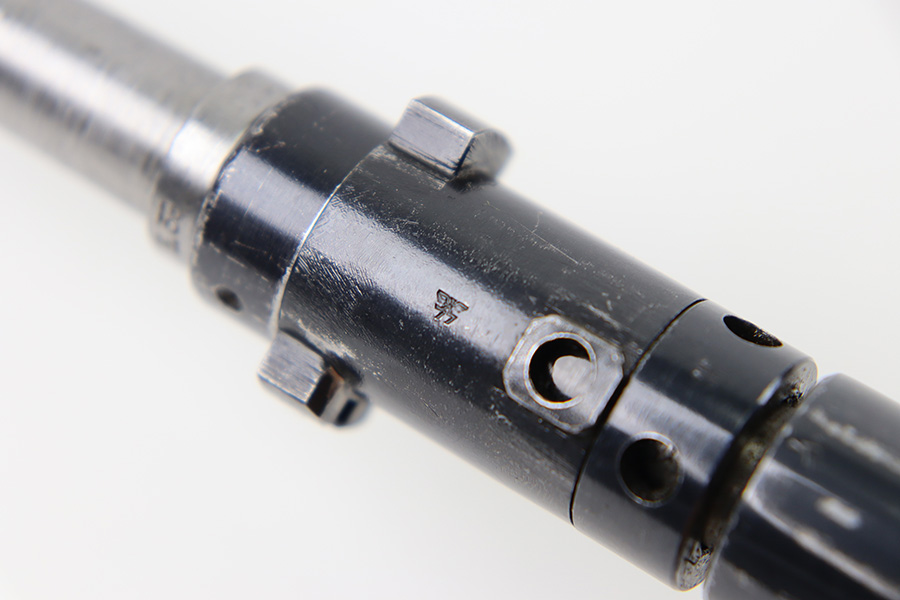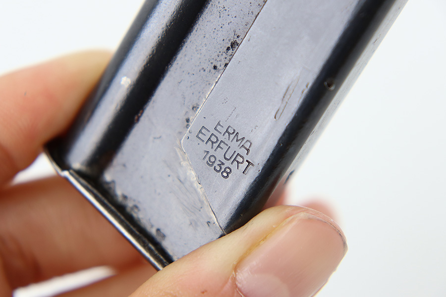 10/24/23 – This is an excellent condition, all matching and original K98 conversion kit by Erma Erfurt. This kit was made in 1938, and converts any K98 into a .22 caliber target rifle. The barrel, receiver, and bolt assembly is all matching serial numbered, as is the original baseplate / magazine well attachment. The finish is excellent throughout, with most of the original blued finish intact. There’s some small areas of finish loss, but no rust or pitting anywhere on this kit. The barrel has a nice bore that’s shiny with strong rifling throughout, 9/10 overall because there’s traces of residue from previous use / cleaning (this would clean out easily). The only flaw is that one of the magazines is missing, so the kit is not 100% complete. Otherwise a beautiful example of a scarce conversion kit from WW2. The wood case measures 33.5 inches long.