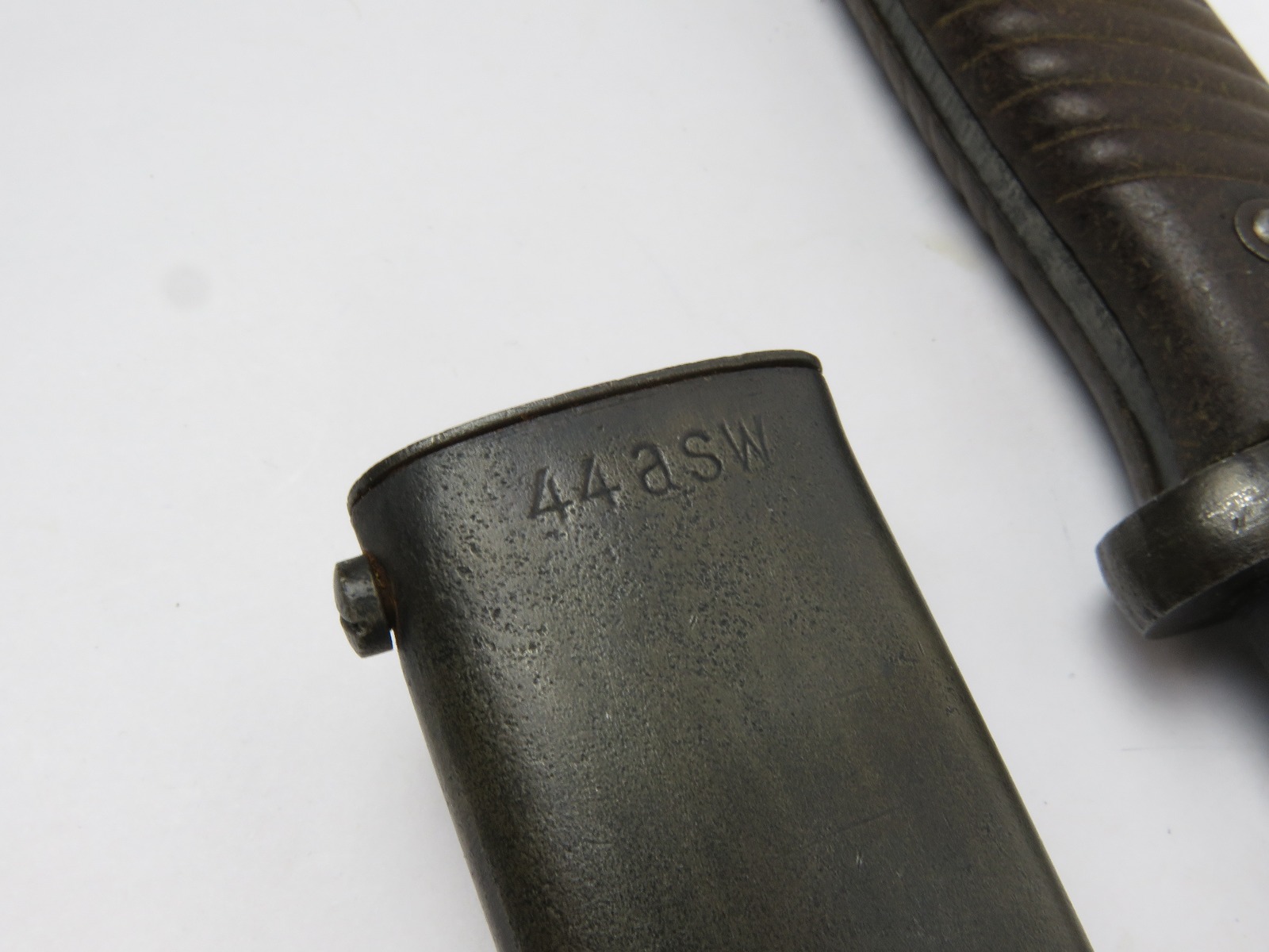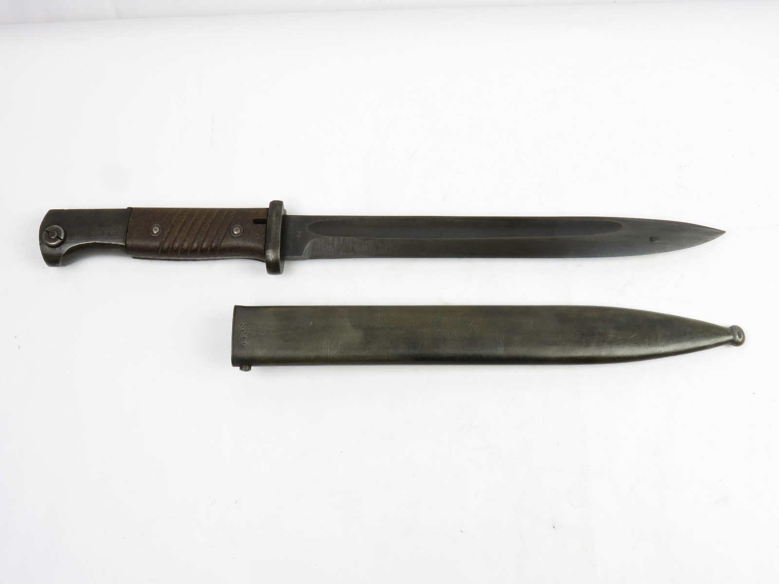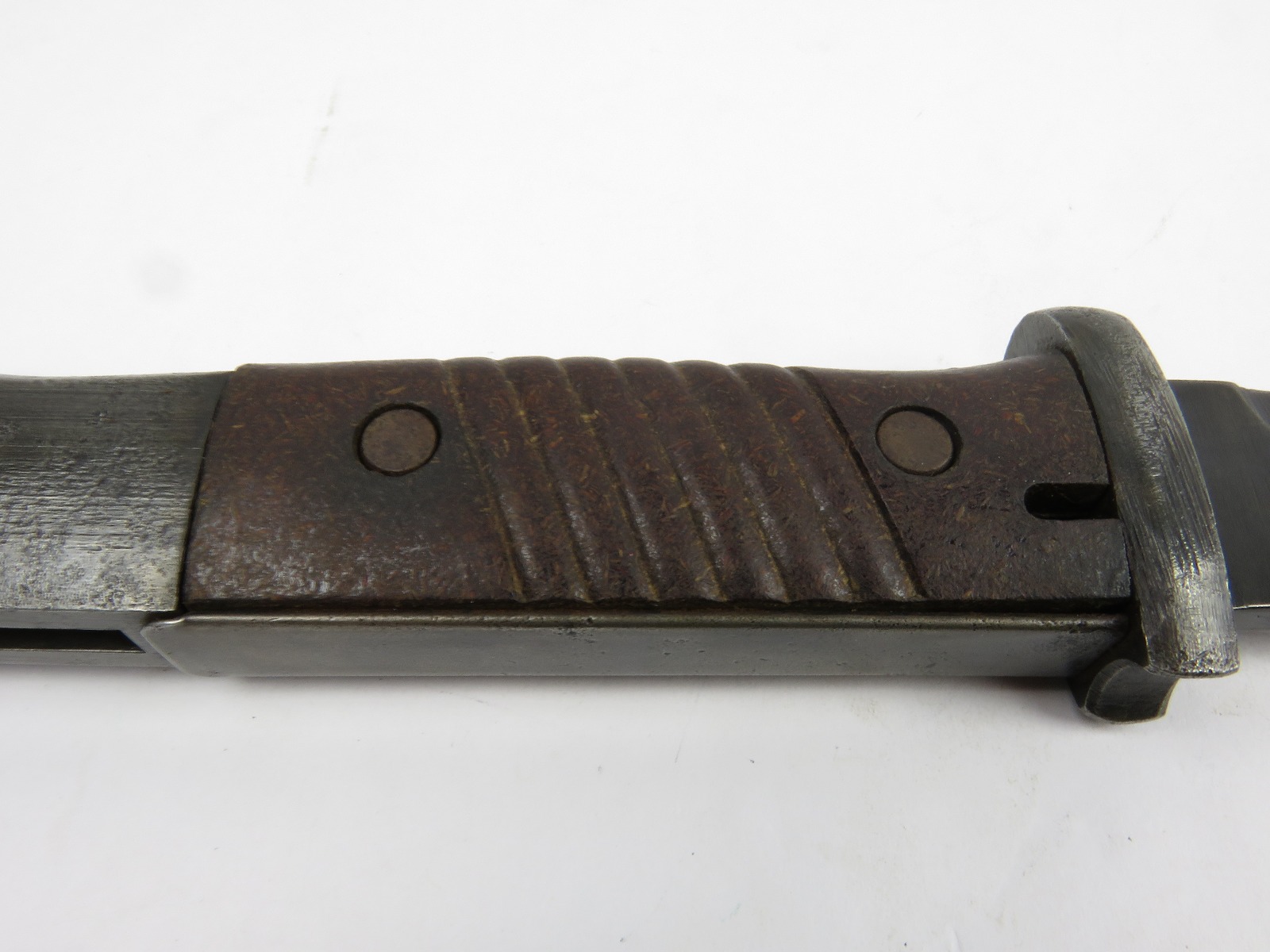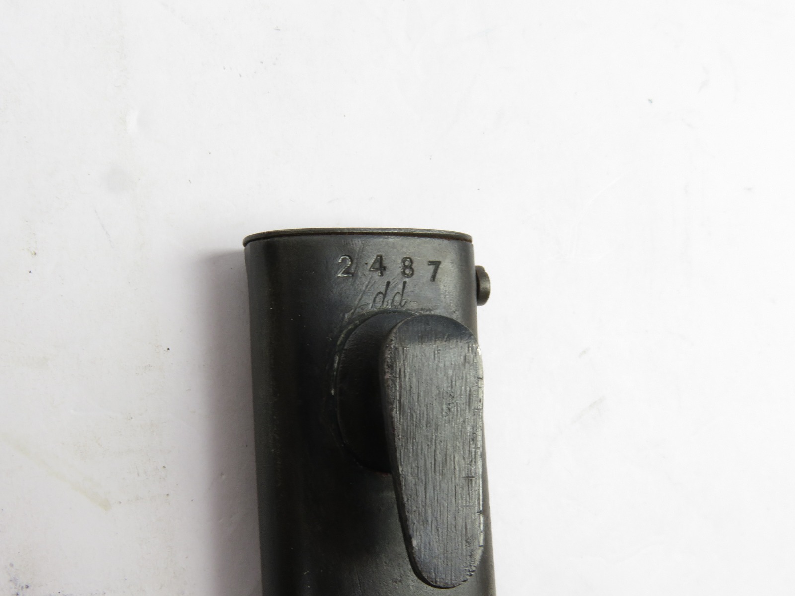 12/15/17 – This is an original late WW2 production Mauser K98 bayonet. The bayonet has a “44” date stamp on both the blade and scabbard, and the handle is riveted in place, which is a late war production method. The top of the handle has a waffen proof stamp. The blade and scabbard are matching serial numbered “2487 dd”, and are both stamped “44asw” on the reverse side. The blade is in great shape with no major flaws, and the scabbard is completely original. There is some light scratching on the blade and the scabbard, but overall this is in great condition.