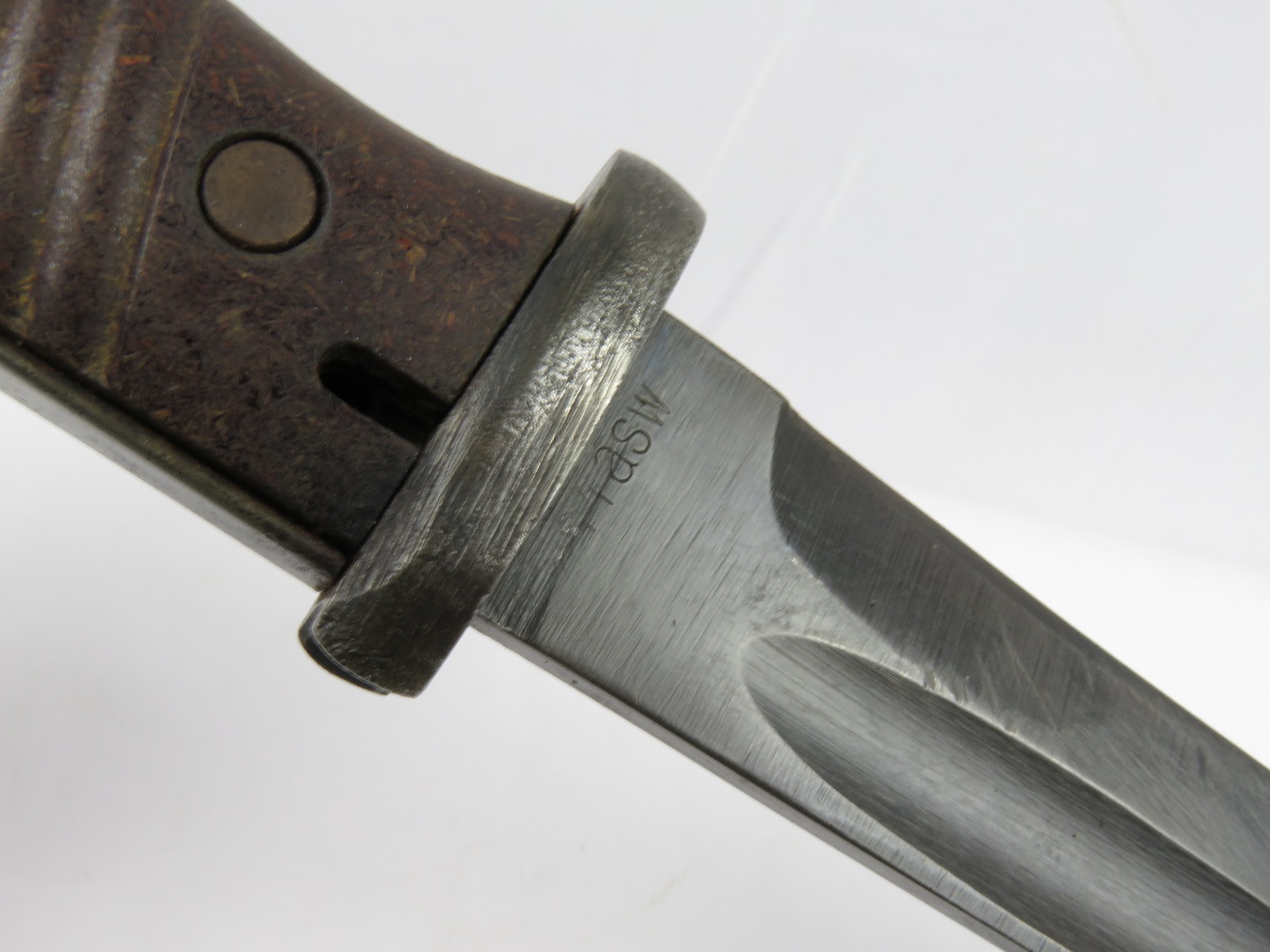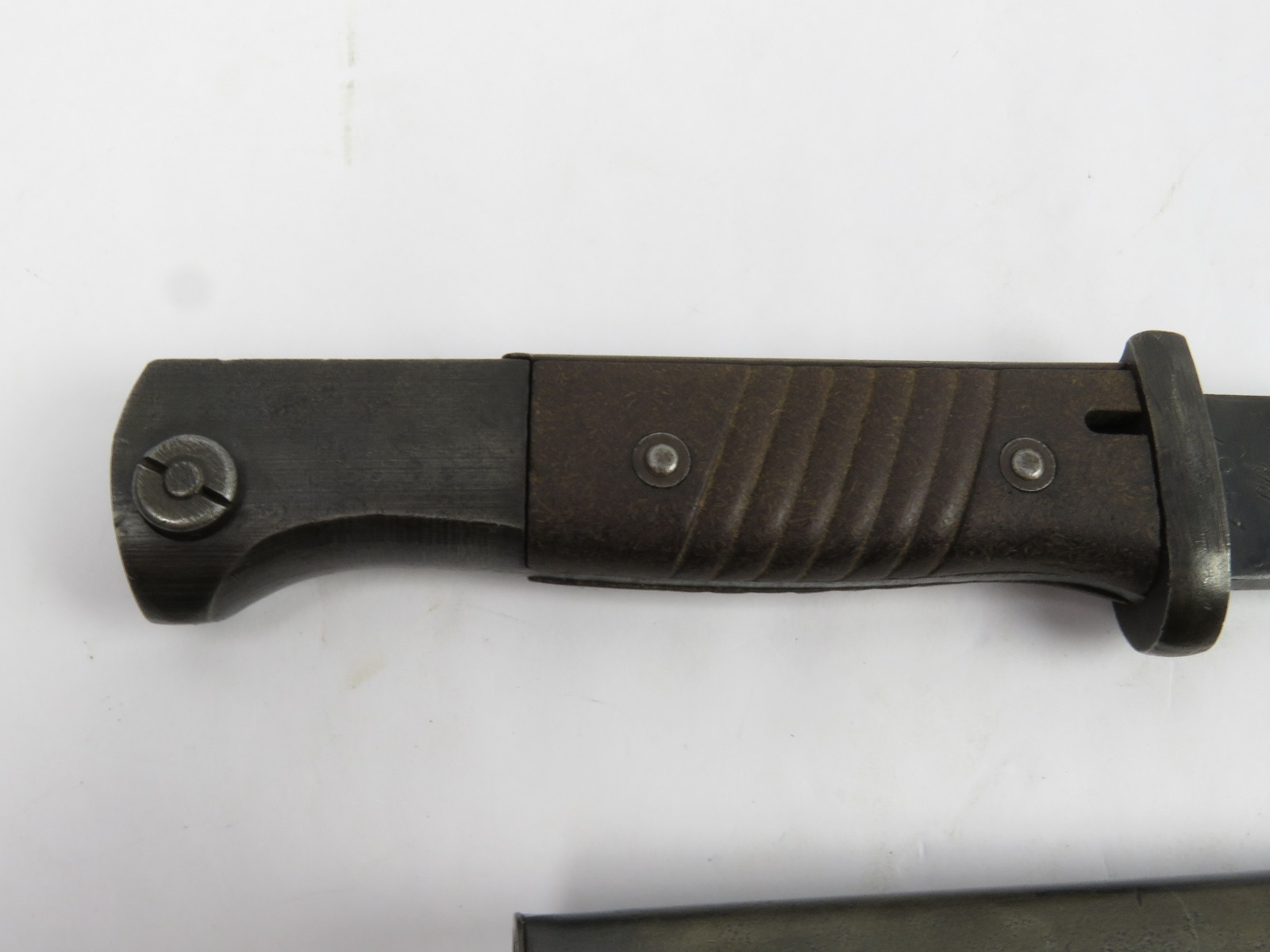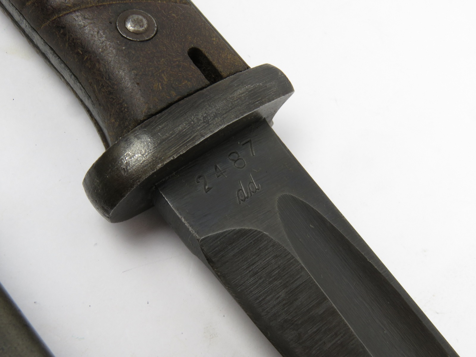 12/15/17 – This is an original late WW2 production Mauser K98 bayonet. The bayonet has a “44” date stamp on both the blade and scabbard, and the handle is riveted in place, which is a late war production method. The top of the handle has a waffen proof stamp. The blade and scabbard are matching serial numbered “2487 dd”, and are both stamped “44asw” on the reverse side. The blade is in great shape with no major flaws, and the scabbard is completely original. There is some light scratching on the blade and the scabbard, but overall this is in great condition.