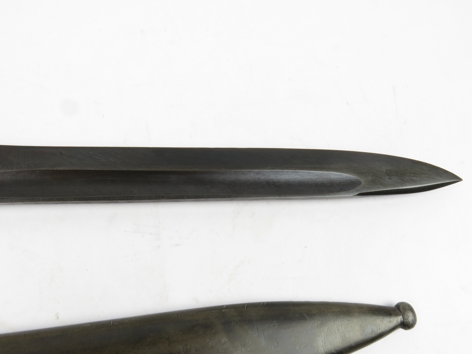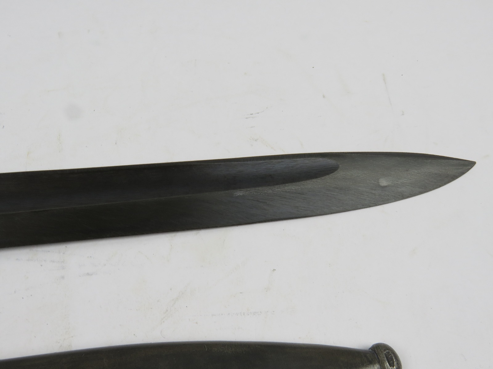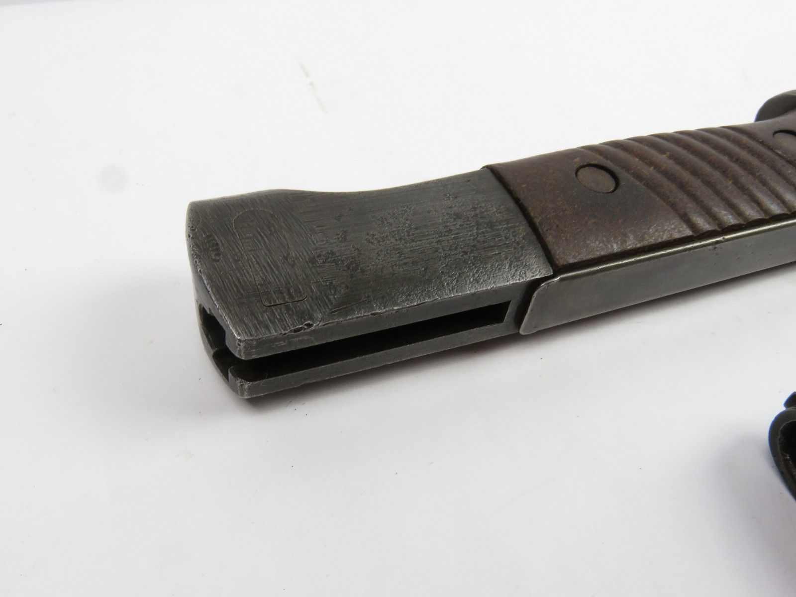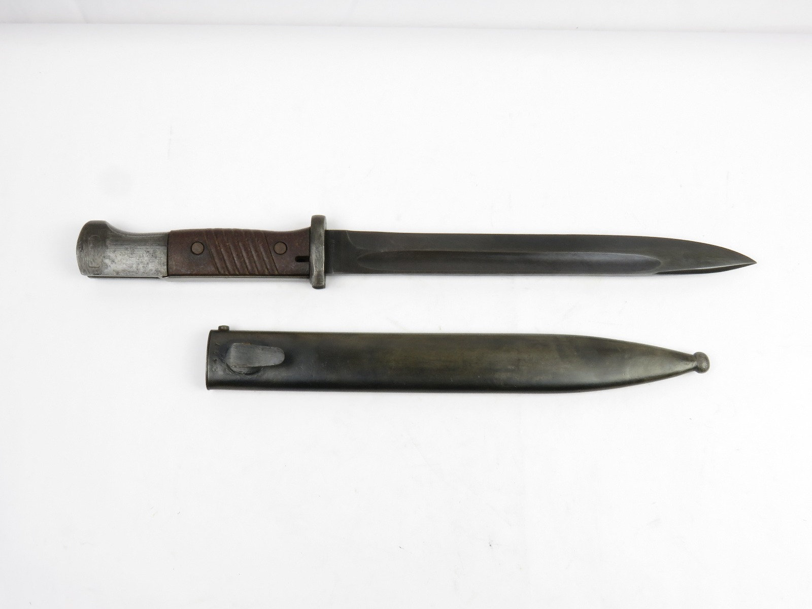 12/15/17 – This is an original late WW2 production Mauser K98 bayonet. The bayonet has a “44” date stamp on both the blade and scabbard, and the handle is riveted in place, which is a late war production method. The top of the handle has a waffen proof stamp. The blade and scabbard are matching serial numbered “2487 dd”, and are both stamped “44asw” on the reverse side. The blade is in great shape with no major flaws, and the scabbard is completely original. There is some light scratching on the blade and the scabbard, but overall this is in great condition.
