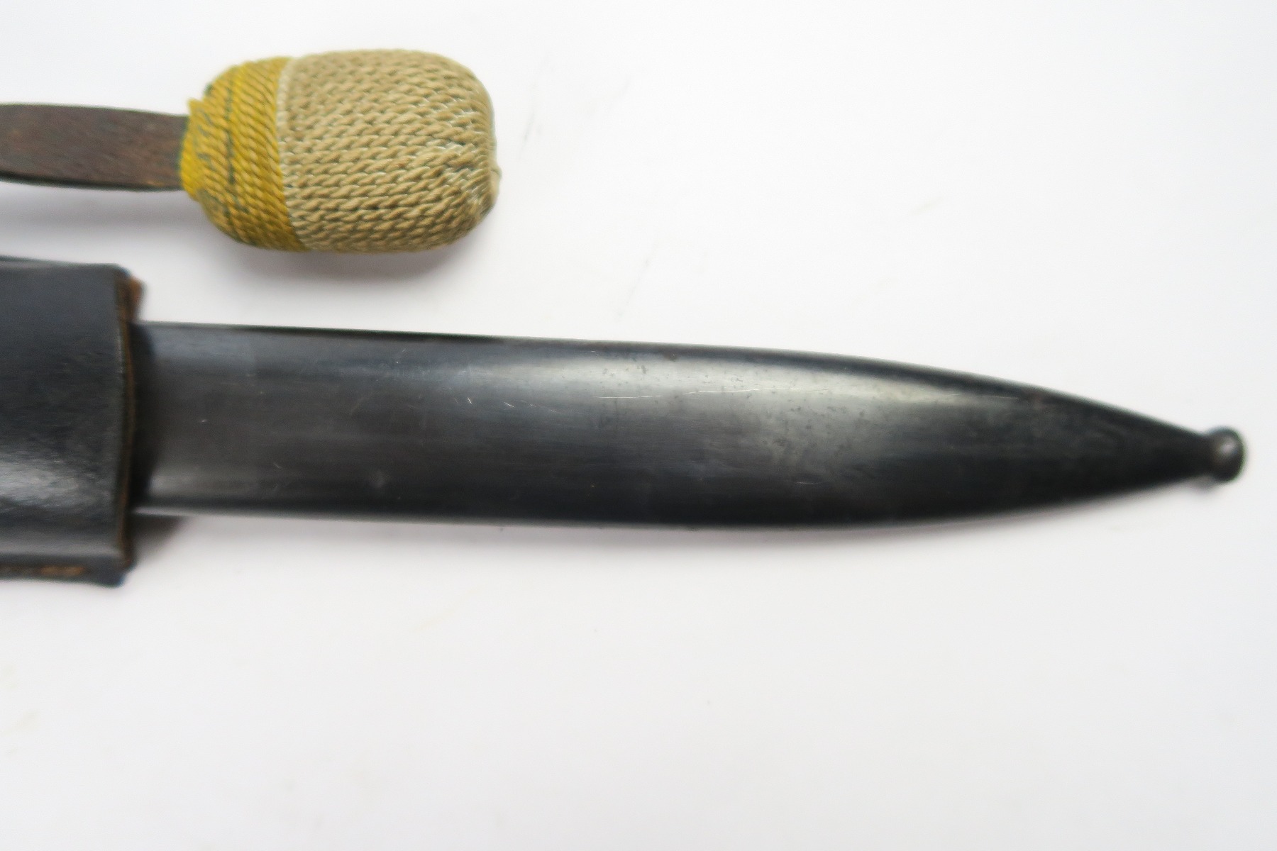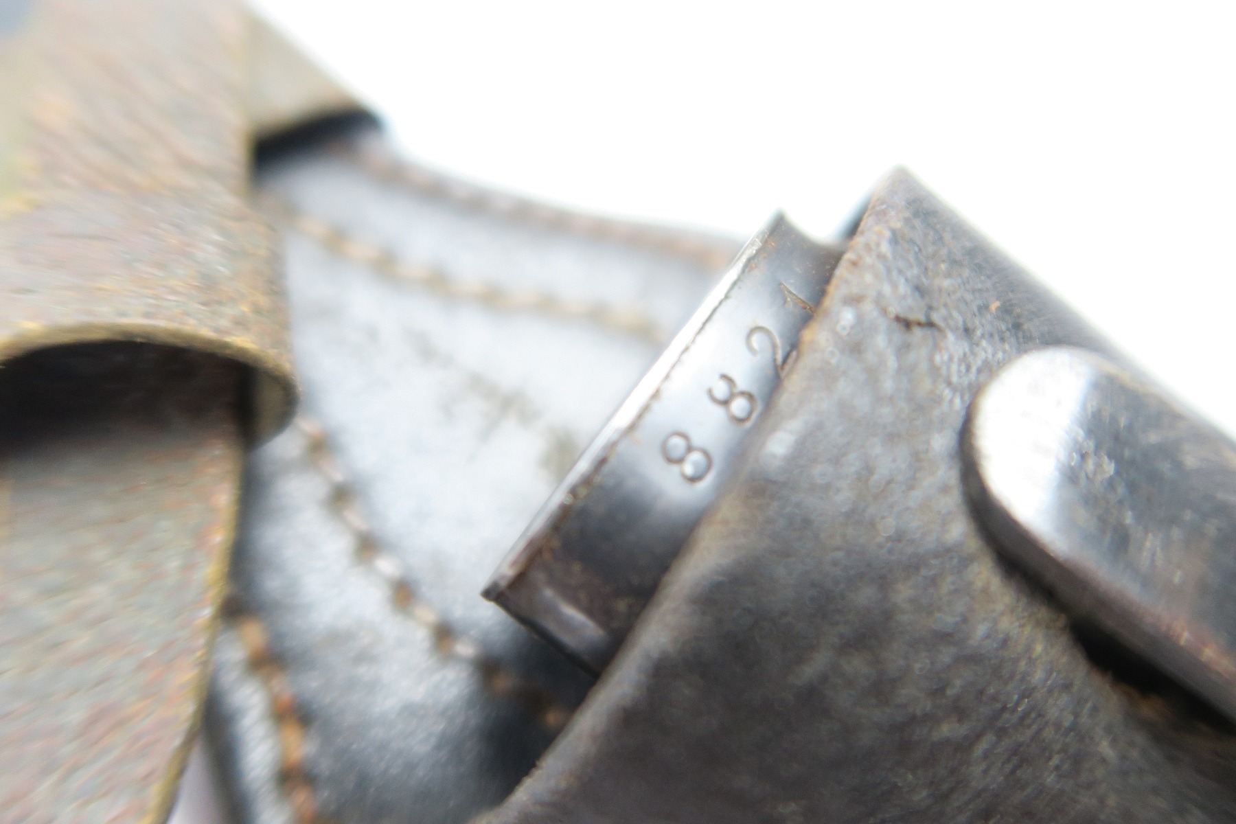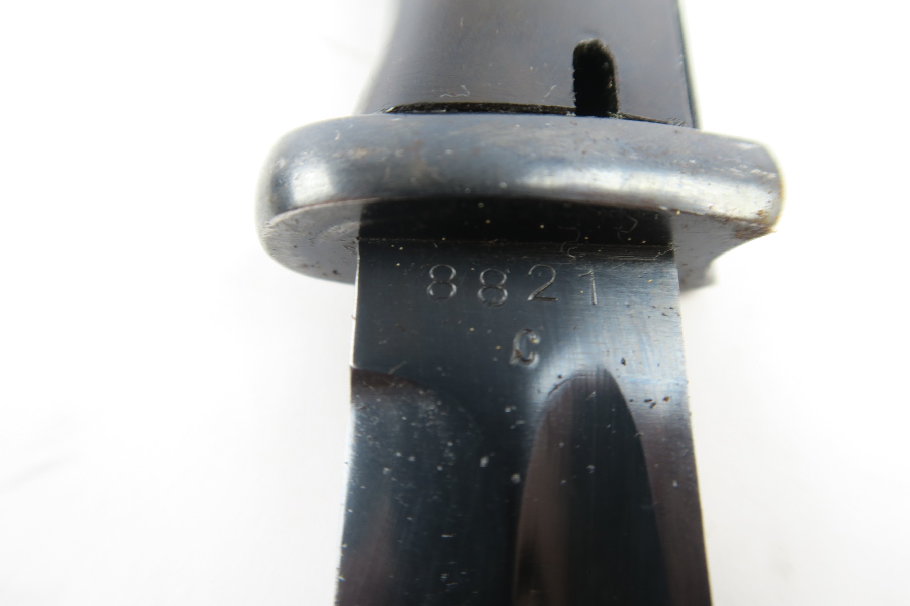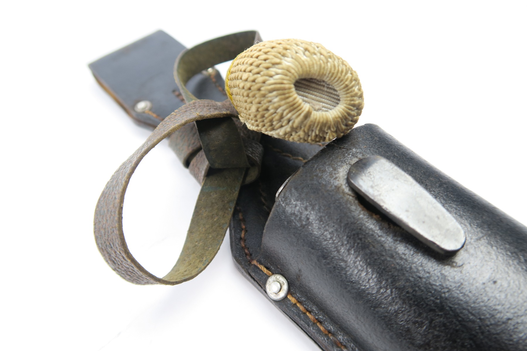 5/2/18 – This is an original K98 bayonet, all matching and complete with original scabbard, leather frog (dated 1941), and portepee. The bayonet handle is waffen WaA253 proof stamped with excellent original bluing and no cracks or chips in the bakelite. The blade is beautifully blued as well with “8821 c” serial number and a maker stamp on the reverse side. The scabbard is similarly excellent and serial numbered to match. The portepee is attached by a leather strap and is in great condition with minimal wear and some fading of the original yellow and white colors. Guaranteed all original.