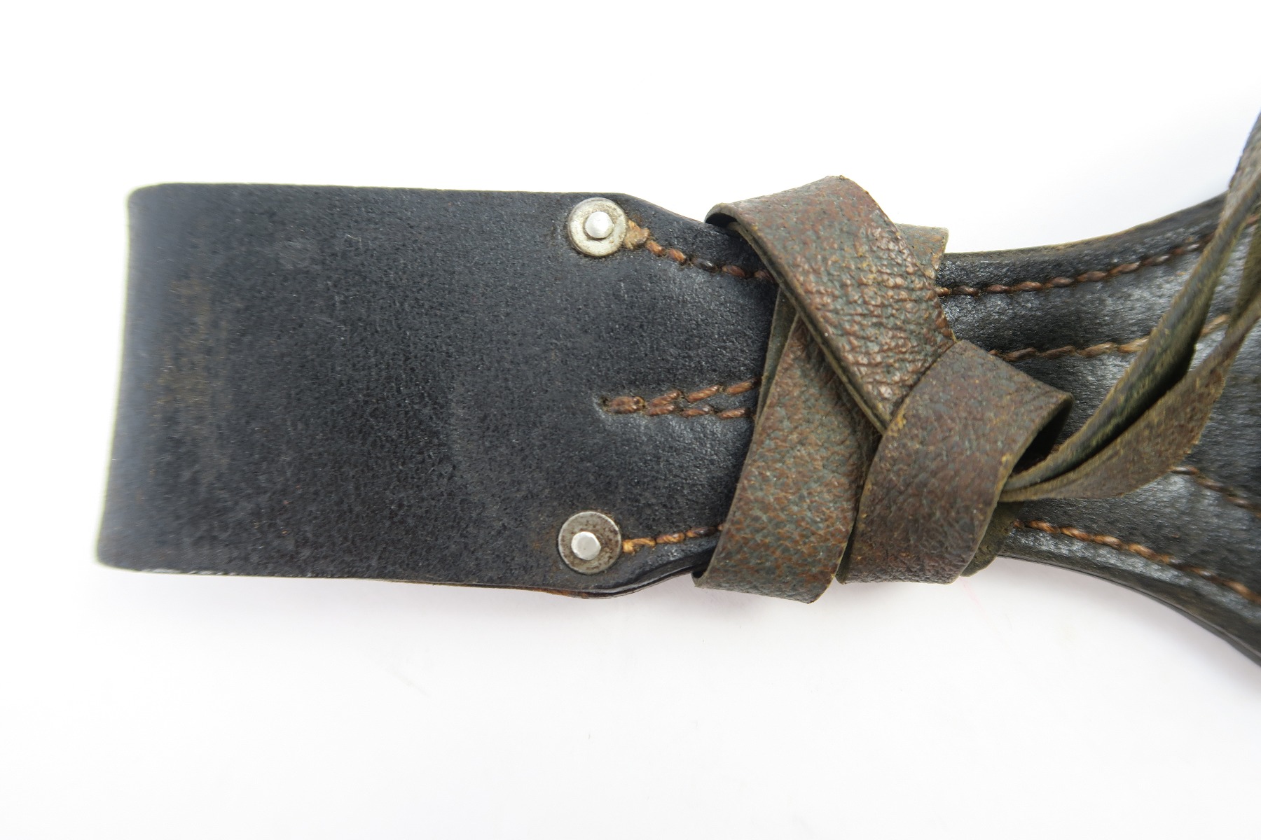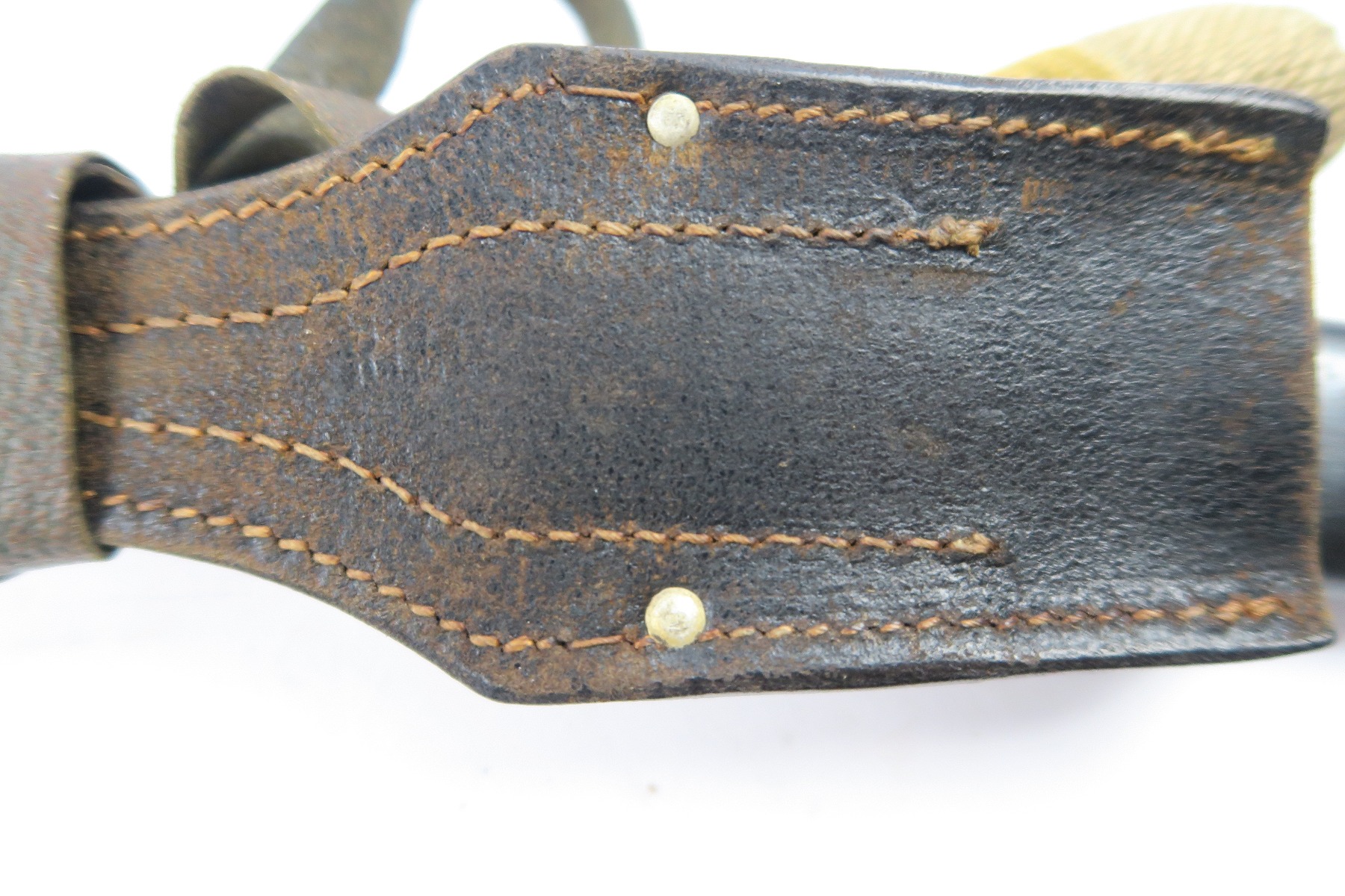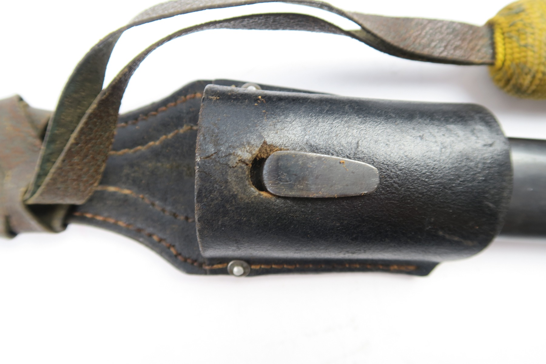 5/2/18 – This is an original K98 bayonet, all matching and complete with original scabbard, leather frog (dated 1941), and portepee. The bayonet handle is waffen WaA253 proof stamped with excellent original bluing and no cracks or chips in the bakelite. The blade is beautifully blued as well with “8821 c” serial number and a maker stamp on the reverse side. The scabbard is similarly excellent and serial numbered to match. The portepee is attached by a leather strap and is in great condition with minimal wear and some fading of the original yellow and white colors. Guaranteed all original.