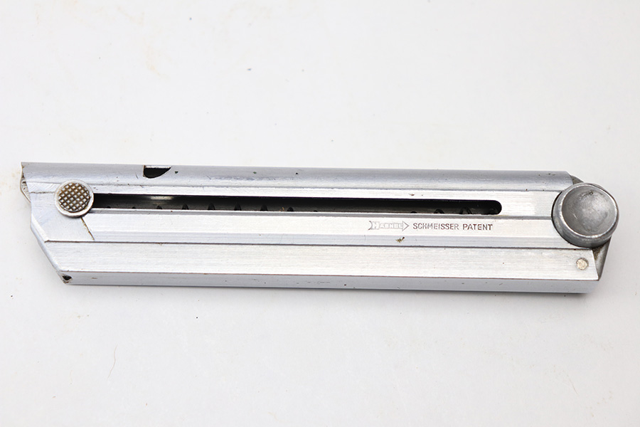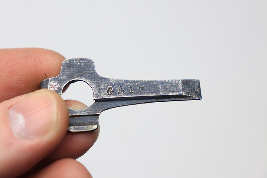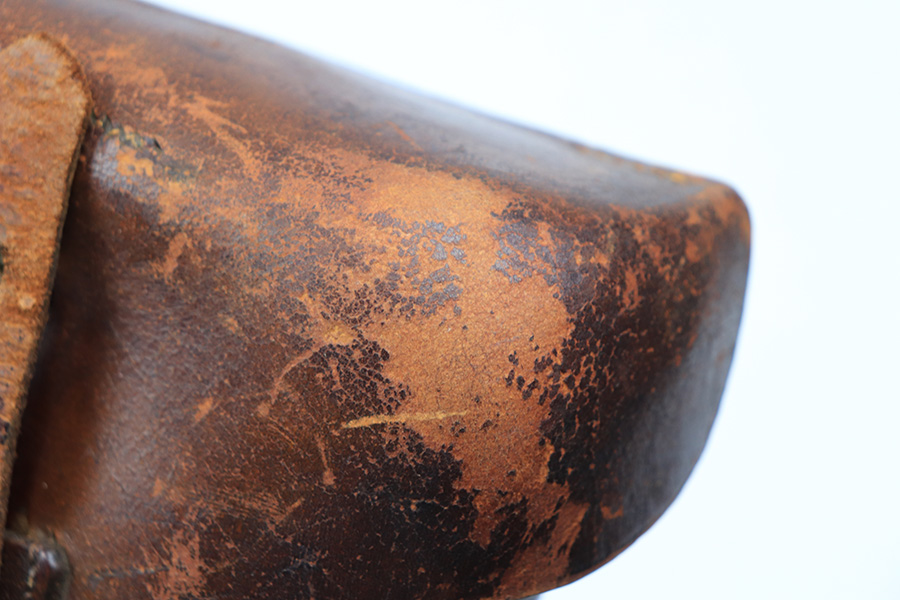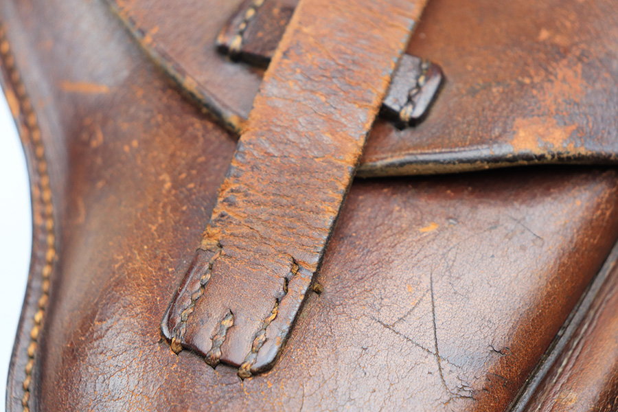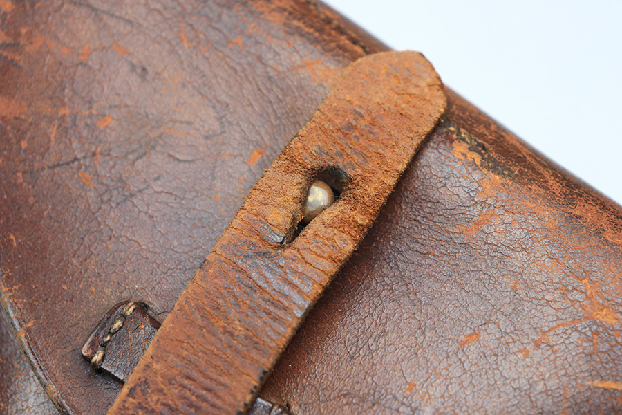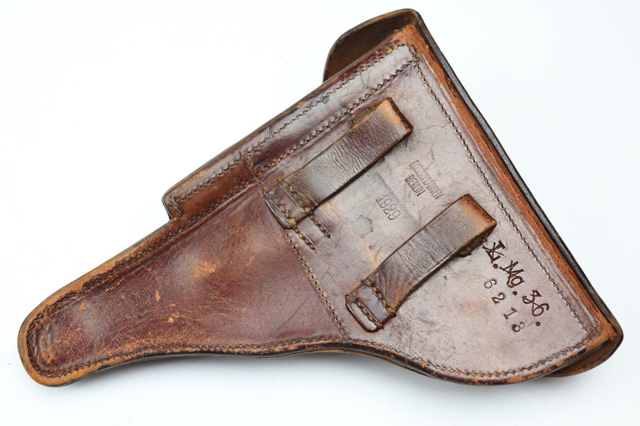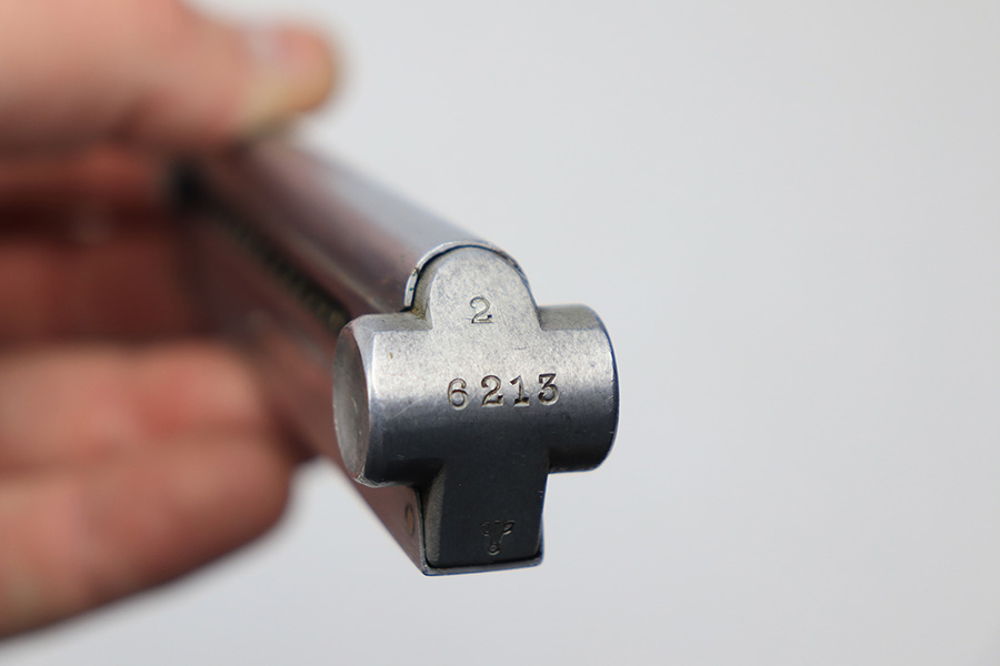 1/7/22 – This is an original police Luger holster with a matching numbered luger tool and spare police Haenel magazine. The back of the holster is maker stamped, dated, and police proof stamped. There’s also a unit stamp of some kind that has been crossed out, and the serial number “6213” has been stamped underneath. This number matches the number on the magazine and on the back of the tool. The holster has fair leather with some surface wear and scuffing throughout. All of this is surface wear and not very deep into the leather. The leather is pliable with typical signs of aging. No stitching issues. The tool is in great shape and the magazine is excellent.