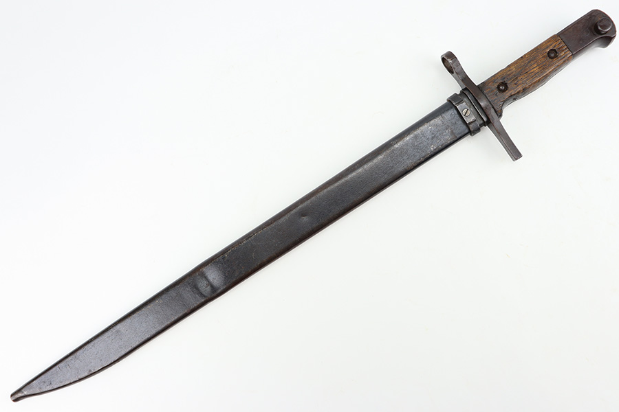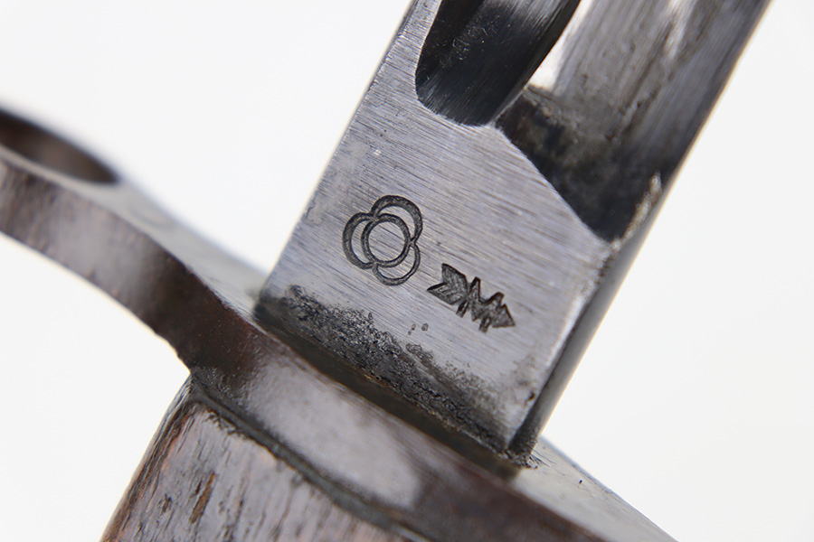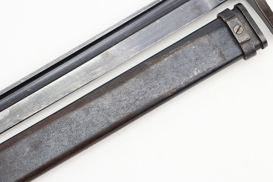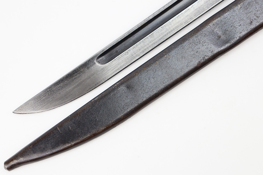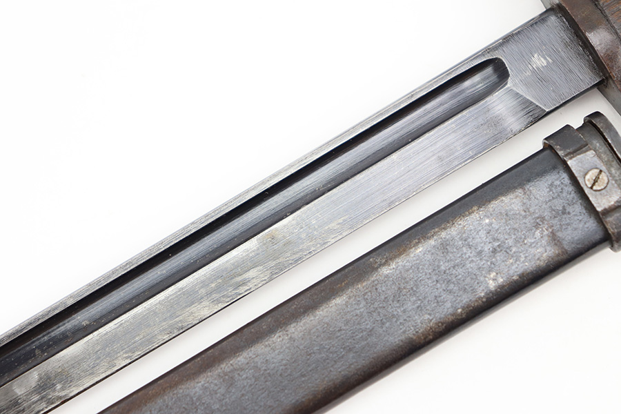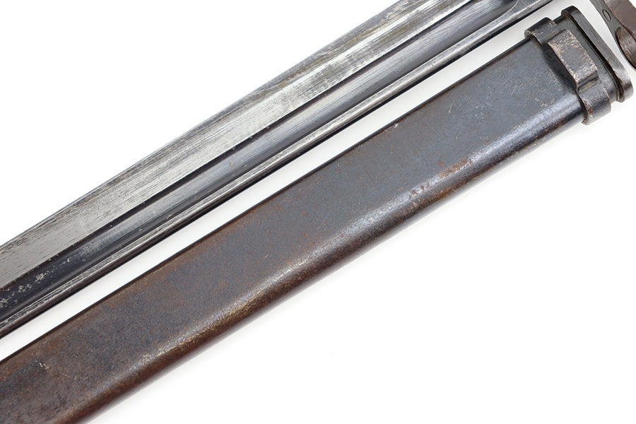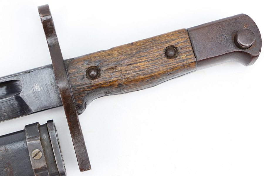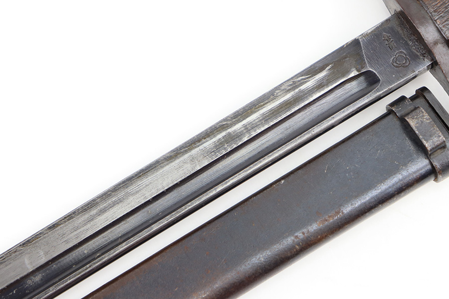 12/11/23 – This is an original WW2 Type 30 Japanese rifle bayonet. The bayonet is maker stamped on the base of the blade by Matsushita. The blade is blued and fullered with some original finish intact, and light surface wear throughout. The edge has some scratches and signs of sharpening. No rust or pitting on the blade. The hand guard is straight with a “O” marking under the muzzle ring (this is cited as a known variation in Labar’s book). The 2 piece contoured wood grips have 2 rivets and are in good condition. Bird’s head pommel is worn with dark patina but has a visible serial number on the top of the pommel. Comes with a metal scabbard that fits nicely despite a few dents. Known as a Variation H, LB 109 in Labar’s book.