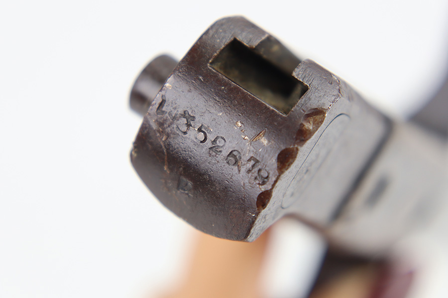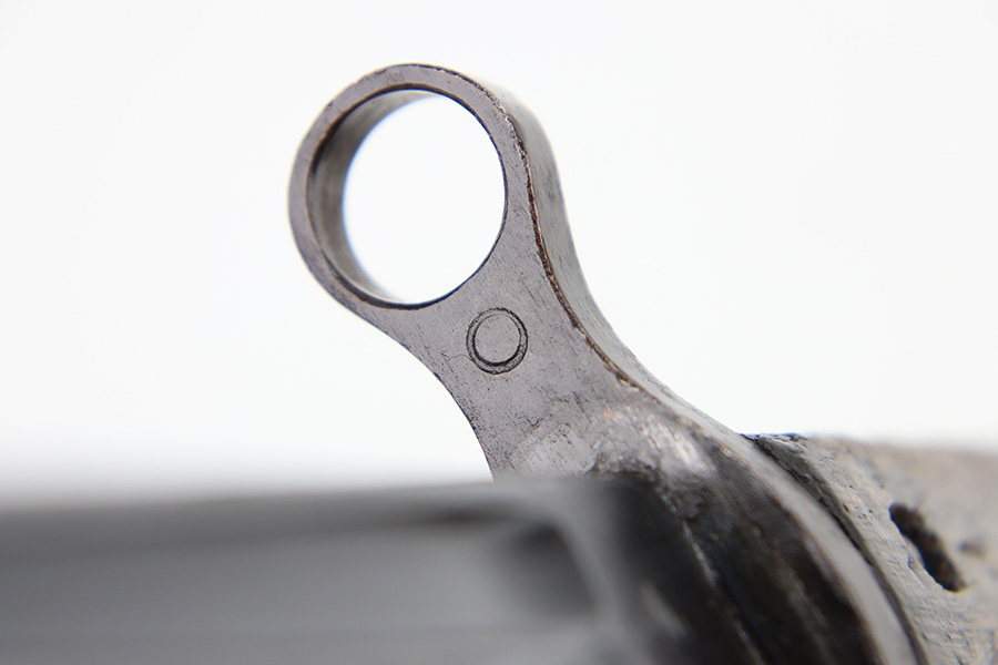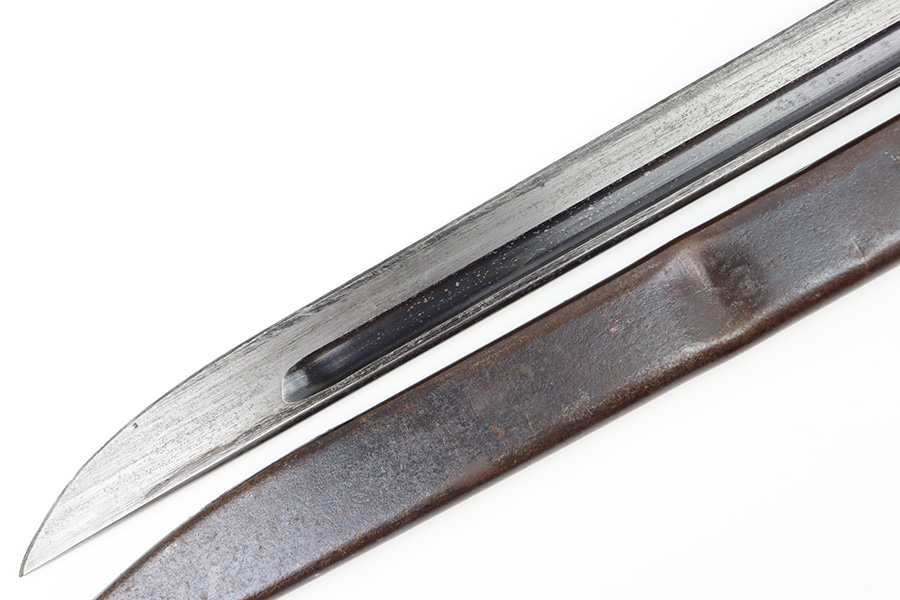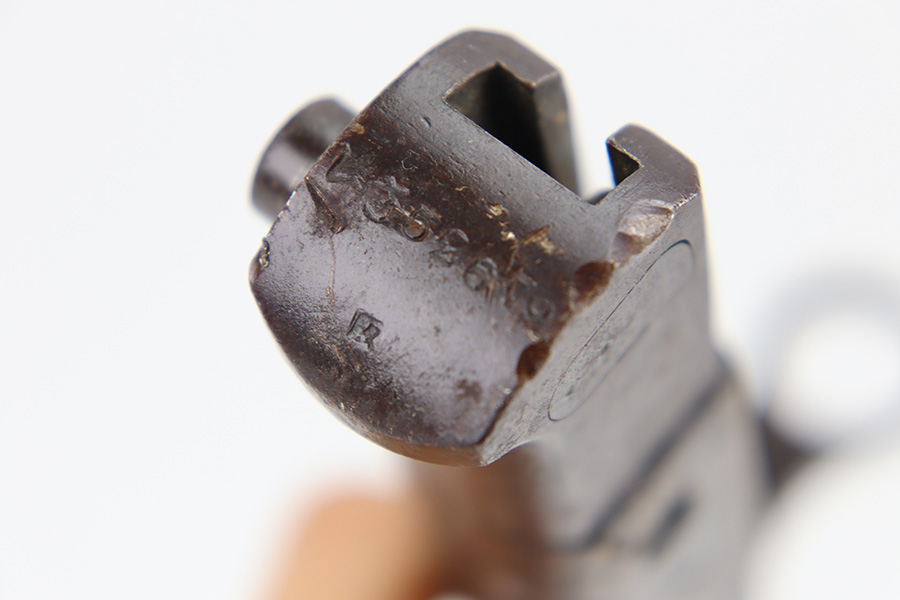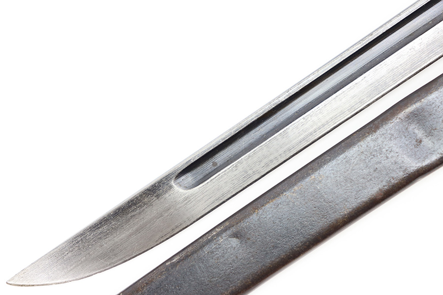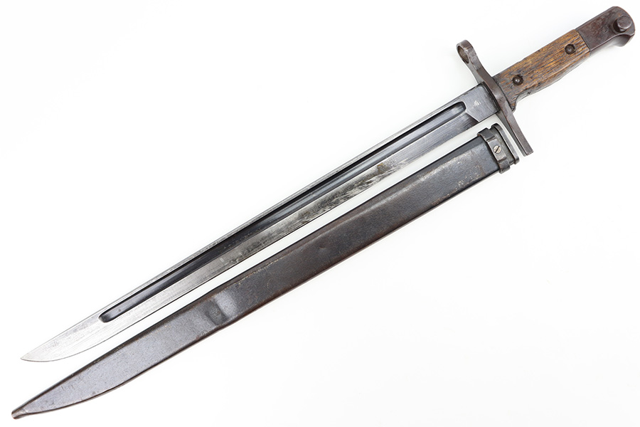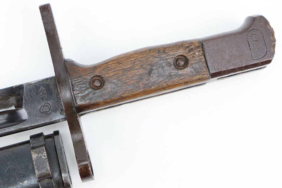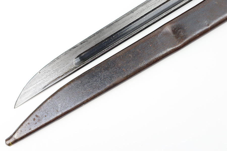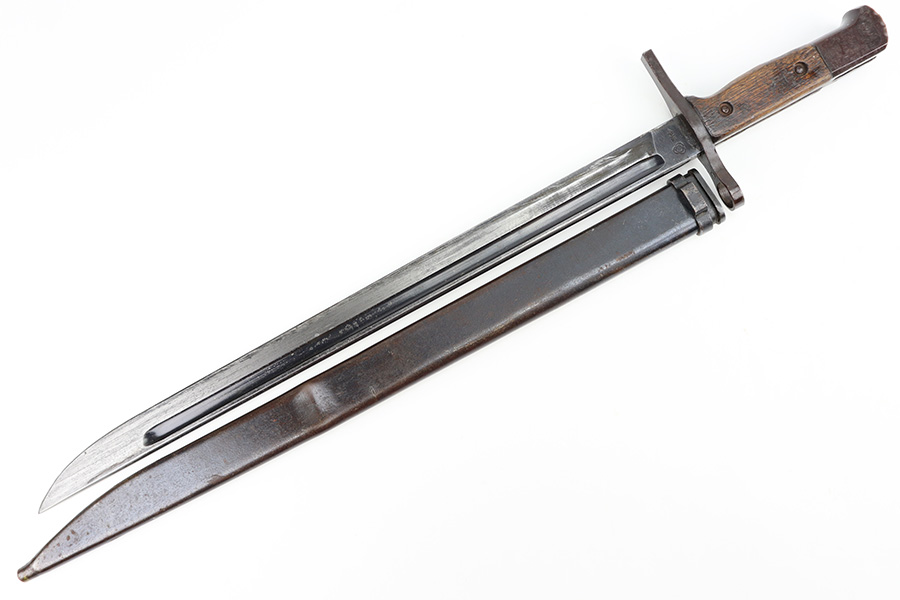 12/11/23 – This is an original WW2 Type 30 Japanese rifle bayonet. The bayonet is maker stamped on the base of the blade by Matsushita. The blade is blued and fullered with some original finish intact, and light surface wear throughout. The edge has some scratches and signs of sharpening. No rust or pitting on the blade. The hand guard is straight with a “O” marking under the muzzle ring (this is cited as a known variation in Labar’s book). The 2 piece contoured wood grips have 2 rivets and are in good condition. Bird’s head pommel is worn with dark patina but has a visible serial number on the top of the pommel. Comes with a metal scabbard that fits nicely despite a few dents. Known as a Variation H, LB 109 in Labar’s book.