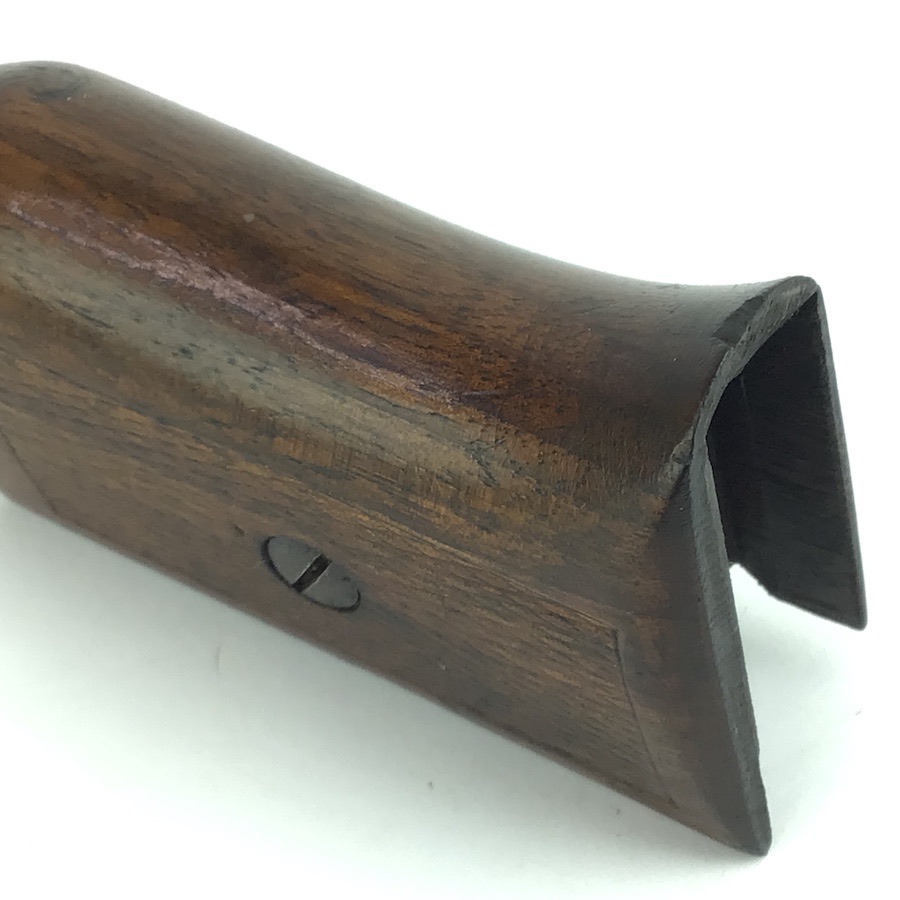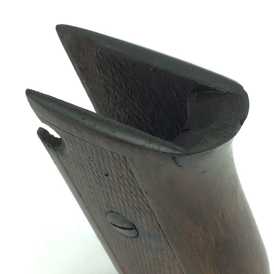 9/24/24 – This is an original WW1 era wood grip for a Mauser model 1910 or model 1914. The grip is intact with nice checkering and includes both screws. There’s one small chip near the top of the spine – shown in photos. Minor use wear.