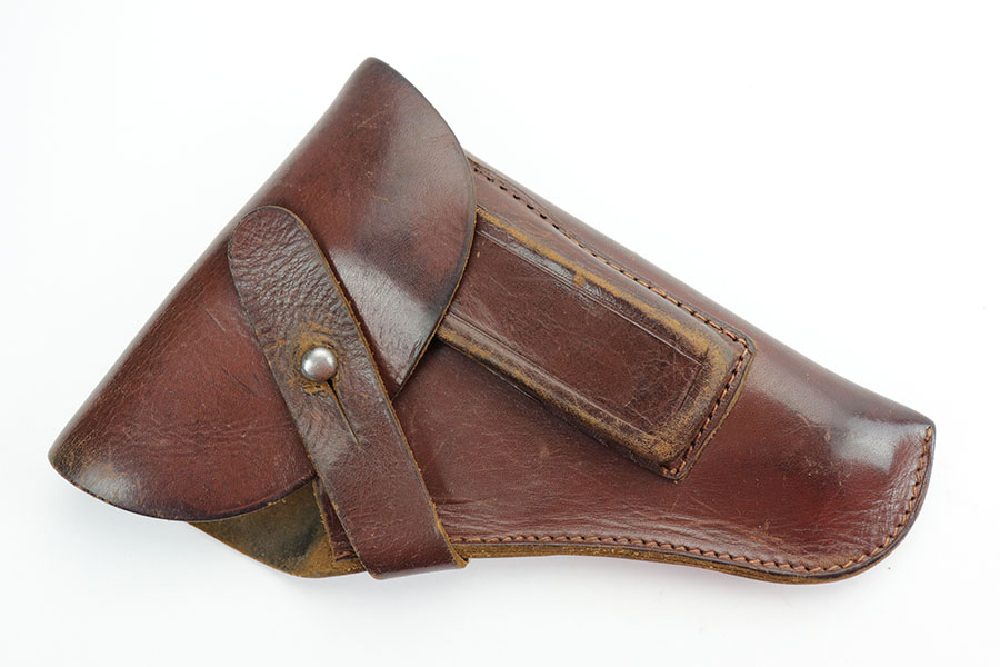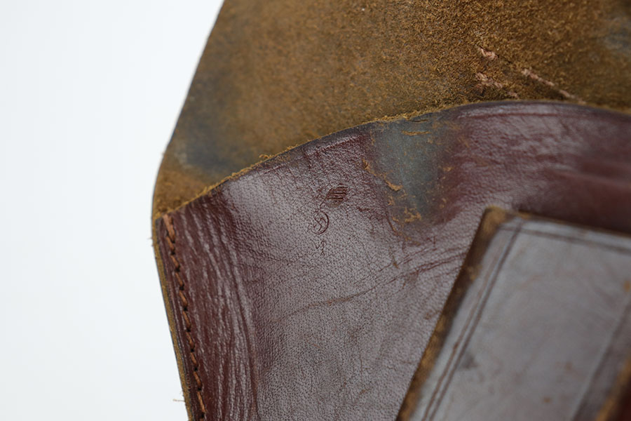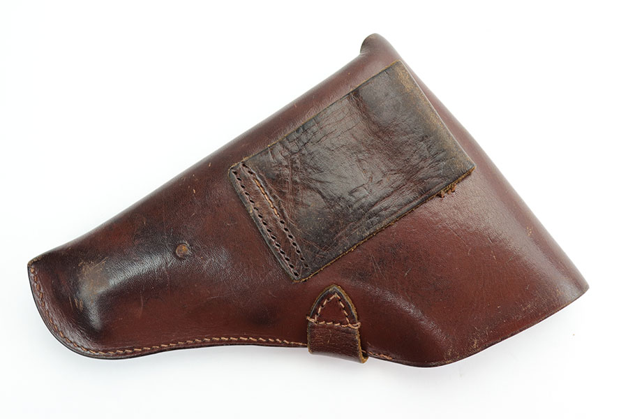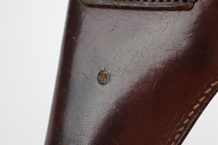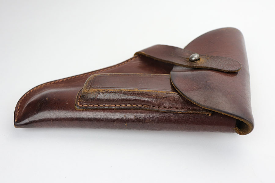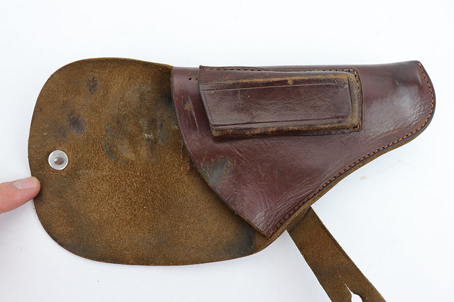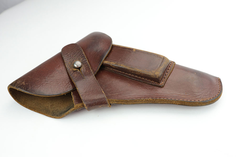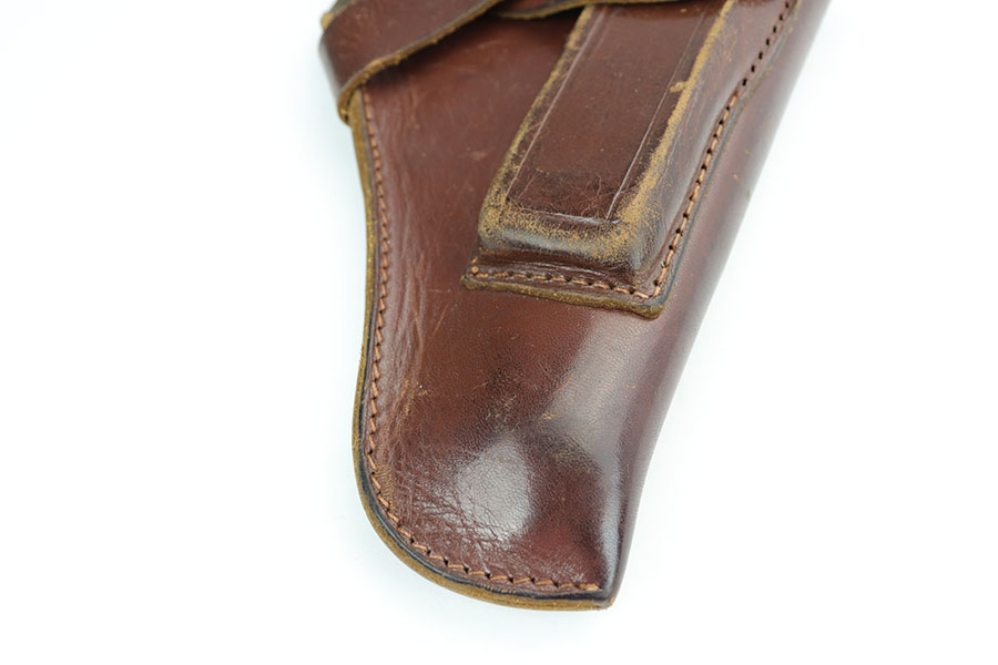 1/7/20 – This is an original Kriegsmarine issued holster, fitting for a Mauser model 1934 or Mauser model HSc pistol. The holster has a faint, yet visible Kriegsmarine eagle/M military proof stamp under the closure strap. The brown leather is in great overall condition despite some use wear and scuffing on the edges of the magazine pouch. The back leather shows a small circular stamp, which we believe was post-war stamped by someone who likely didn’t realize this was a rare holster. Priced has been reduced accordingly. All original stitching in tact.