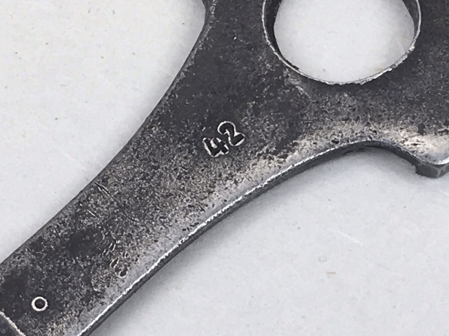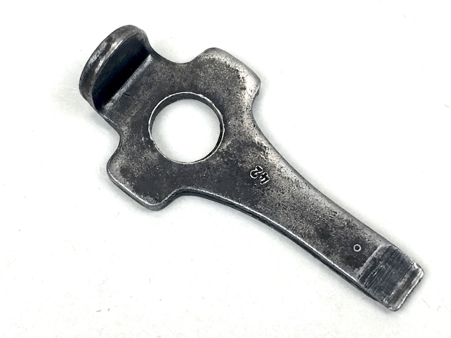 7/17/19 – This is an original WW2 era Mauser field replacement tool. This is a rare tool that was stamped “42” in the Mauser factory to be used as a field replacement for soldiers who lost or needed another tool on the battlefront. The tool has a distinct stamp on the front, and is in very good condition. There is no rust or pitting but typical use wear. Nice rare original tool for any P.08 Luger from 1938 on until 1945.