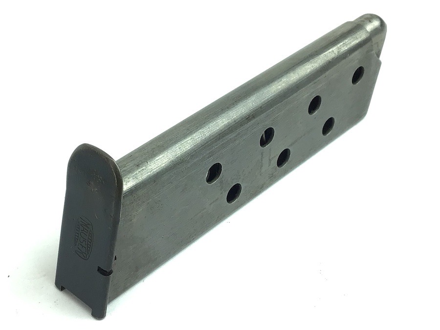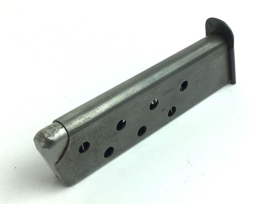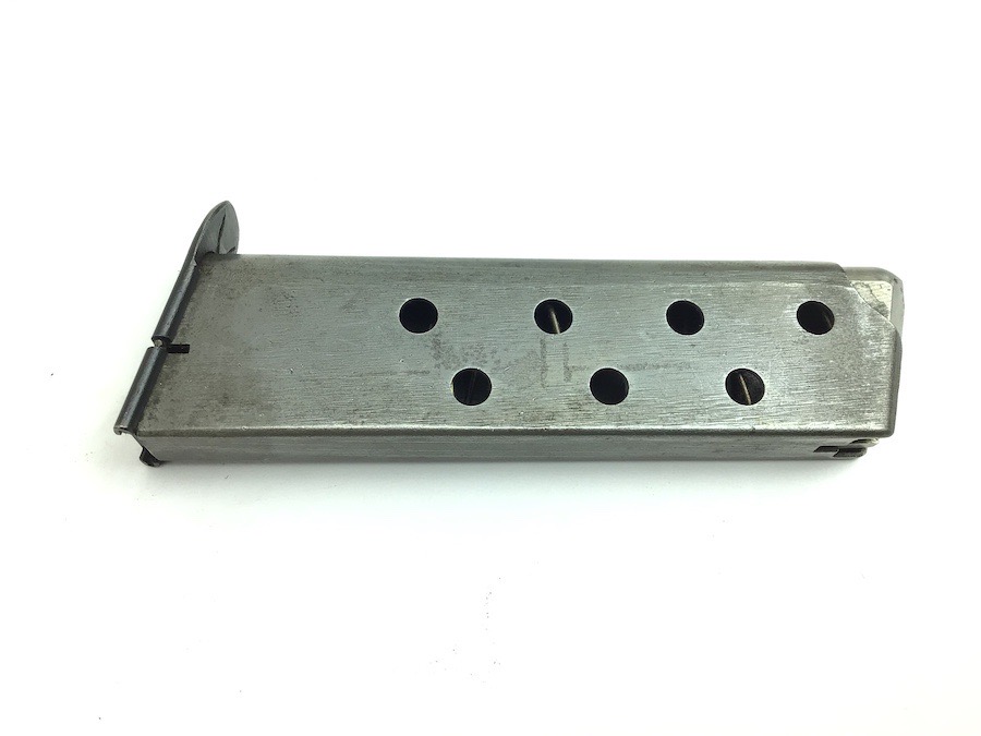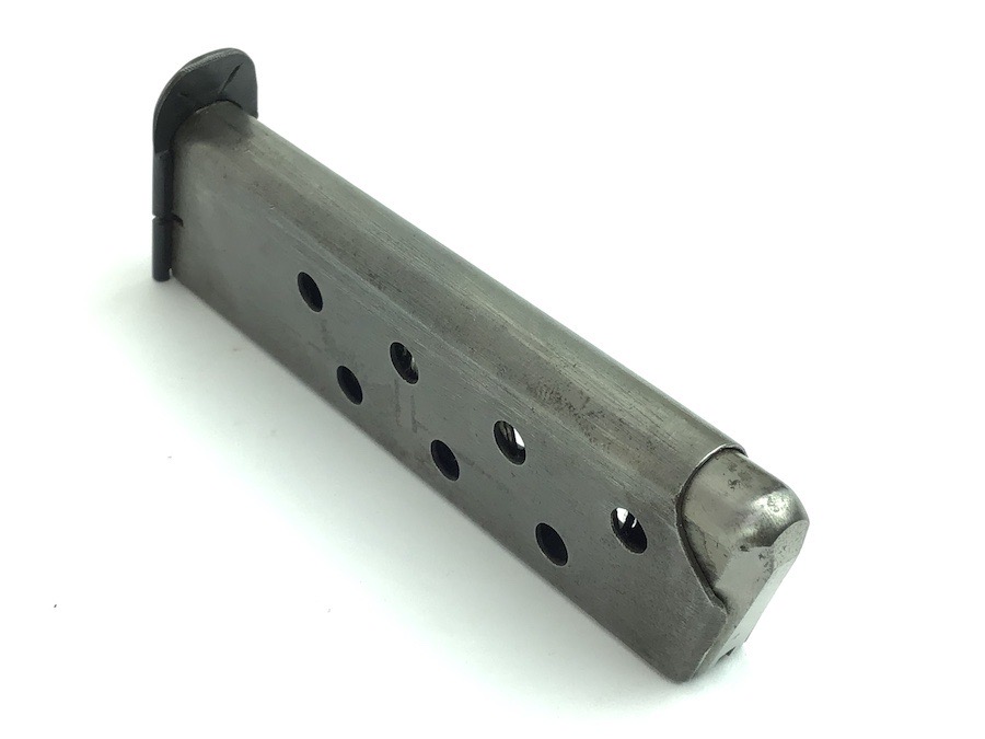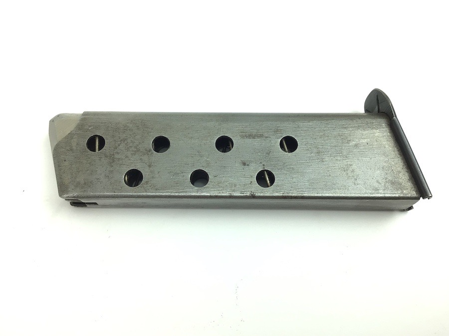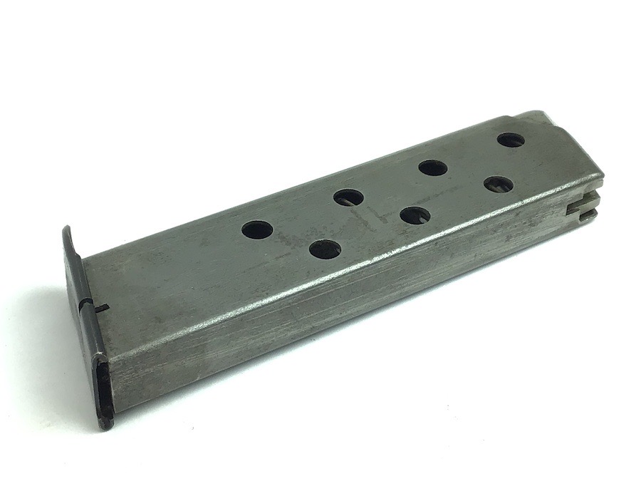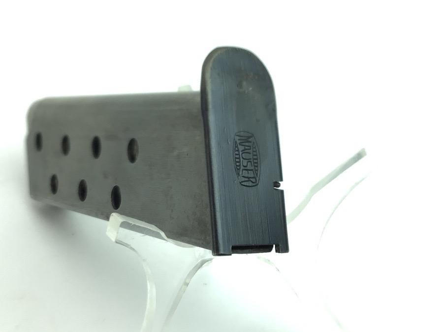 2/27/24 – Located in our Ohio office. Original, early WW2 production Mauser HSC pistol magazine. The magazine is in great overall condition with some light speckling patina on the tube and a small area of finish loss on the blued base. The base of the magazine is stamped with a Mauser banner logo. Minor distortion in the base plate. No other markings. Fully functional spring.