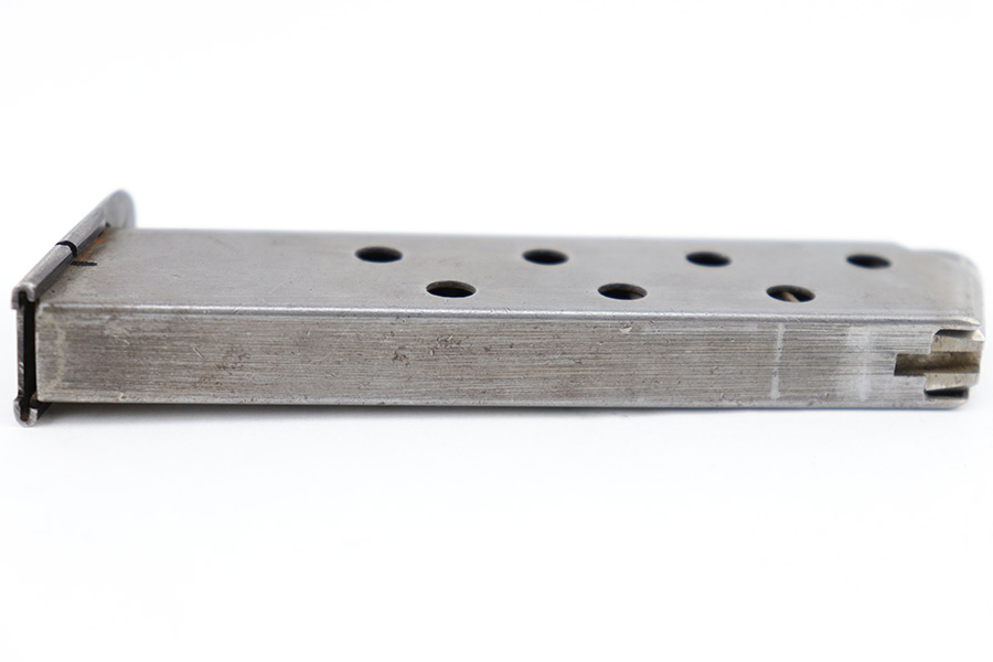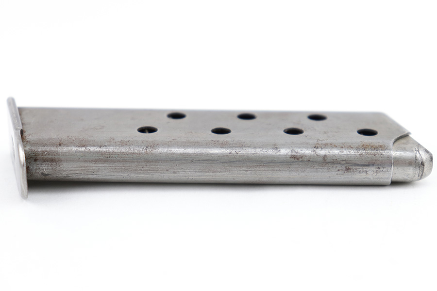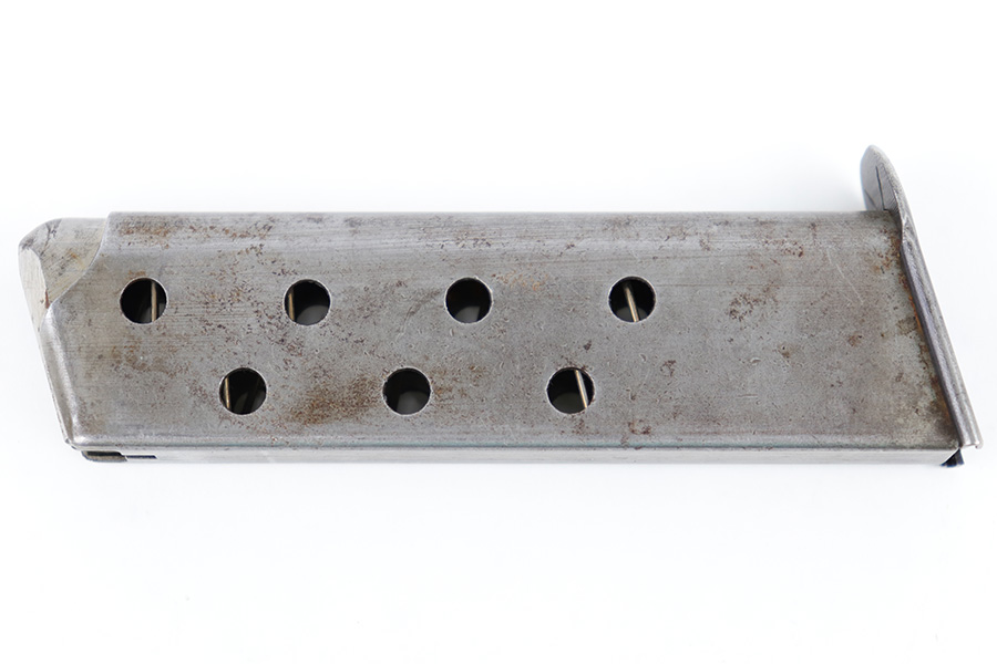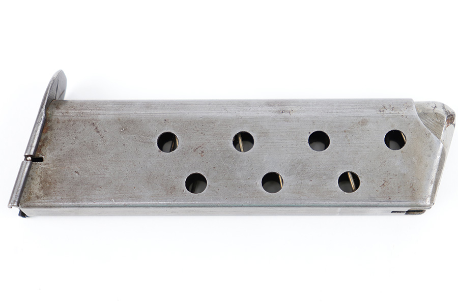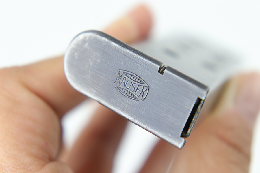 6/30/23 – This is an original, early WW2 production Mauser HSc pistol magazine. The magazine is in great condition with some mild surface patina and speckling discoloration throughout the tube. The base is blued and has edge wear throughout as well as thinning to the finish. Mauser banner stamped on the base as shown. Strong, functional spring.