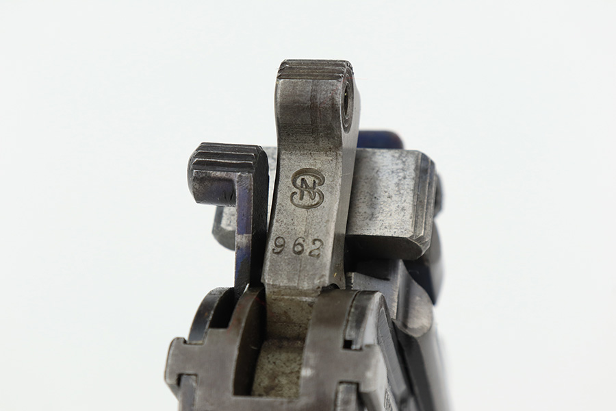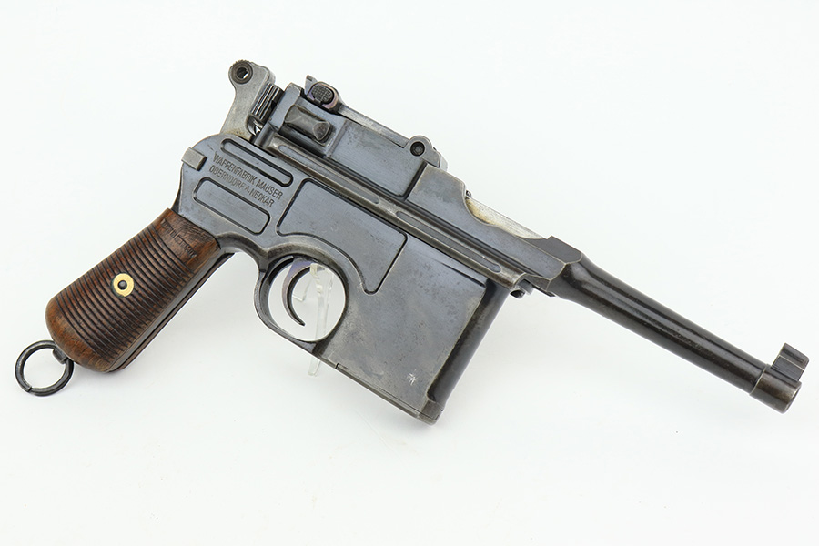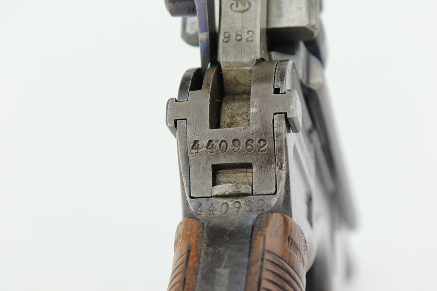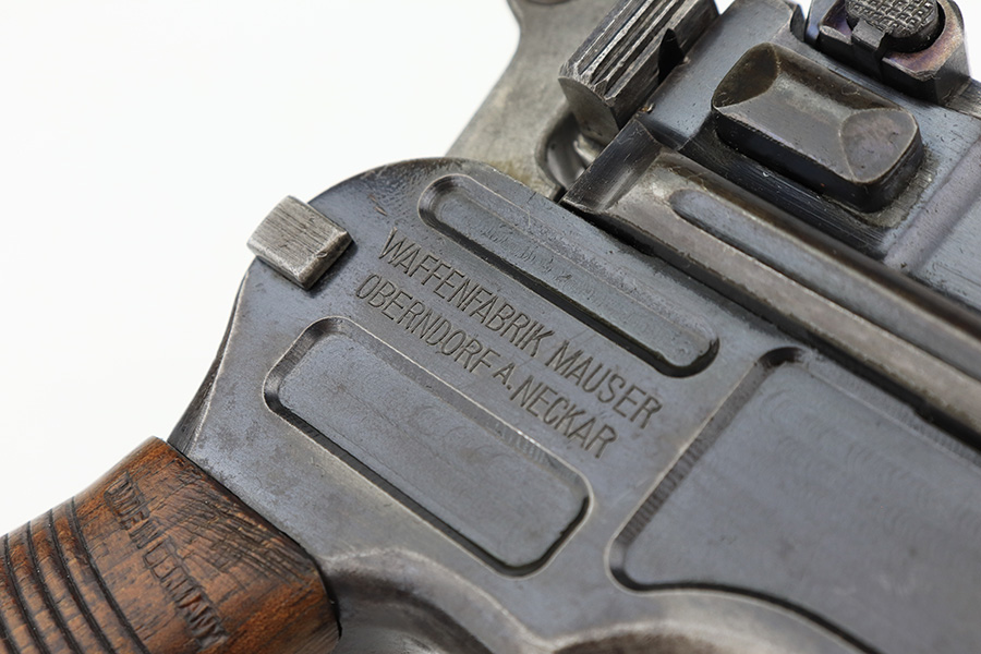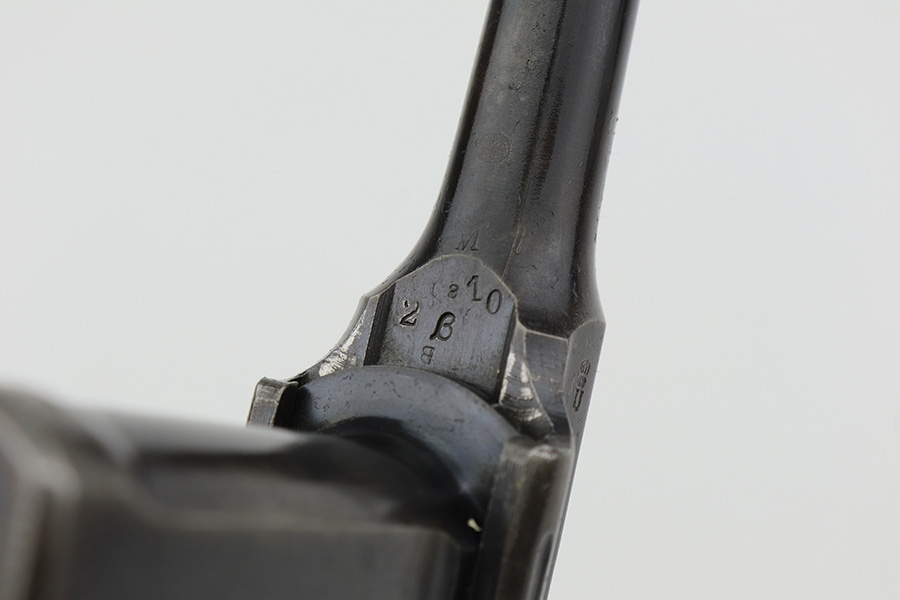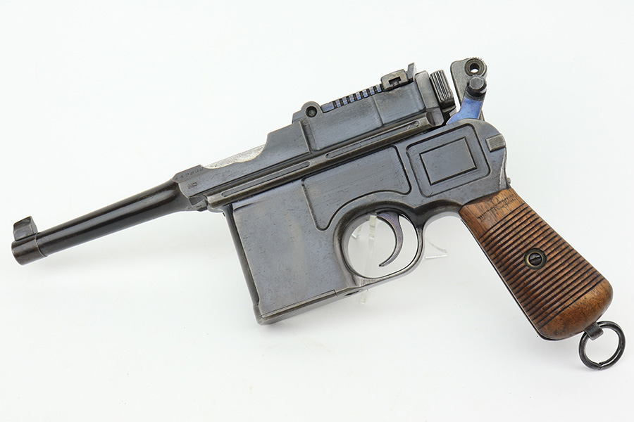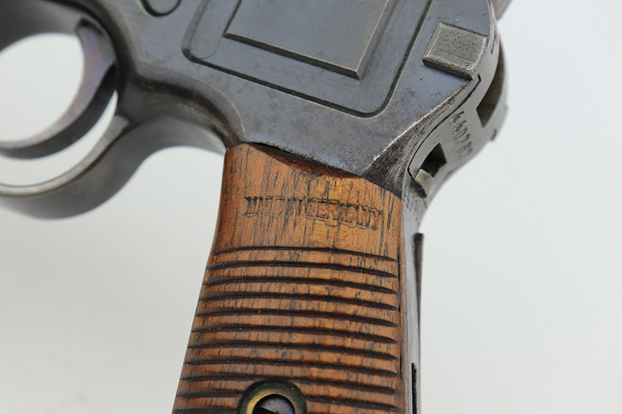 2/10/23 – This is an original M1921 Mauser “Bolo”, manufactured in ~1921. The Treaty of Versailles, signed in 1919, imposed restrictions on pistol barrel lengths and calibers on German arms manufacturers. Mauser began manufacturing a compliant version of the C96 for commercial sale with shorter, 3.9 inch barrel. The pistol is all matching, including the grips. The original blue rates at about 80-85% with thinning in most areas and some patina on both sides of the barrel and receiver. There’s also a minor ding/indent on the right side of the magazine well but it doesn’t appear to affect function. The bore has strong rifling but a little frost throughout. Very nice fire blue is still present on some of the small parts.
