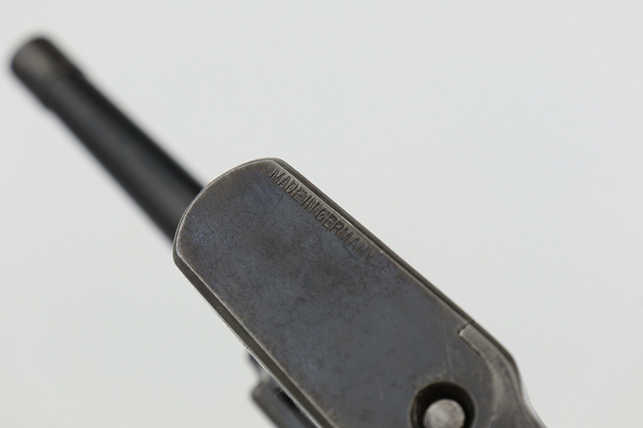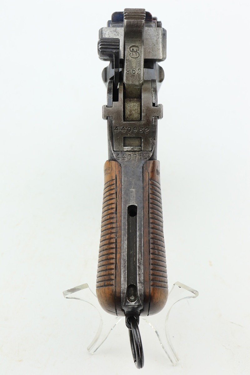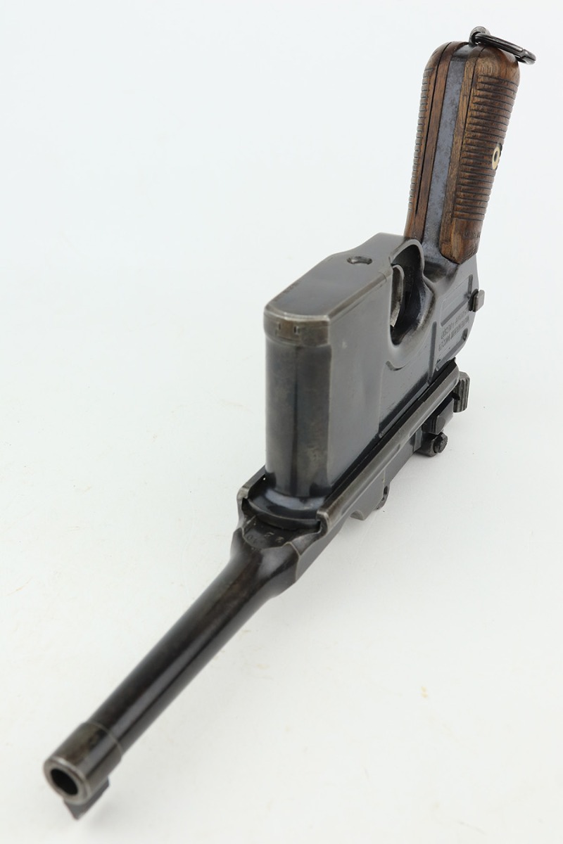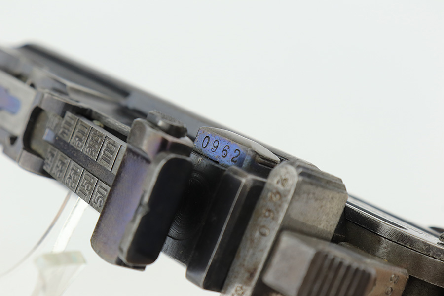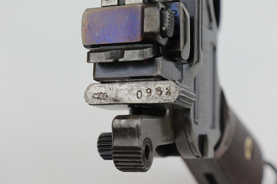 2/10/23 – This is an original M1921 Mauser “Bolo”, manufactured in ~1921. The Treaty of Versailles, signed in 1919, imposed restrictions on pistol barrel lengths and calibers on German arms manufacturers. Mauser began manufacturing a compliant version of the C96 for commercial sale with shorter, 3.9 inch barrel. The pistol is all matching, including the grips. The original blue rates at about 80-85% with thinning in most areas and some patina on both sides of the barrel and receiver. There’s also a minor ding/indent on the right side of the magazine well but it doesn’t appear to affect function. The bore has strong rifling but a little frost throughout. Very nice fire blue is still present on some of the small parts.