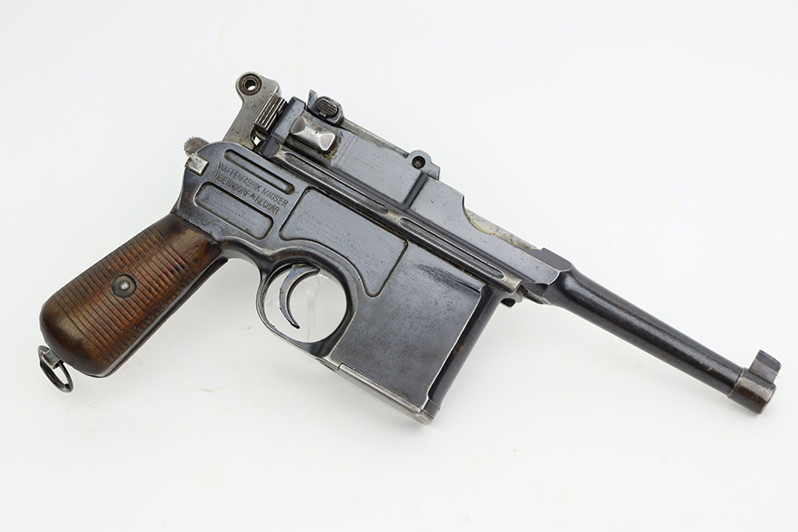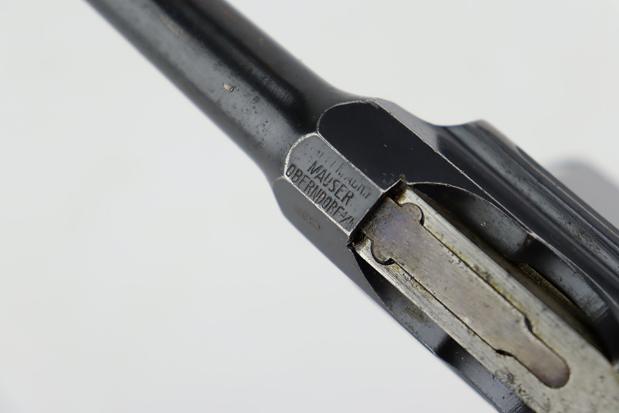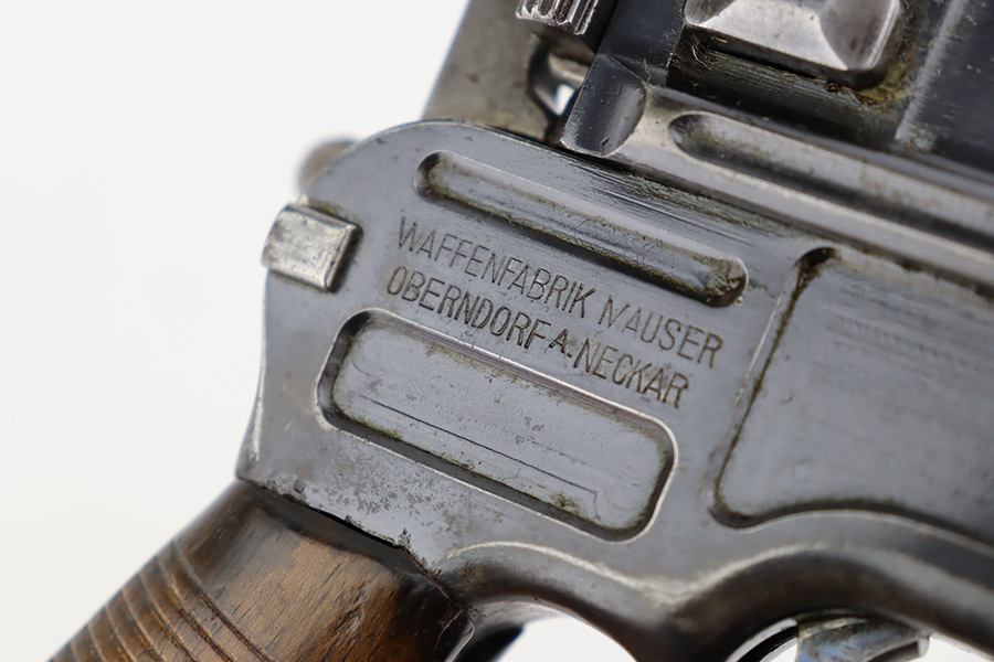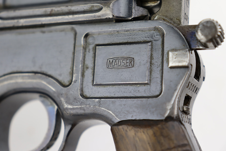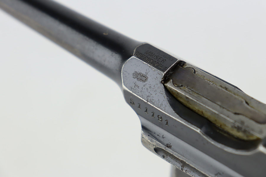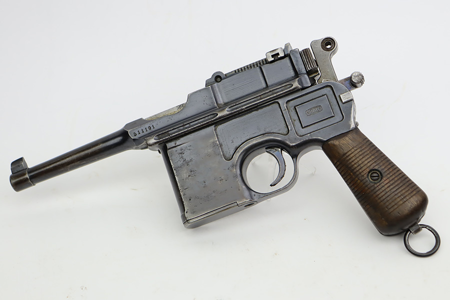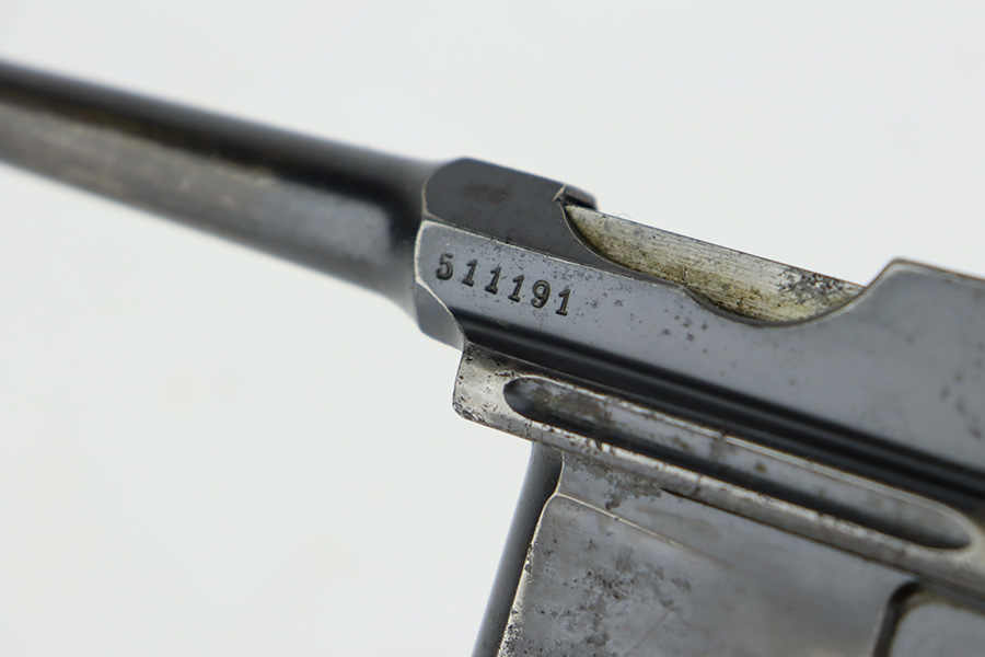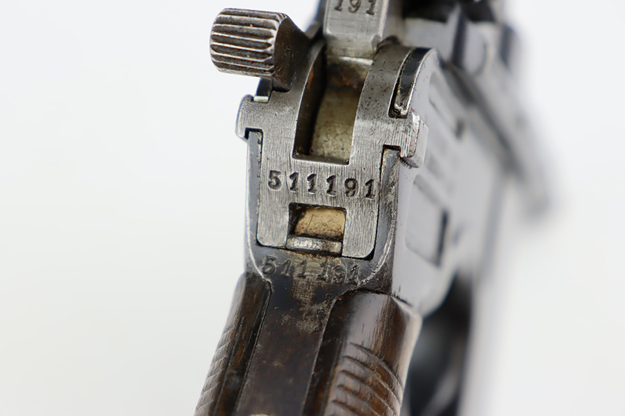 9/6/24 – This is an original M1921 Mauser “Bolo”, manufactured in the late 1920’s. The Treaty of Versailles, signed in 1919, imposed restrictions on pistol barrel lengths and calibers on German arms manufacturers. Mauser began manufacturing a compliant version of the C96 for commercial sale with shorter, 3.9 inch barrel. This one is mostly matching but has a mismatched floor plate. The floor plate is only off by one number (1194), so it’s possible it’s a factory error – can’t say for sure. The gun has retained roughly 80-85% of its original finish. There is general high edge wear and some finish loss on the left side of the barrel and frame. Minor pitting on the left side of the slide and frame. Fitted with very nice matching-numbered wood grips. Nice bore with good rifling and minor frosting in the grooves.