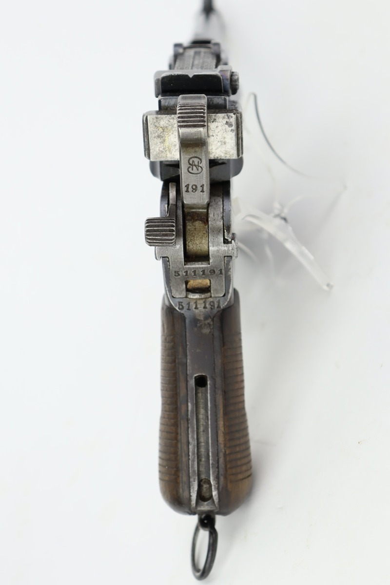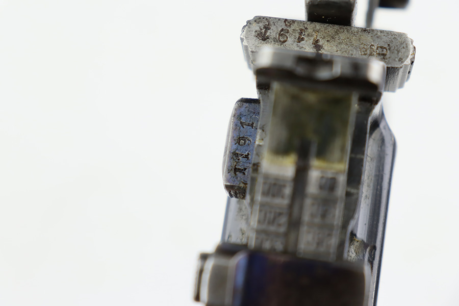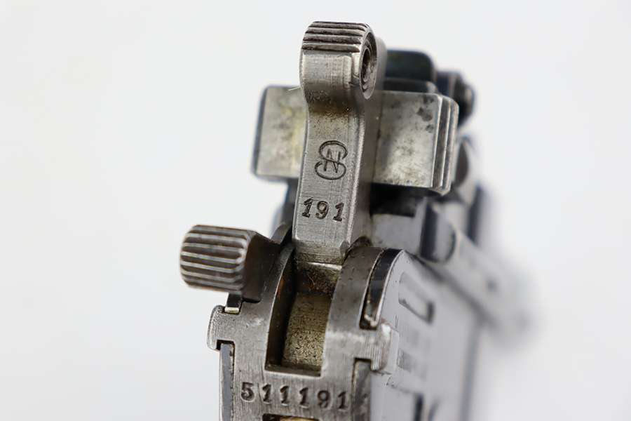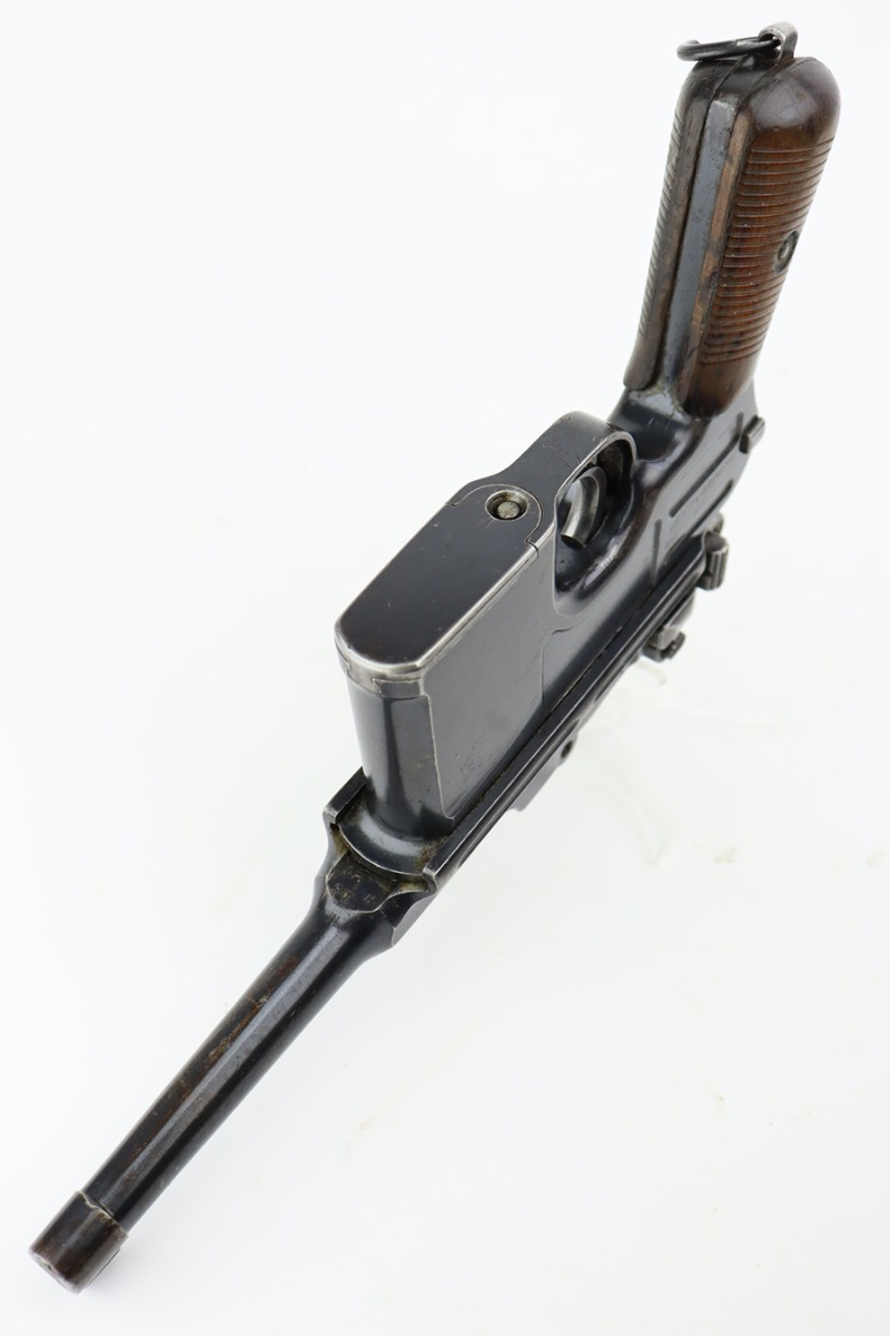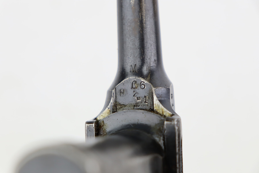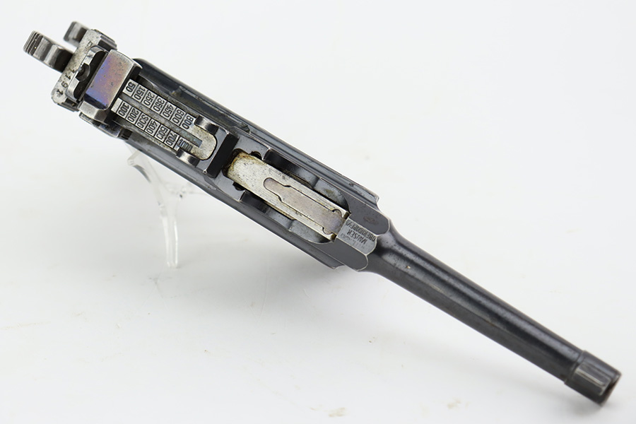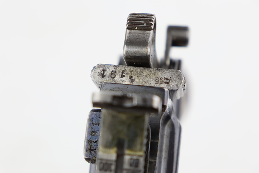 9/6/24 – This is an original M1921 Mauser “Bolo”, manufactured in the late 1920’s. The Treaty of Versailles, signed in 1919, imposed restrictions on pistol barrel lengths and calibers on German arms manufacturers. Mauser began manufacturing a compliant version of the C96 for commercial sale with shorter, 3.9 inch barrel. This one is mostly matching but has a mismatched floor plate. The floor plate is only off by one number (1194), so it’s possible it’s a factory error – can’t say for sure. The gun has retained roughly 80-85% of its original finish. There is general high edge wear and some finish loss on the left side of the barrel and frame. Minor pitting on the left side of the slide and frame. Fitted with very nice matching-numbered wood grips. Nice bore with good rifling and minor frosting in the grooves.