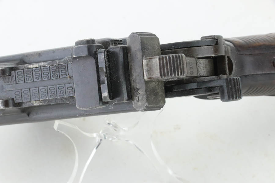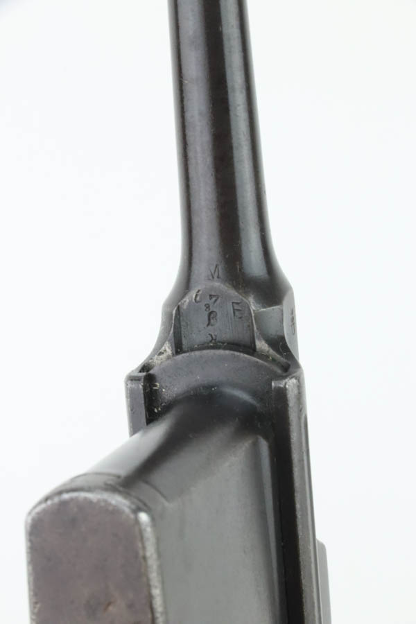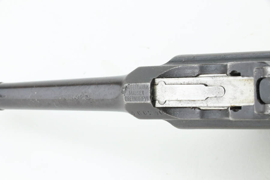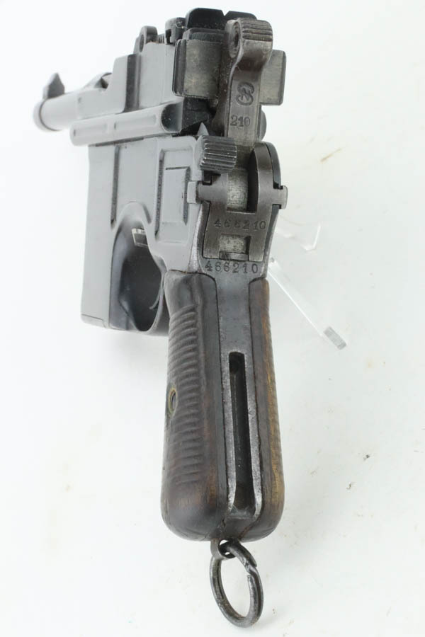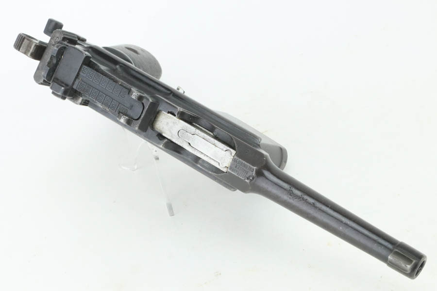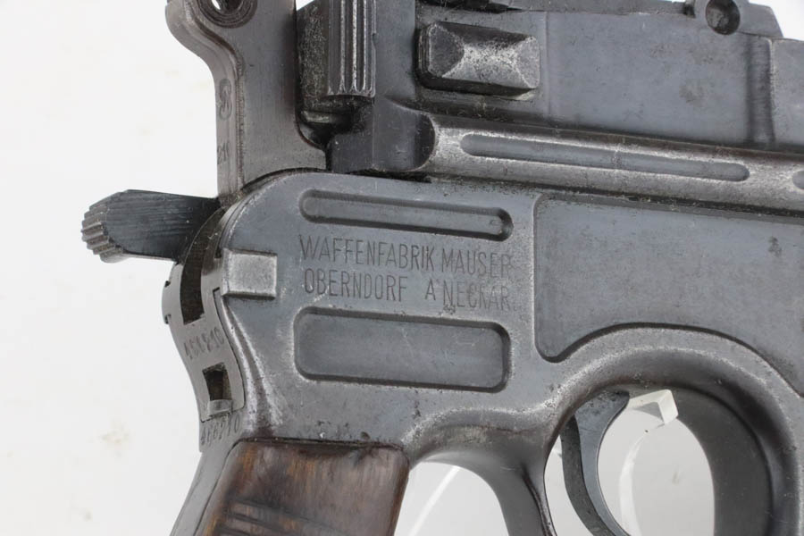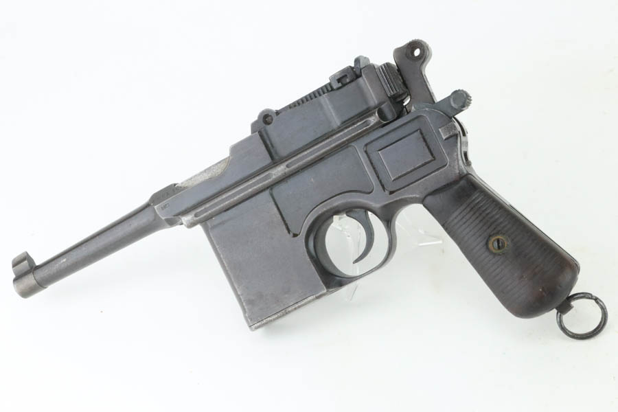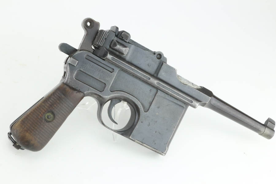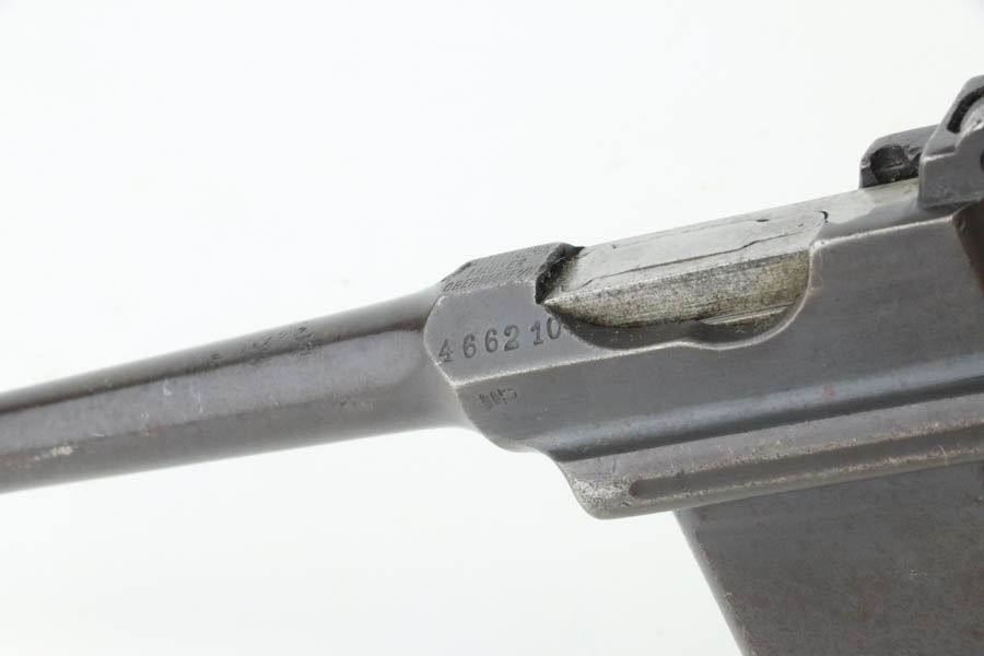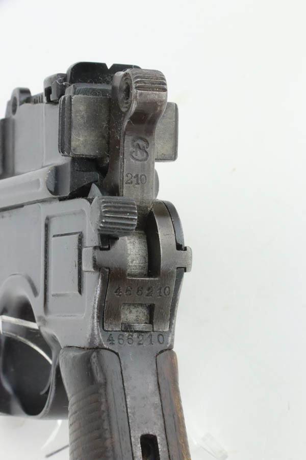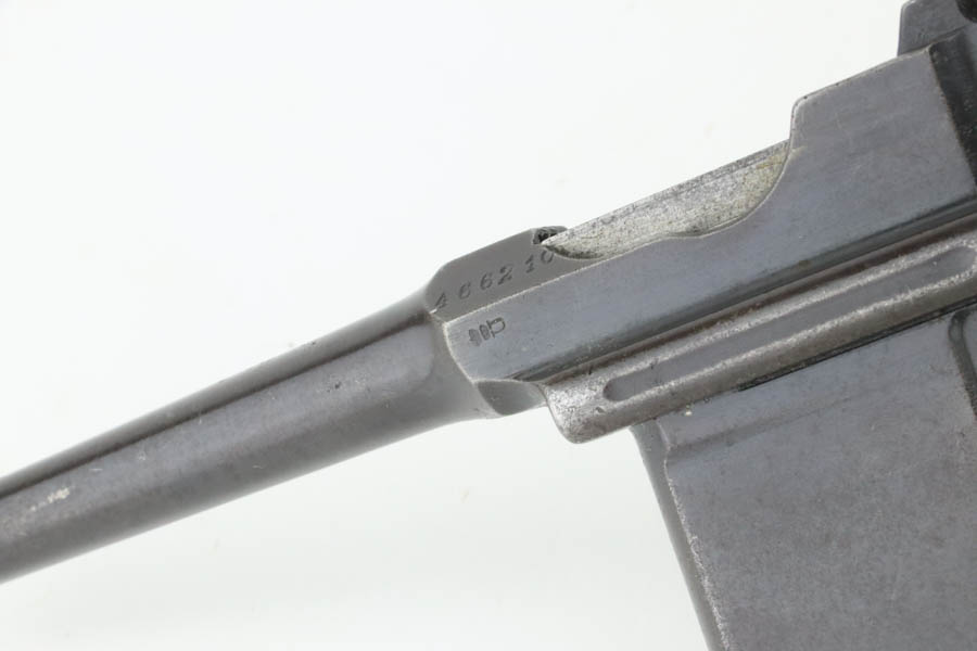 8/8/24 – This is an original M1921 Mauser “Bolo”, manufactured in the late 1920’s. The Treaty of Versailles, signed in 1919, imposed restrictions on pistol barrel lengths and calibers on German arms manufacturers. Mauser began manufacturing a compliant version of the C96 for commercial sale with shorter, 3.9 inch barrel. This one is all matching and has retained about 95% of its original finish. While there isn’t much actual finish loss, there is noticeable brown patina throughout and some areas of pitting here and there. Fitted with its original matching-numbered wood grips – they are fairly worn. The rifling in the bore is almost completely worn with minor pitting throughout.