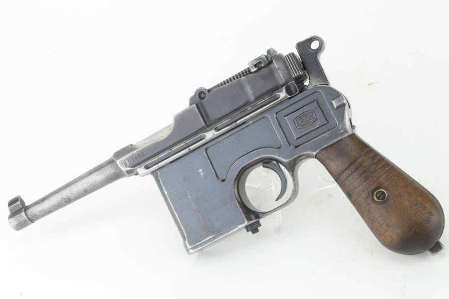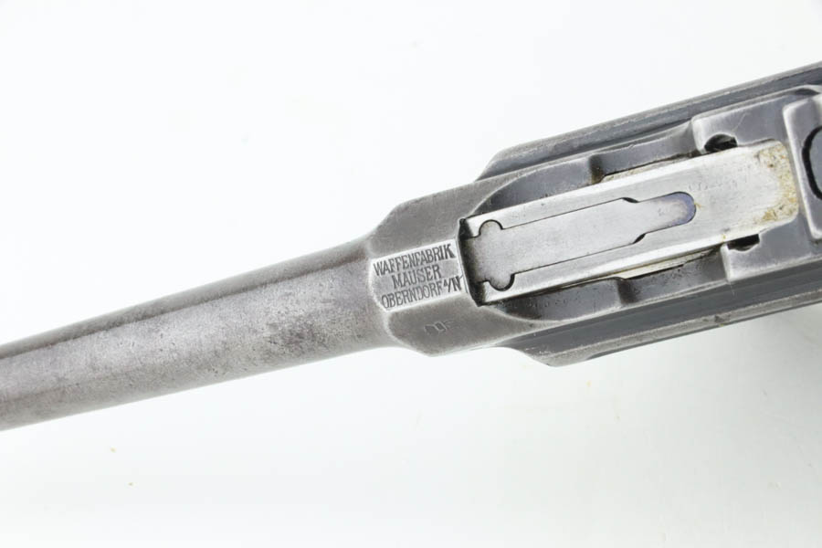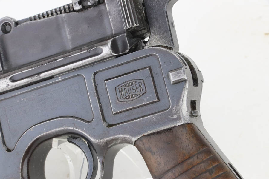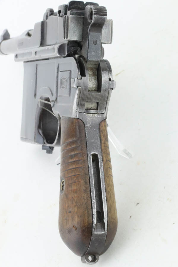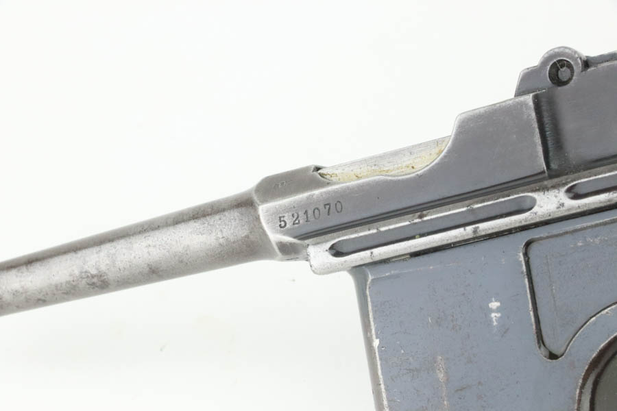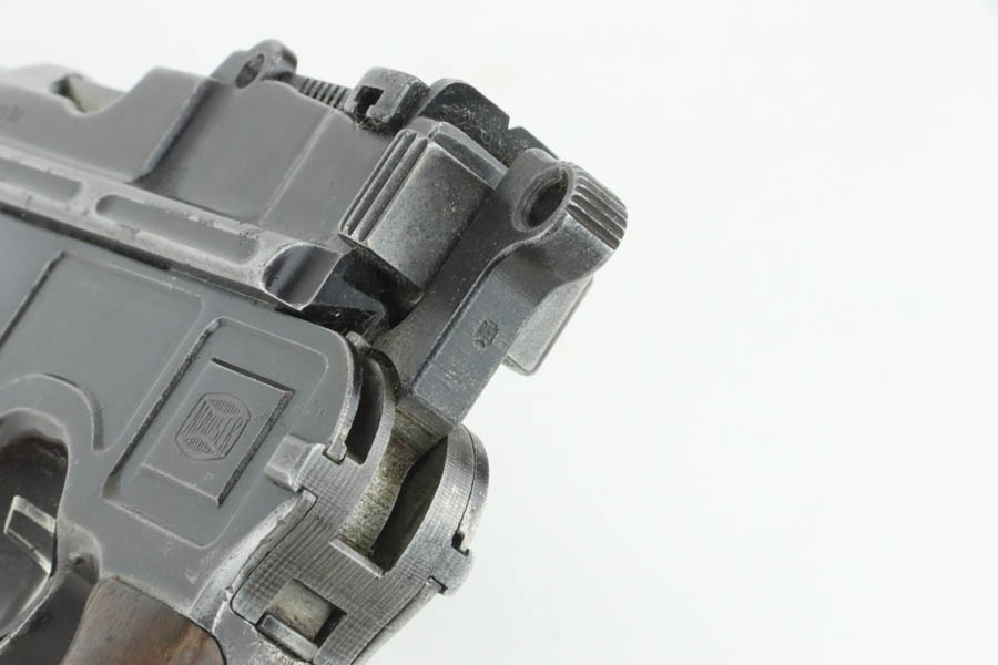 8/9/24 – This is a M1921 Mauser “Bolo”, manufactured in the late 1920’s. The Treaty of Versailles, signed in 1919, imposed restrictions on pistol barrel lengths and calibers on German arms manufacturers. Mauser began manufacturing a compliant version of the C96 for commercial sale with shorter, 3.9 inch barrel. This one is mismatched and has retained roughly 75-80% of its finish. There is general high edge wear and noticeable finish loss along the barrel. Heavy pitting under the grips. The bore has decent rifling, but there is noticeable pin-pricking throughout. The lanyard ring is missing, the safety has been altered, and the pin on the base plate has been replaced with a custom pin to hold it in place. The grips are un-numbered.