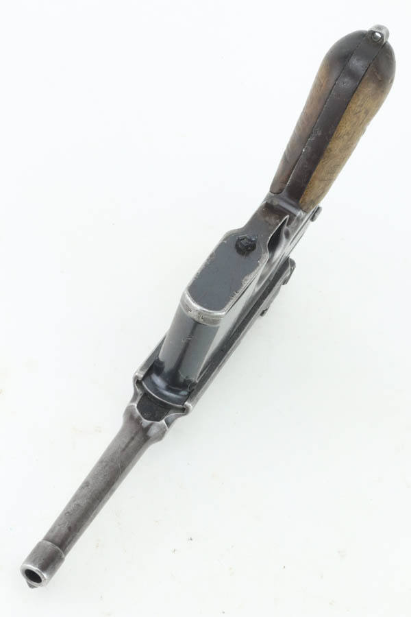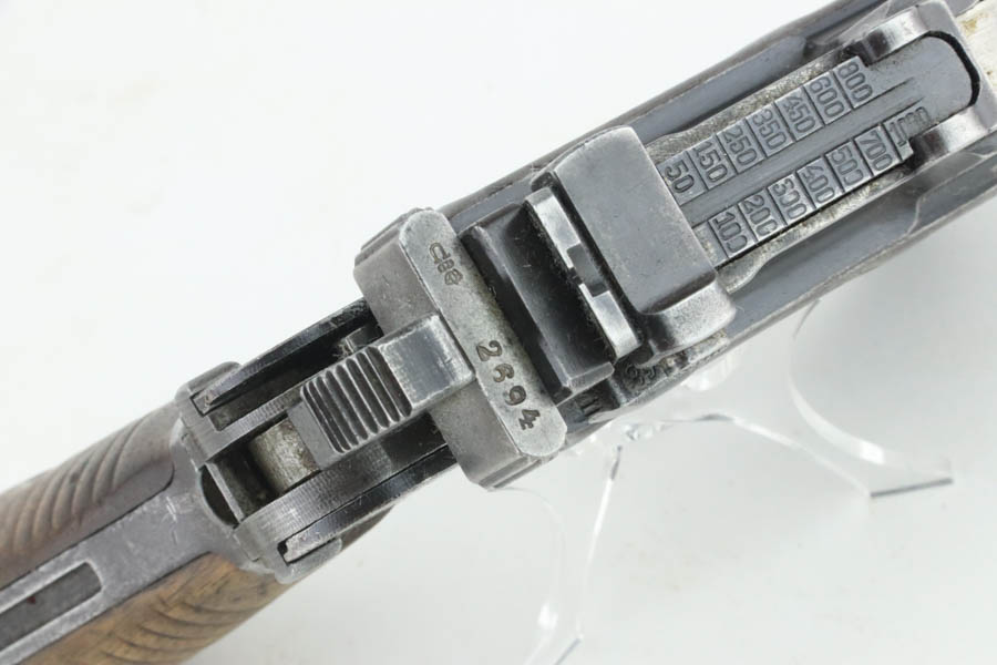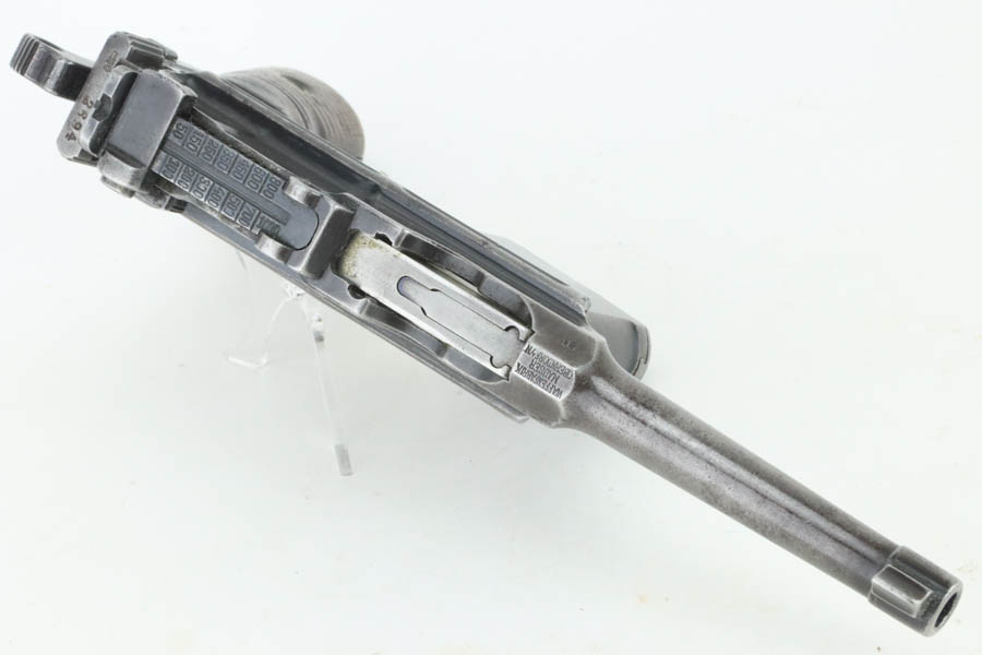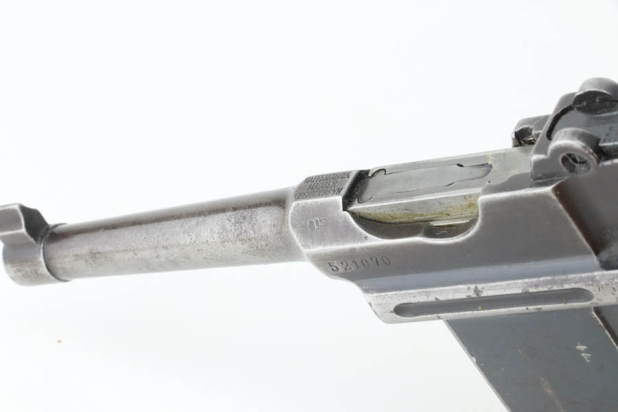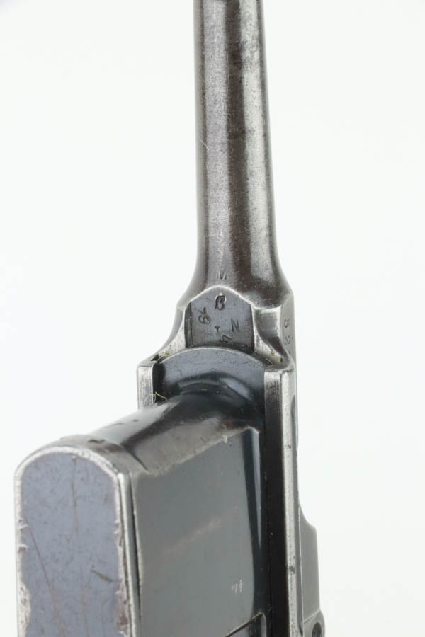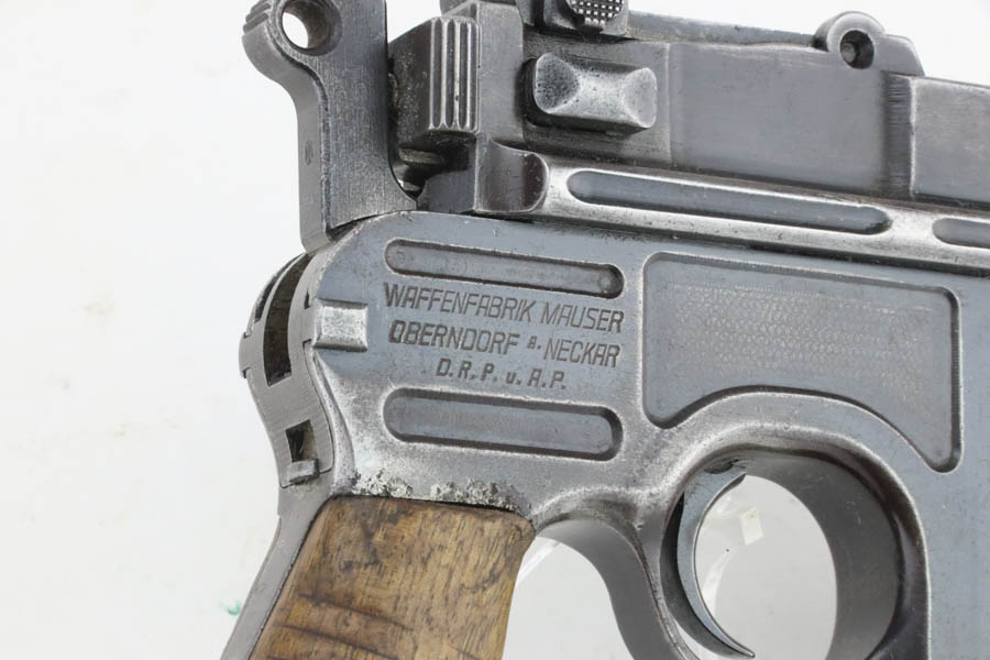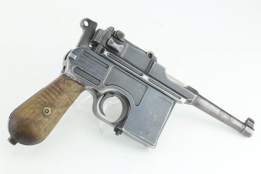 8/9/24 – This is a M1921 Mauser “Bolo”, manufactured in the late 1920’s. The Treaty of Versailles, signed in 1919, imposed restrictions on pistol barrel lengths and calibers on German arms manufacturers. Mauser began manufacturing a compliant version of the C96 for commercial sale with shorter, 3.9 inch barrel. This one is mismatched and has retained roughly 75-80% of its finish. There is general high edge wear and noticeable finish loss along the barrel. Heavy pitting under the grips. The bore has decent rifling, but there is noticeable pin-pricking throughout. The lanyard ring is missing, the safety has been altered, and the pin on the base plate has been replaced with a custom pin to hold it in place. The grips are un-numbered.