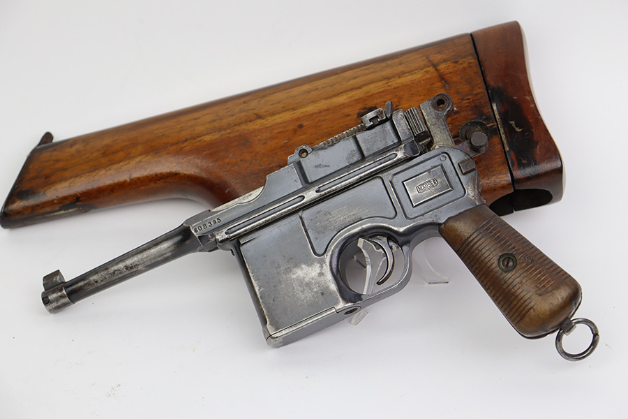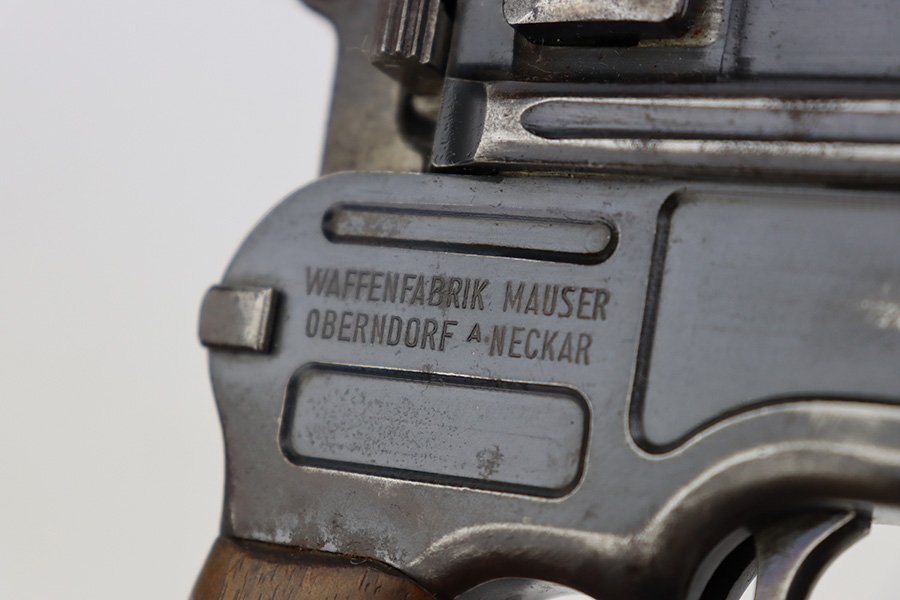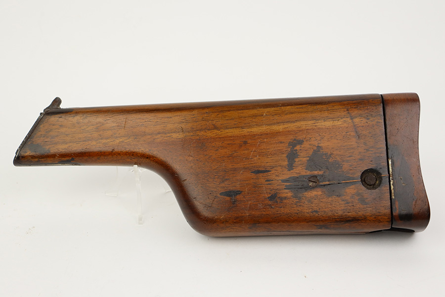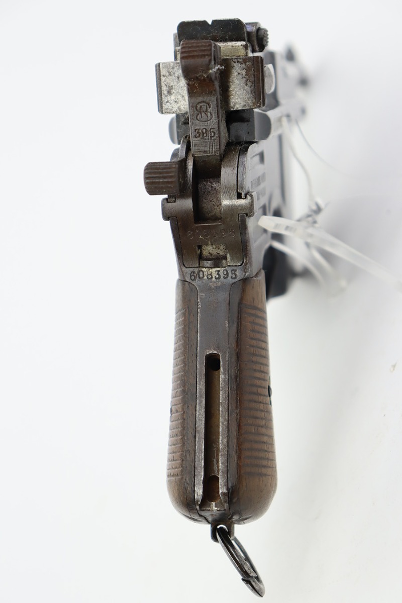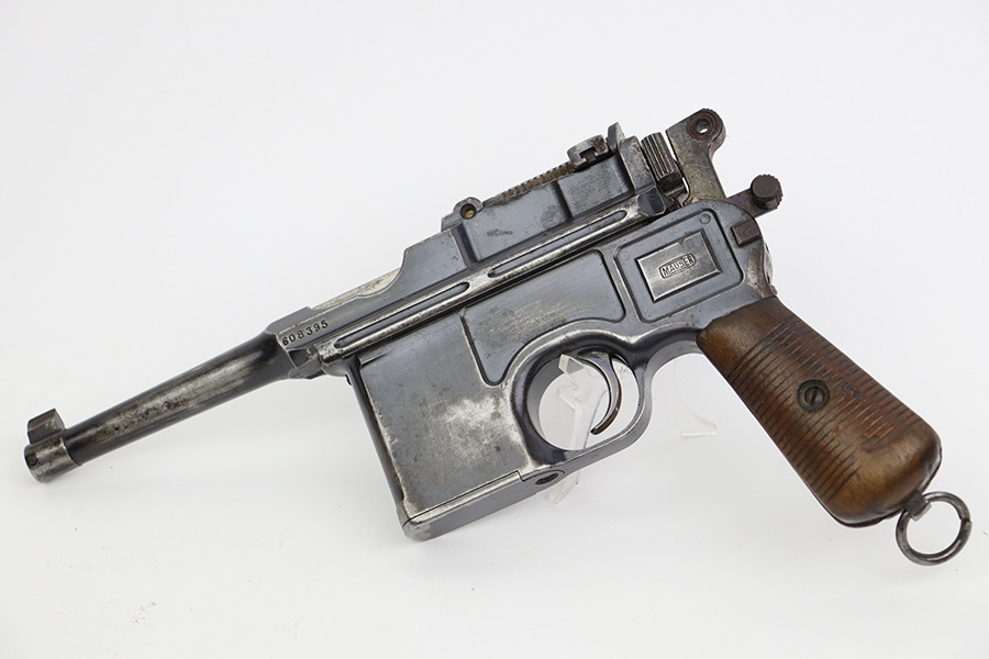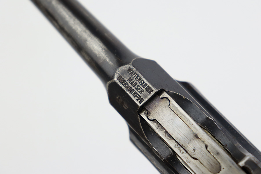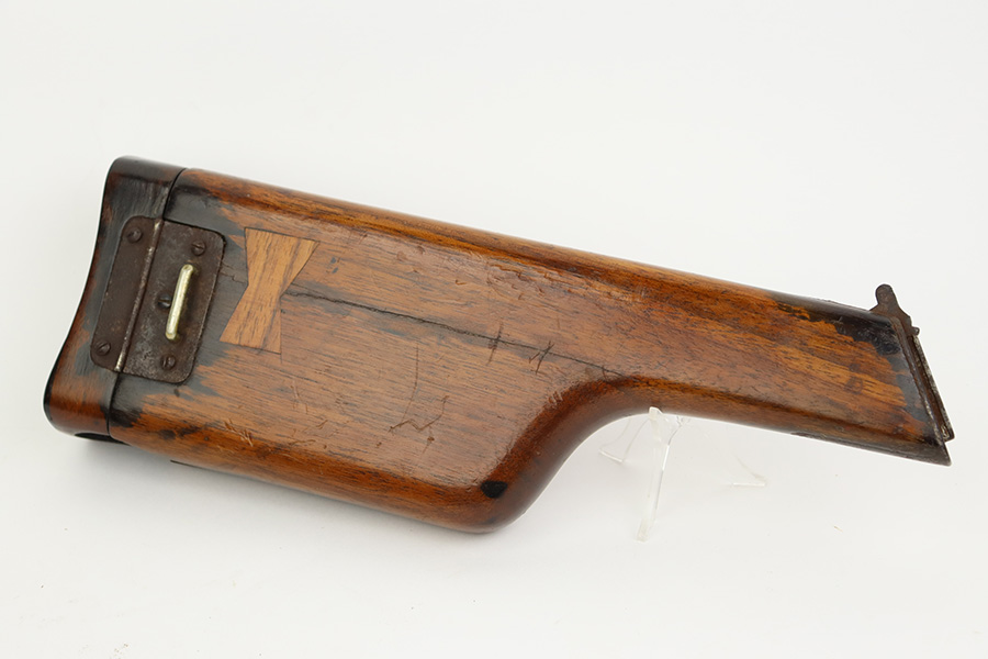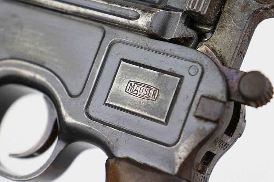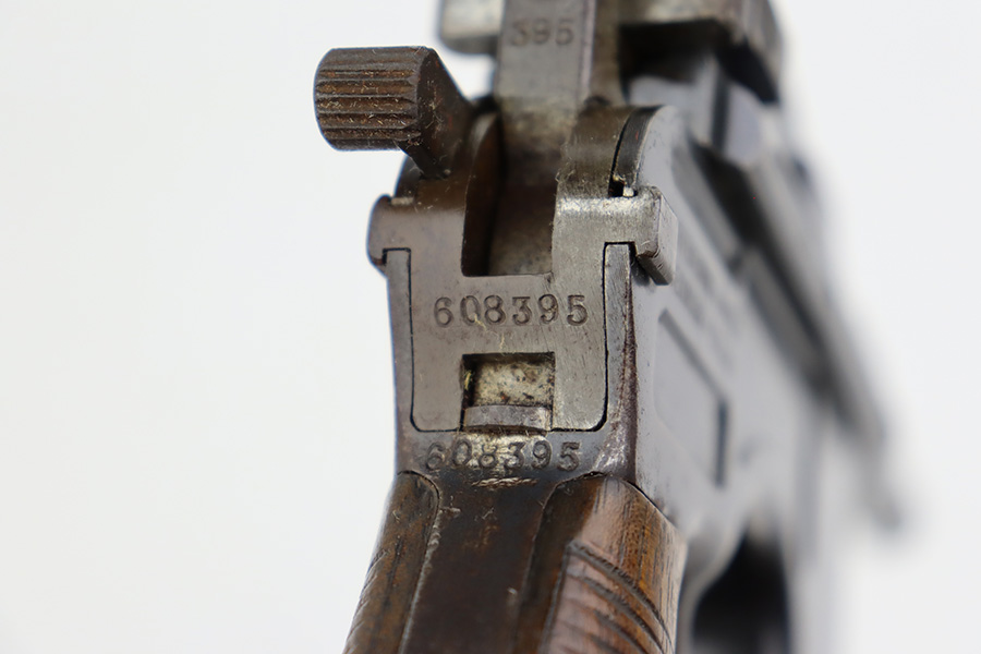 8/2/23 – This is an original M1921 Mauser “Bolo”, manufactured in the late 1920’s. The Treaty of Versailles, signed in 1919, imposed restrictions on pistol barrel lengths and calibers on German arms manufacturers. Mauser began manufacturing a compliant version of the C96 for commercial sale with shorter, 3.9 inch barrel. This one is matching and comes with a period-correct wood stock – numbered but not matching to the gun. There are hairline cracks on both sides and a dovetail wood repair on one side. The gun itself has retained roughly 75% of its original finish. There is obvious wear throughout, concentrated mostly along the barrel, on the left side of the frame, and around the high edges in general. Areas of spotty oxidation here and there, most noticeable on the left side of the barrel and at the back of the frame, near the hammer and safety. Fitted with matching-numbered wood grips – some bruising and dings on both sides. The bore has great rifling with just very minor pin-pricking in the grooves.