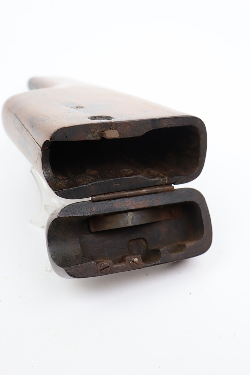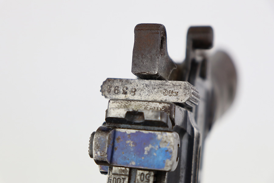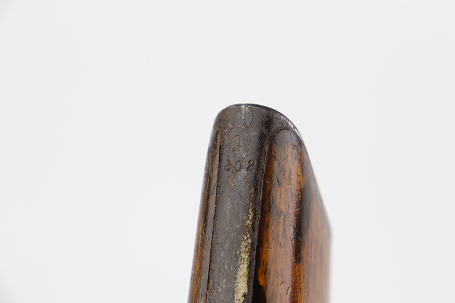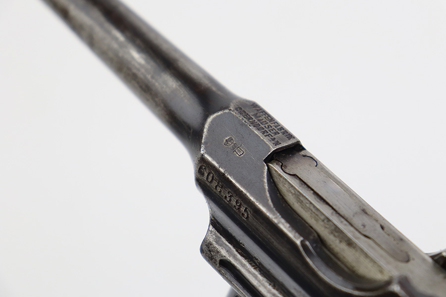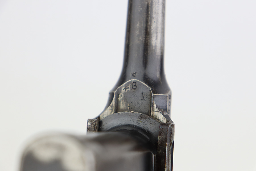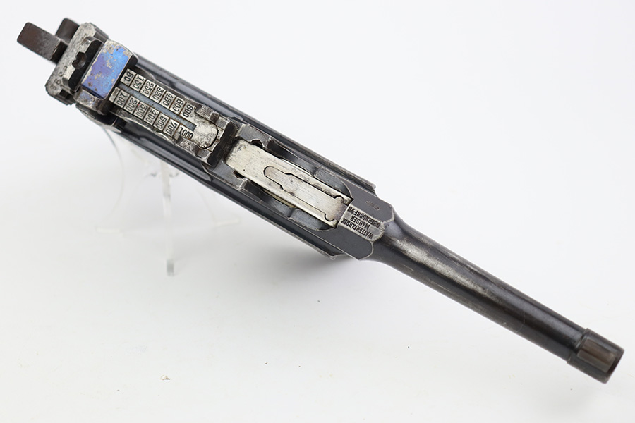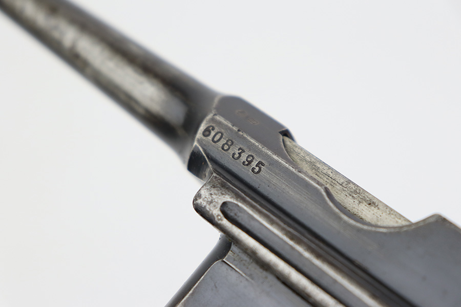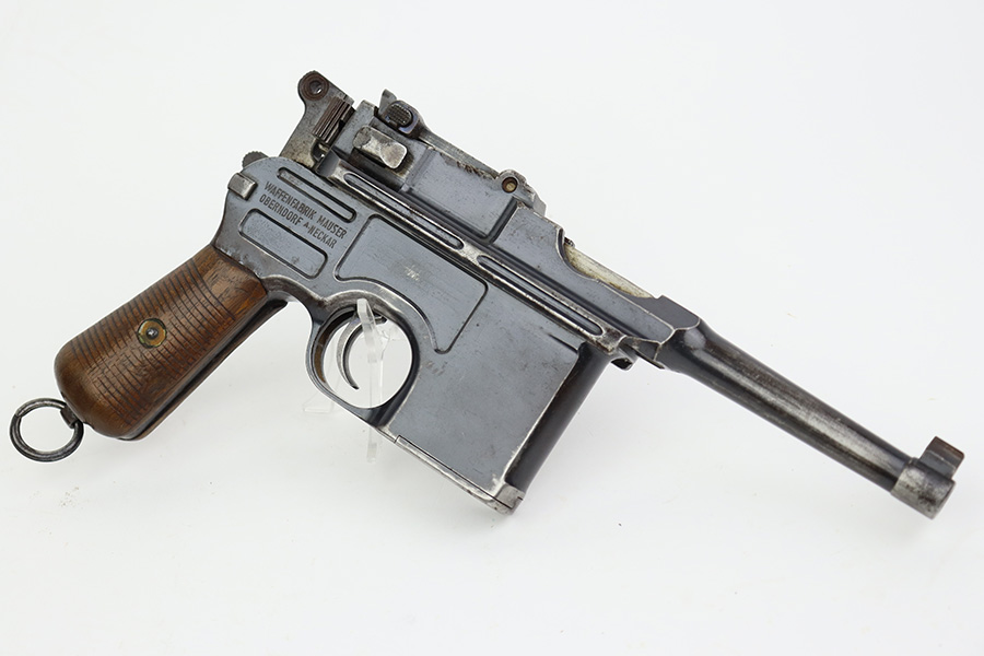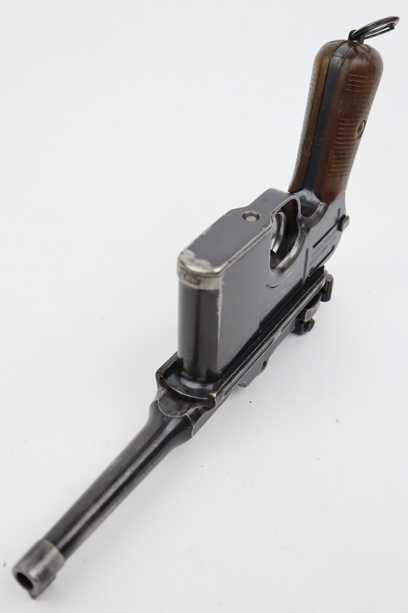 8/2/23 – This is an original M1921 Mauser “Bolo”, manufactured in the late 1920’s. The Treaty of Versailles, signed in 1919, imposed restrictions on pistol barrel lengths and calibers on German arms manufacturers. Mauser began manufacturing a compliant version of the C96 for commercial sale with shorter, 3.9 inch barrel. This one is matching and comes with a period-correct wood stock – numbered but not matching to the gun. There are hairline cracks on both sides and a dovetail wood repair on one side. The gun itself has retained roughly 75% of its original finish. There is obvious wear throughout, concentrated mostly along the barrel, on the left side of the frame, and around the high edges in general. Areas of spotty oxidation here and there, most noticeable on the left side of the barrel and at the back of the frame, near the hammer and safety. Fitted with matching-numbered wood grips – some bruising and dings on both sides. The bore has great rifling with just very minor pin-pricking in the grooves.