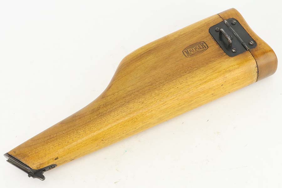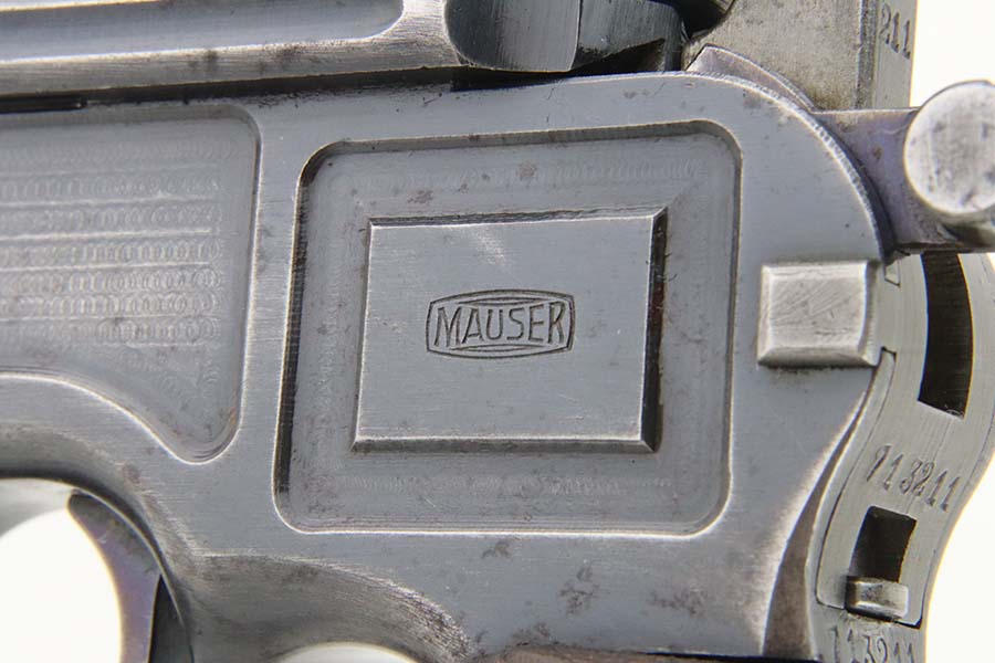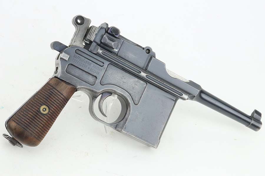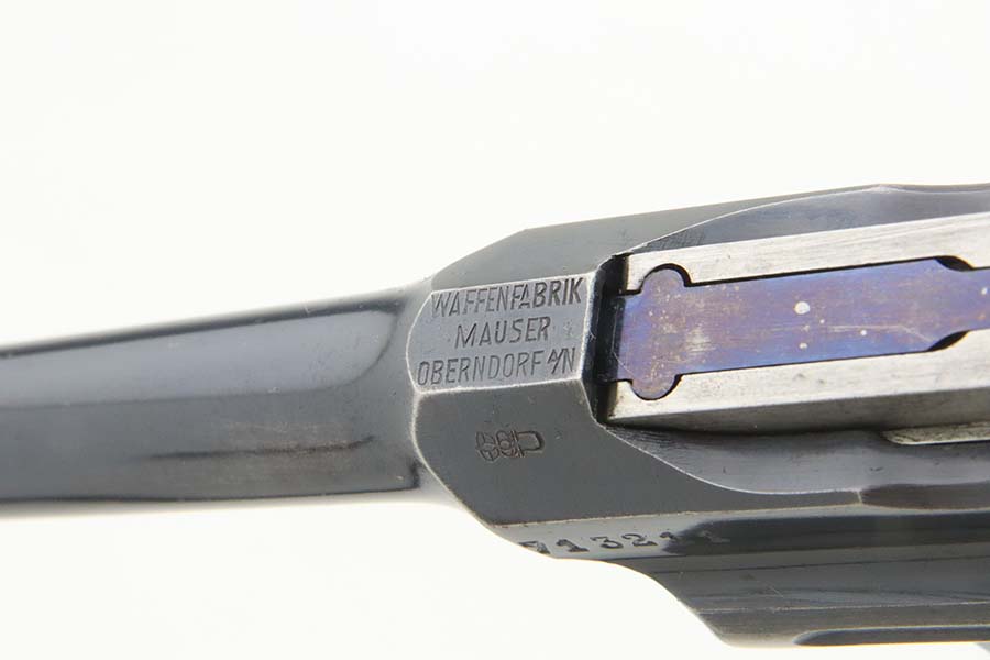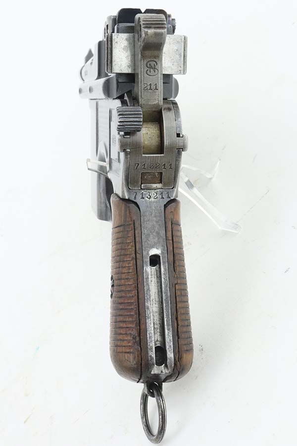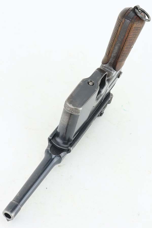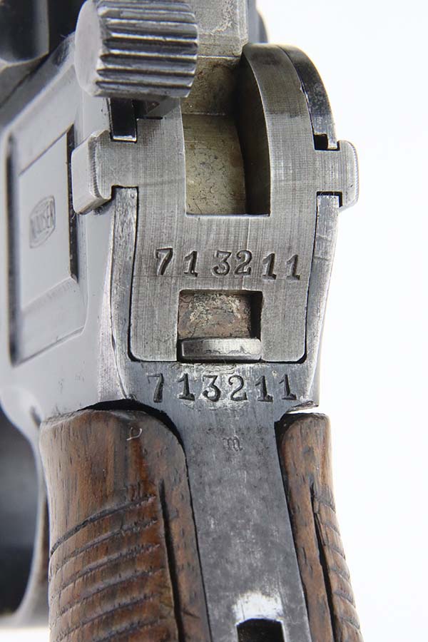 3/26/24 – This is a M1921 Mauser “Bolo”, manufactured in the late 1920’s. The Treaty of Versailles, signed in 1919, imposed restrictions on pistol barrel lengths and calibers on German arms manufacturers. Mauser began manufacturing a compliant version of the C96 for commercial sale with shorter, 3.9 inch barrel. This one is matching and comes as a rig with an original Mauser-marked wood stock. The finish rates roughly 80% with muzzle wear, general high edge wear, thinning on the grip straps, and some areas of light spotty wear on the left side of the barrel and left side of the frame. Excellent matching-numbered wood grips. Excellent bore.