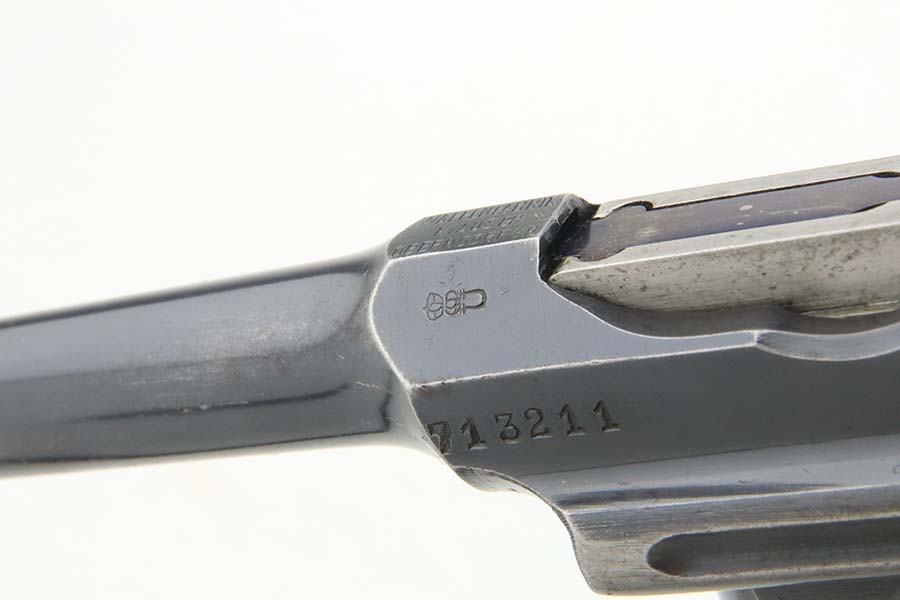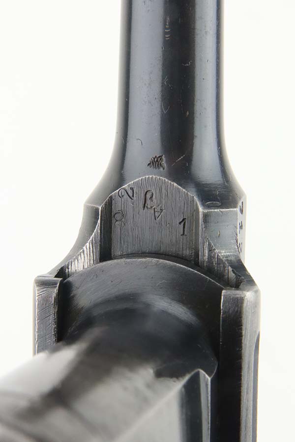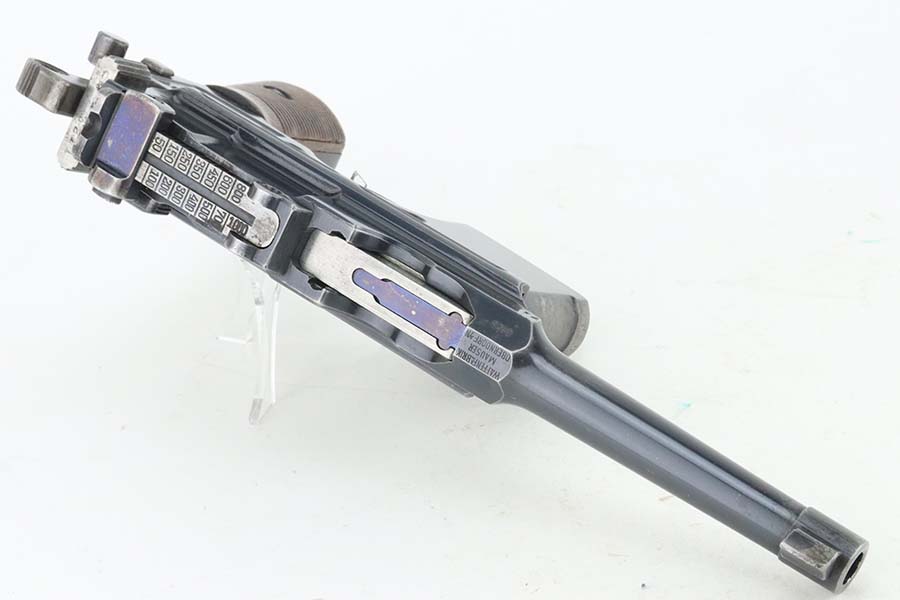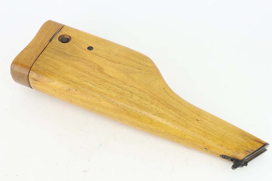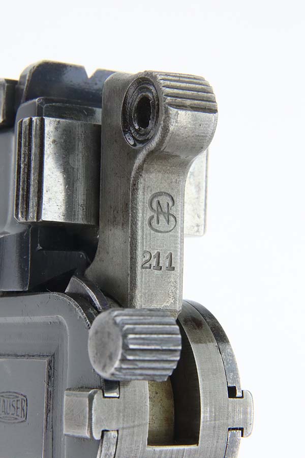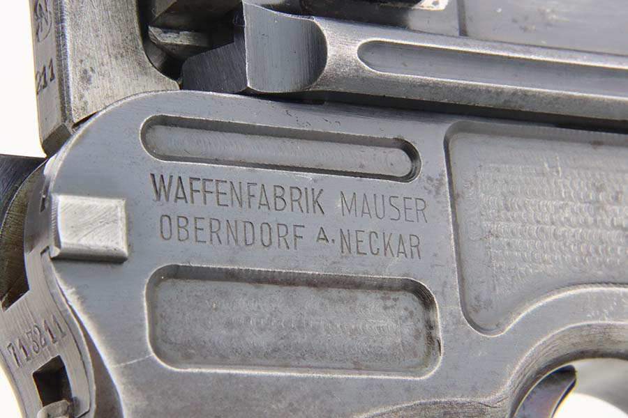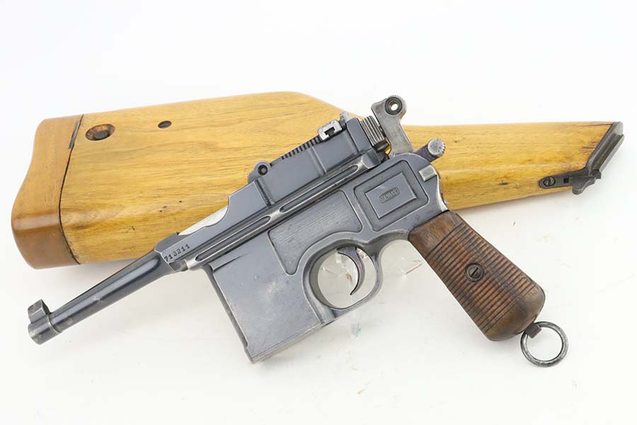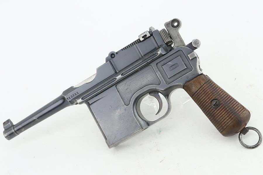 3/26/24 – This is a M1921 Mauser “Bolo”, manufactured in the late 1920’s. The Treaty of Versailles, signed in 1919, imposed restrictions on pistol barrel lengths and calibers on German arms manufacturers. Mauser began manufacturing a compliant version of the C96 for commercial sale with shorter, 3.9 inch barrel. This one is matching and comes as a rig with an original Mauser-marked wood stock. The finish rates roughly 80% with muzzle wear, general high edge wear, thinning on the grip straps, and some areas of light spotty wear on the left side of the barrel and left side of the frame. Excellent matching-numbered wood grips. Excellent bore.