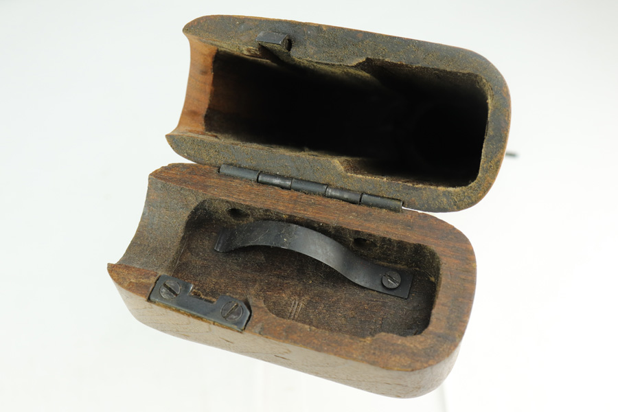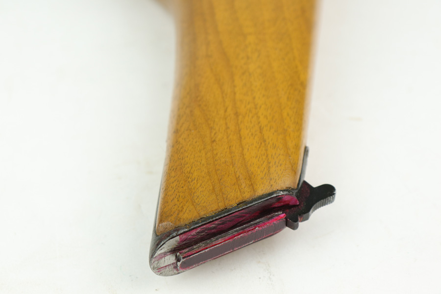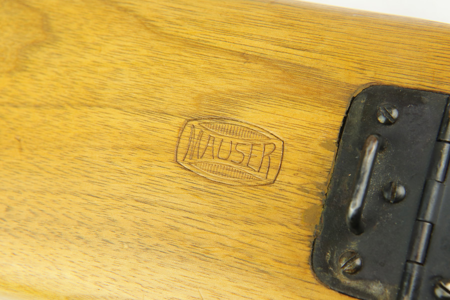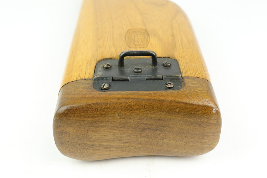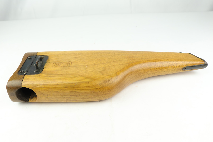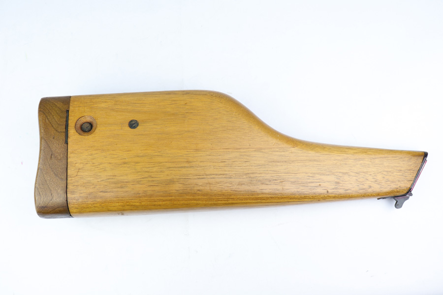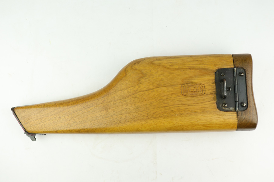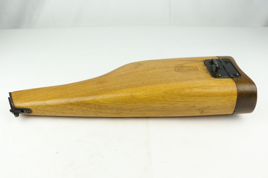 1/4/19 – This is a Mauser Bolo stock from the post-WWI era. We believe it’s a Bolo stock as other C96 stocks will not fit a Bolo, but this one does. It’s in excellent condition with no cracks or chips. Commercial stock with the Mauser logo. Properly has no serial. Someone has colored in the area where the stock attaches to the gun – not sure why.