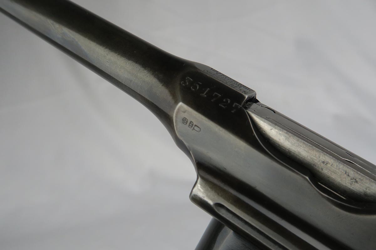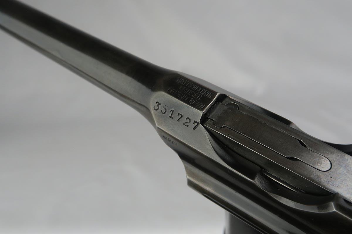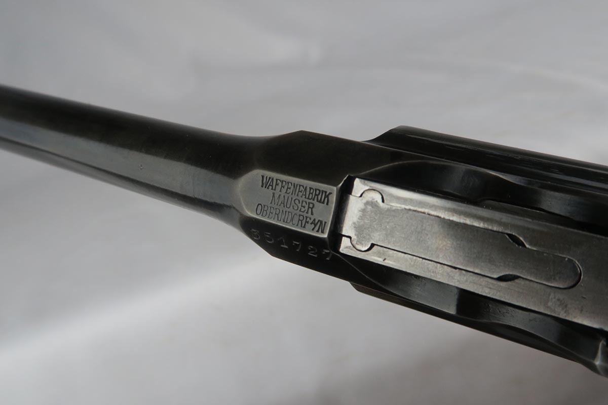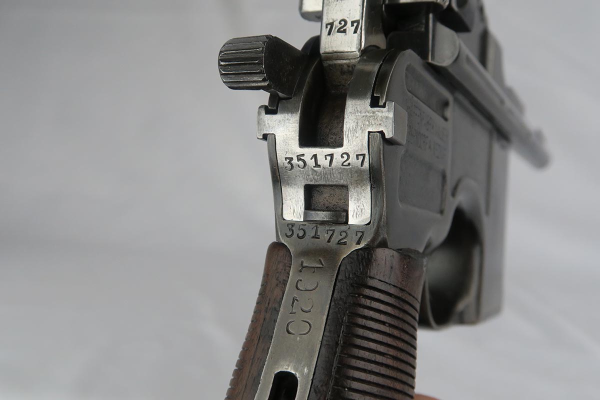 10/9/17 – This is a very nice example of a WWI German Imperial Army Mauser broomhandle, that was pressed in to Weimar Army service in the early 1920’s.  It is marked on the rear strap with Weimar 1920 property marking, signifying Weimar Army acceptance, which is a somewhat unusual location, as most were marked in the chamber area. The gun is all matching with excellent bore and grips and presents well. All the marking are nice and sharp. The imperial proofmark is still present on the right side of the chamber. The arsenal blue around 80% with patina throughout. Great example of a military contract broomhandle that survived two wars.