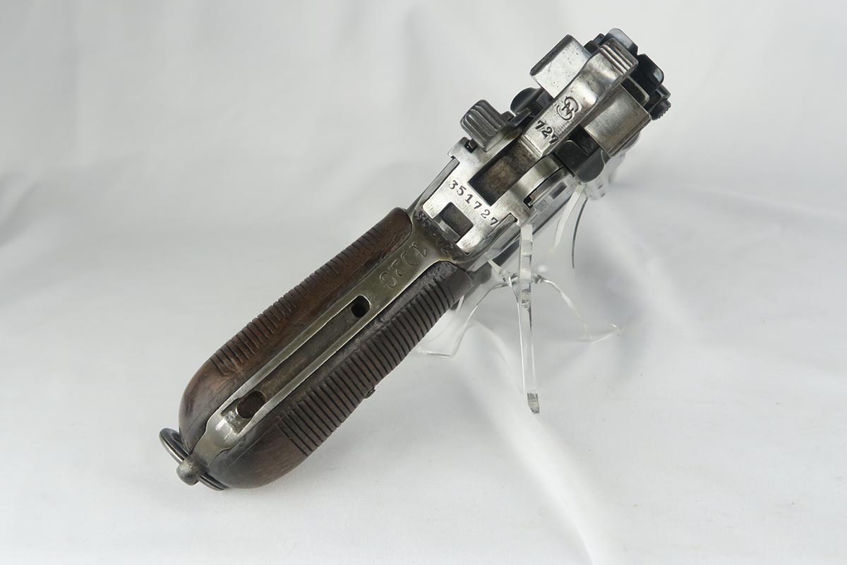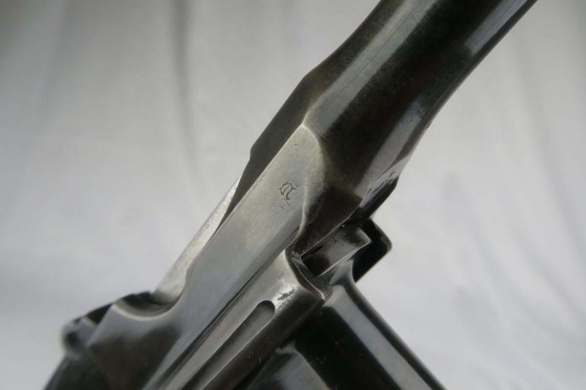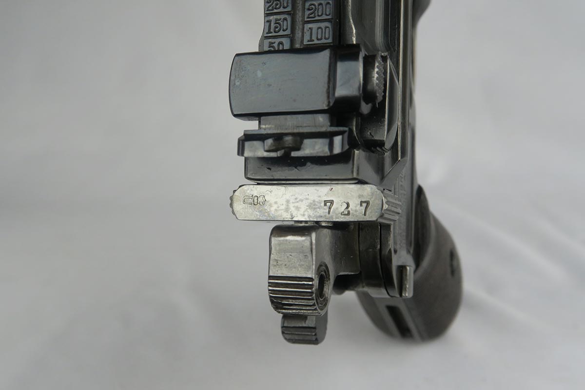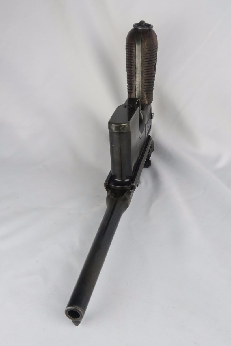 10/9/17 – This is a very nice example of a WWI German Imperial Army Mauser broomhandle, that was pressed in to Weimar Army service in the early 1920’s.  It is marked on the rear strap with Weimar 1920 property marking, signifying Weimar Army acceptance, which is a somewhat unusual location, as most were marked in the chamber area. The gun is all matching with excellent bore and grips and presents well. All the marking are nice and sharp. The imperial proofmark is still present on the right side of the chamber. The arsenal blue around 80% with patina throughout. Great example of a military contract broomhandle that survived two wars.