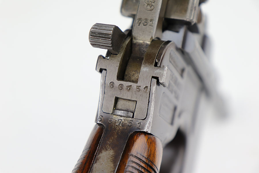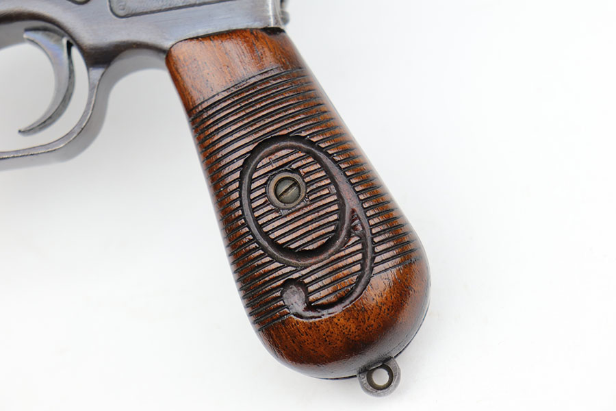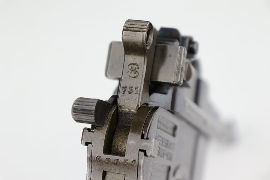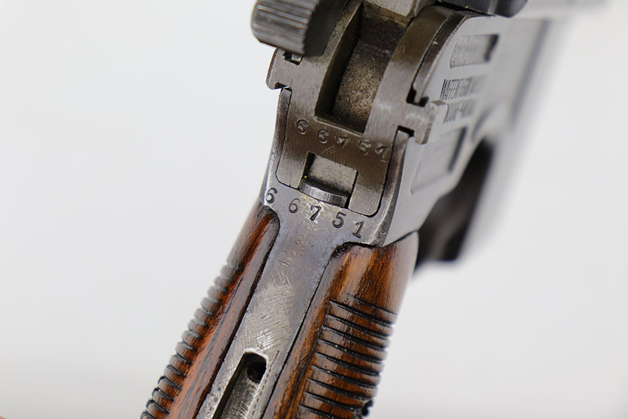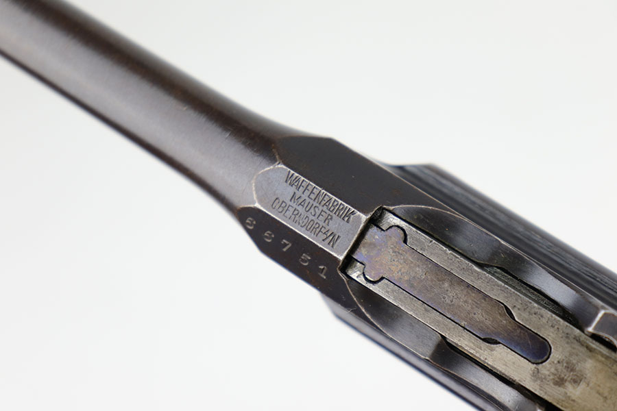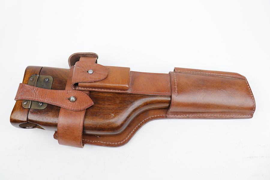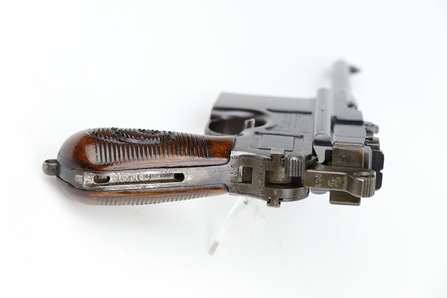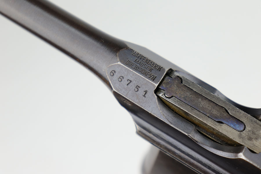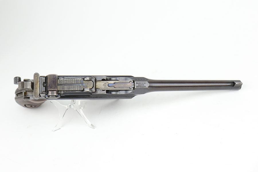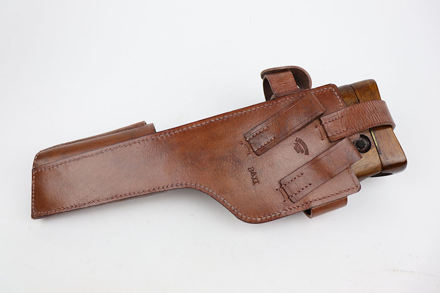 11/19/20 – This is a nice example of an all original ‘Red 9’ Mauser C96 with matching stock and reproduction harness. Unlike its commercial counterparts, “Red 9” Broomhandles were chambered in the more common 9mm Para caliber, which was used by the German Army and were marked with a large 9 on the grips which was then filled with red or orange paint to help German soldiers differentiate its caliber from the standard .30 mauser cartridge. Only about 130,000 of these very collectible guns were made, with only about 100,000 being accepted by the army and issued to the troops. Considered to be a substitute for a light carbine, they became very popular in trench warfare and were used by some of the Germany’s elite crack troops. The gun has about 90-94% of the original blue. It’s a little tough to rate as there isn’t much actual bluing loss, mainly just on the barrel, but there is some patina throughout. Small parts on the pistol show some fire blue still. The grips are matching numbered to the pistol, with the large red 9 externally, though much of the red paint has worn away. Stock is matching numbered to the gun. It doesn’t have any cracks but it does seem lightly sanded. Minty bore.