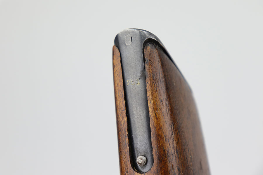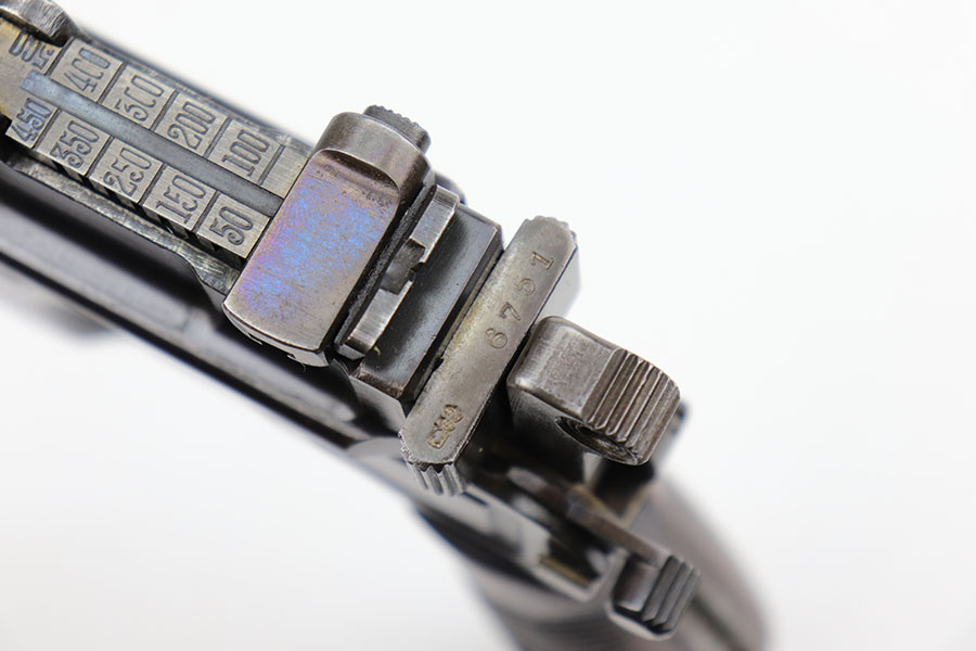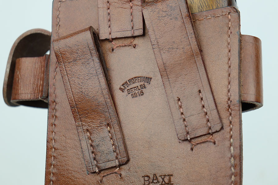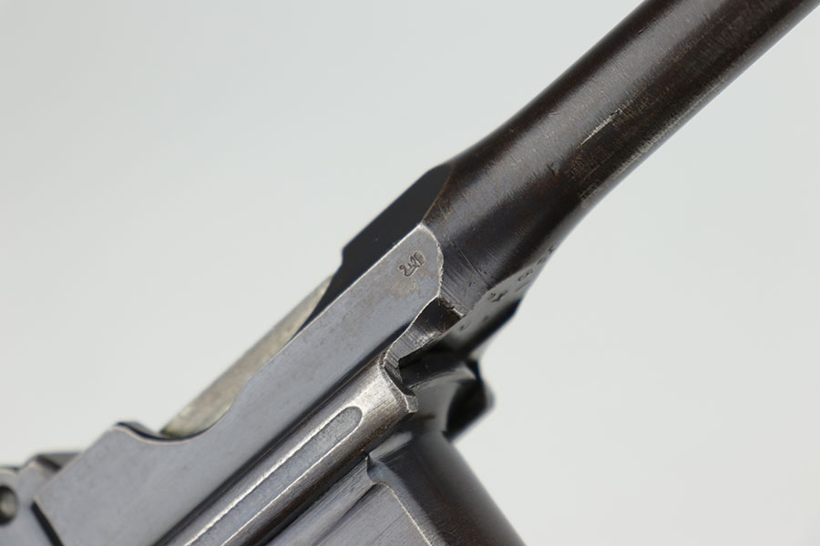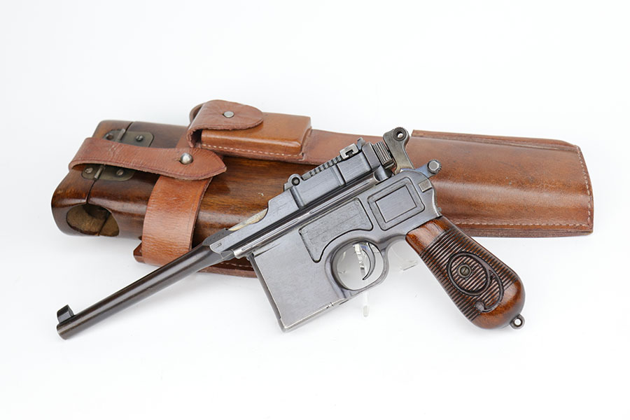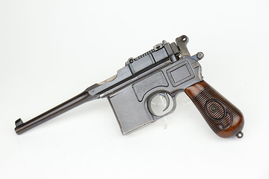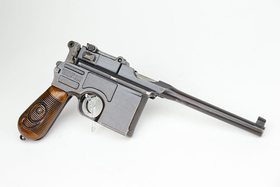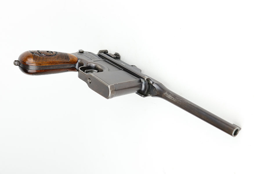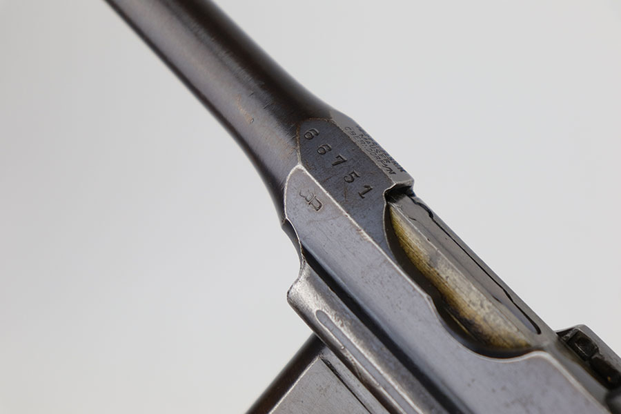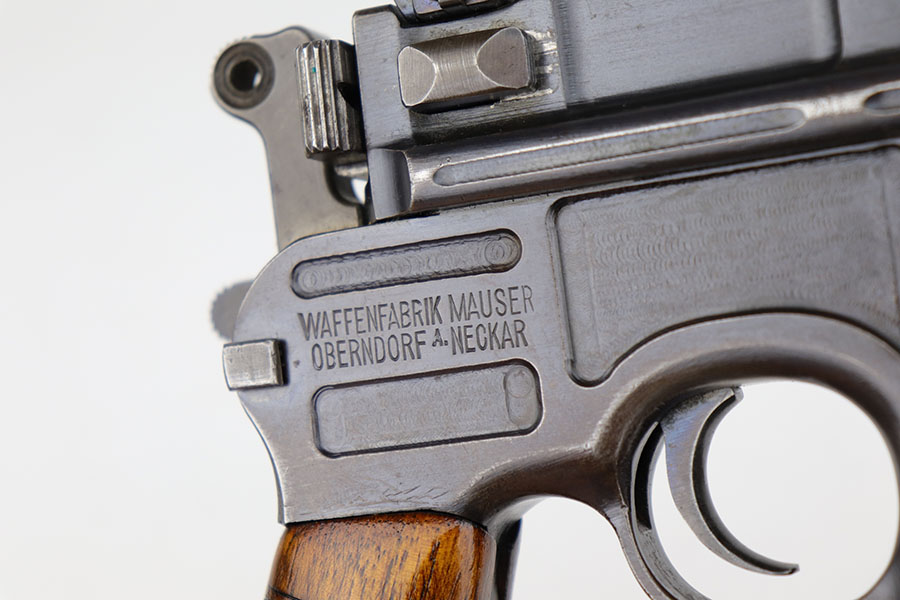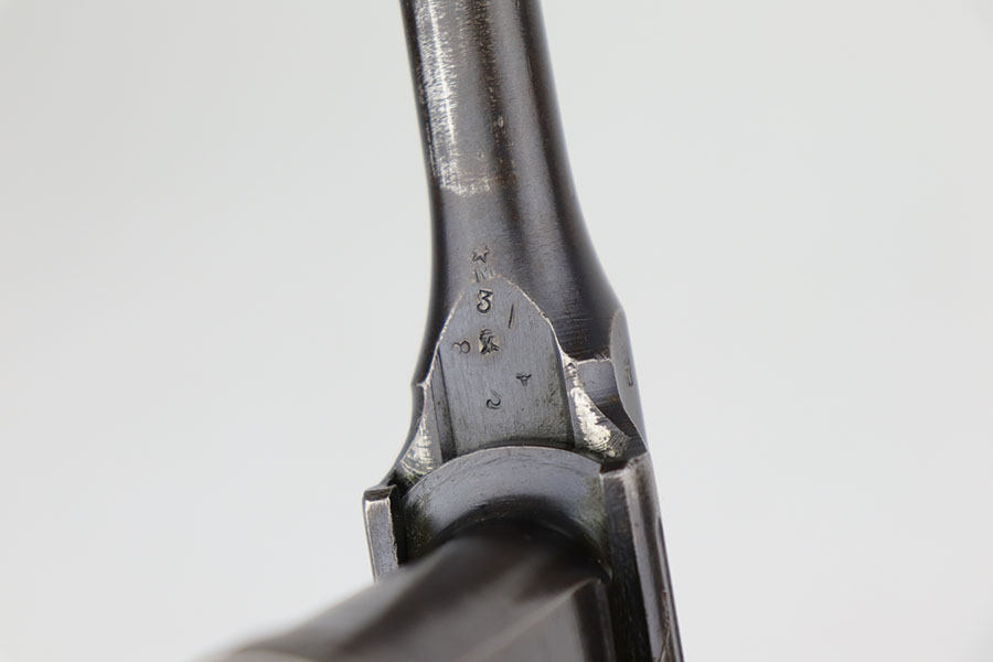 11/19/20 – This is a nice example of an all original ‘Red 9’ Mauser C96 with matching stock and reproduction harness. Unlike its commercial counterparts, “Red 9” Broomhandles were chambered in the more common 9mm Para caliber, which was used by the German Army and were marked with a large 9 on the grips which was then filled with red or orange paint to help German soldiers differentiate its caliber from the standard .30 mauser cartridge. Only about 130,000 of these very collectible guns were made, with only about 100,000 being accepted by the army and issued to the troops. Considered to be a substitute for a light carbine, they became very popular in trench warfare and were used by some of the Germany’s elite crack troops. The gun has about 90-94% of the original blue. It’s a little tough to rate as there isn’t much actual bluing loss, mainly just on the barrel, but there is some patina throughout. Small parts on the pistol show some fire blue still. The grips are matching numbered to the pistol, with the large red 9 externally, though much of the red paint has worn away. Stock is matching numbered to the gun. It doesn’t have any cracks but it does seem lightly sanded. Minty bore.