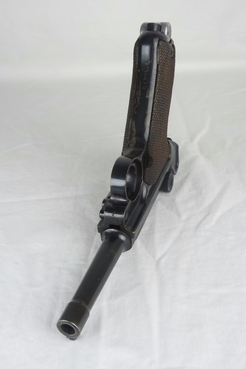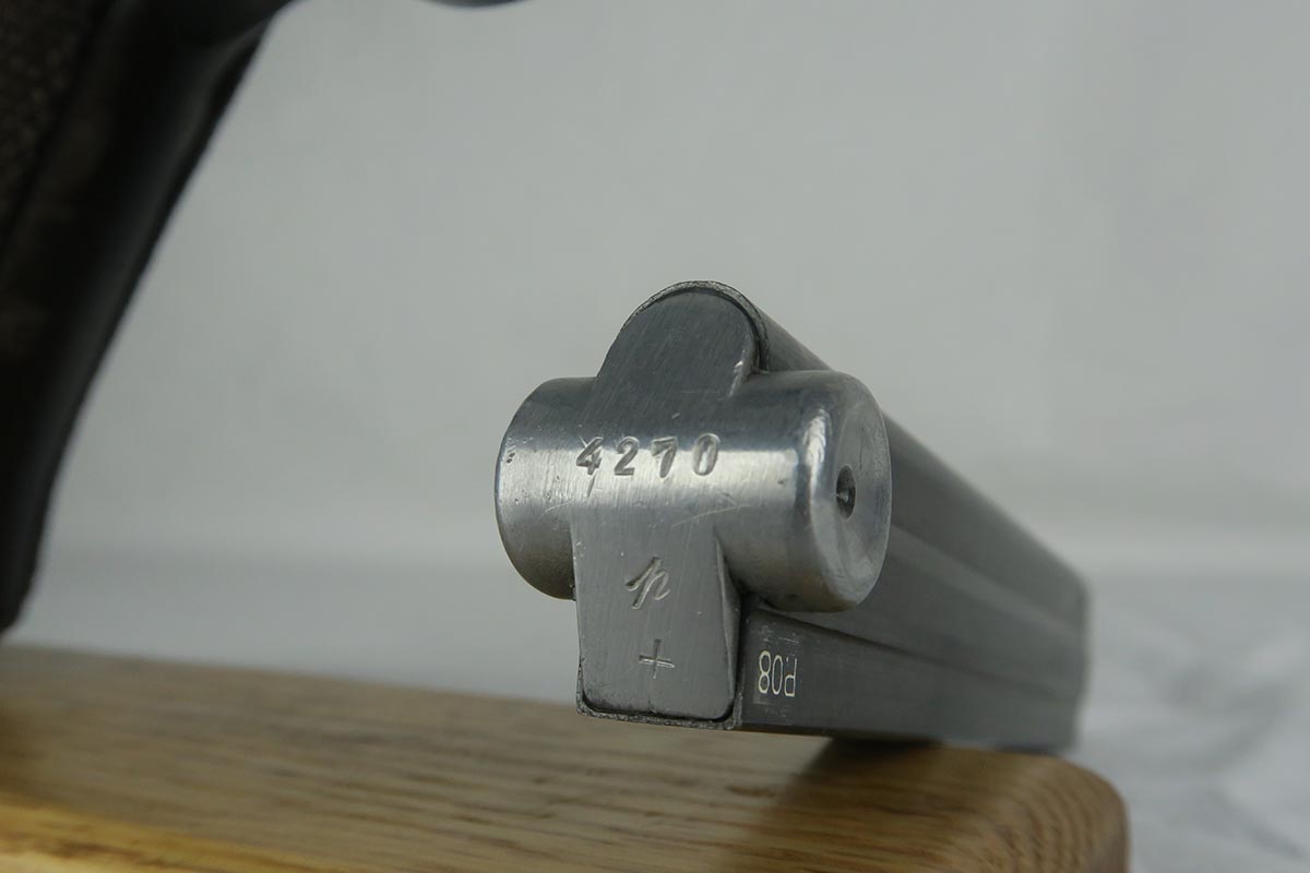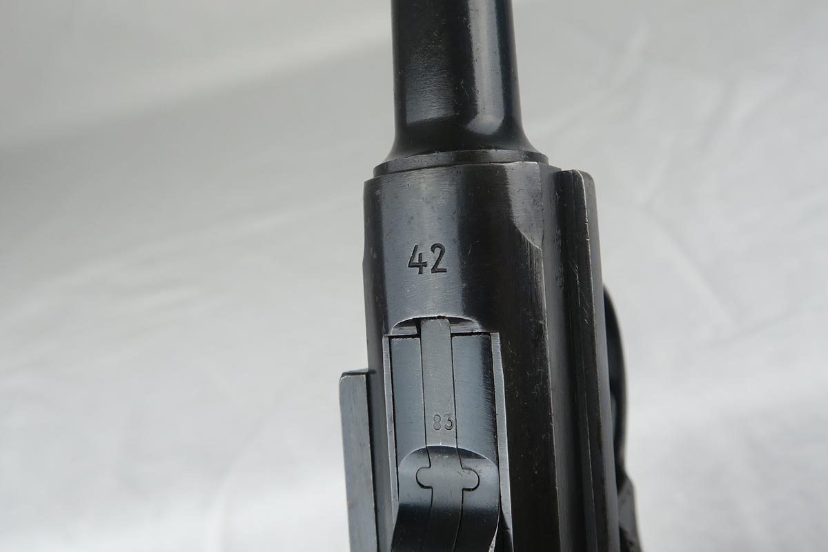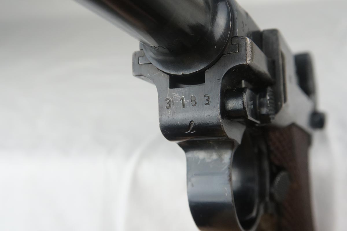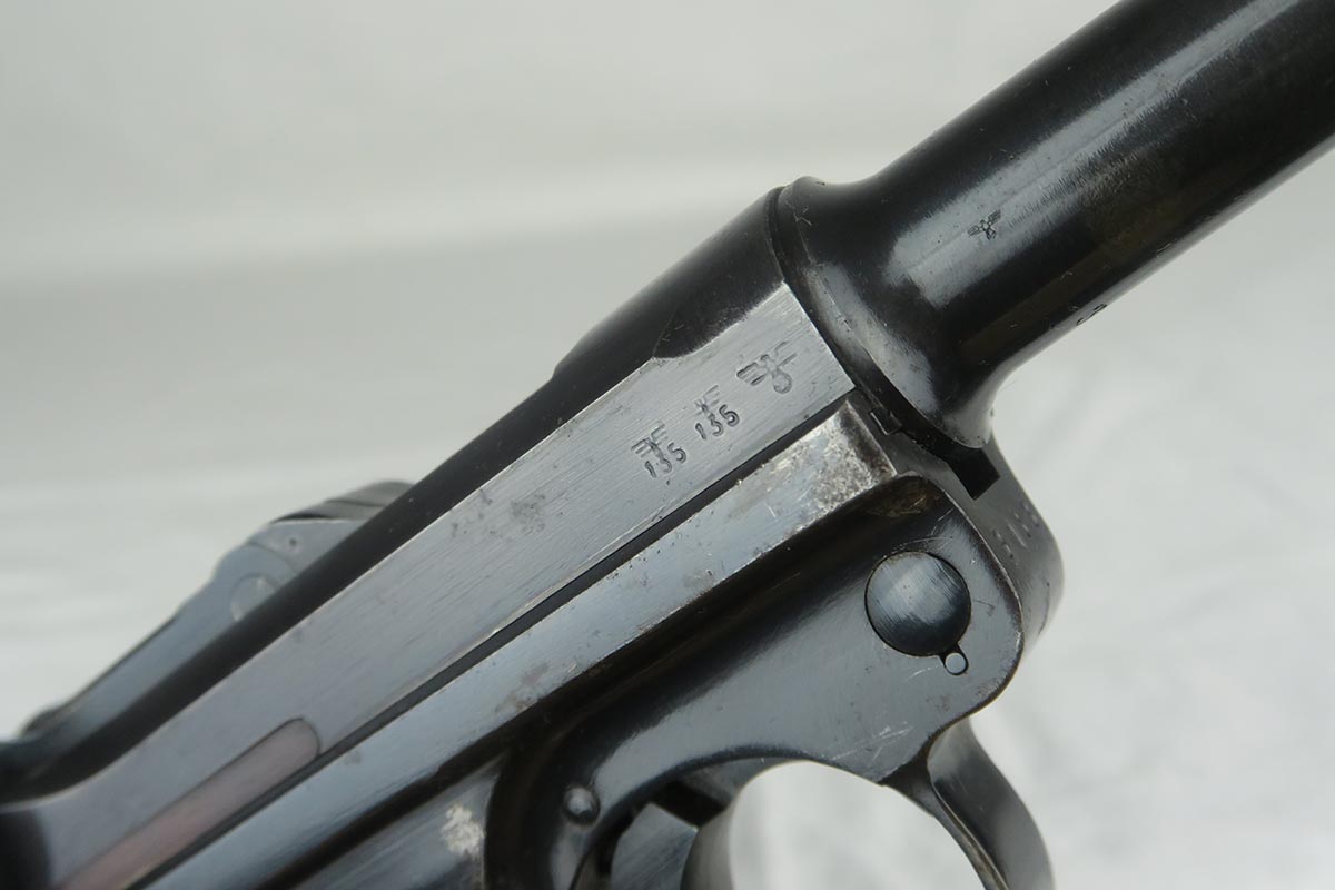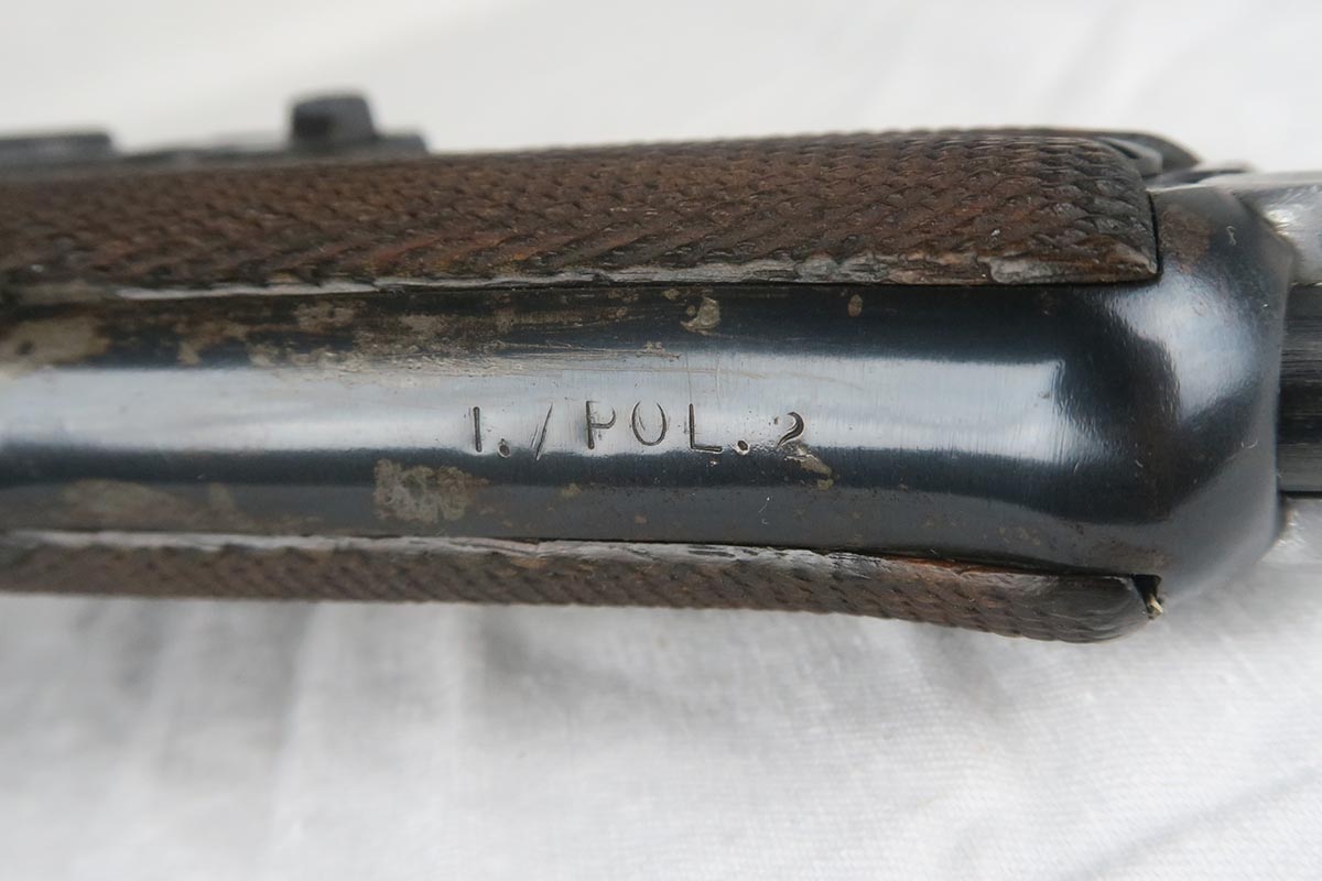 11/29/17 – This is a bit of an oddball Mauser luger from World War II.  It seems largely correct and all original, which matching small parts and grips.   The finish is original and rates somewhere in the 80’s, as the straps show some discoloration  where a solvent of some kind may have taken away some finish.  There is surface pinpricking on the barrel and sideplate.  But on the front strap, there appears to be a police unit marking.  World War II police lugers were not marked this way, but I’m also not sure why someone would attempt to fake this proof.  There is also a crude set of SS runes scratched into the back strap, but this would appear to be a GI embellishment to me, rather than a past collector trying to raise the value of the gun.  The grips are numbered to the gun, and the magazine is period correct (fxo) but numbered to a different pistol.  Shiny, strong bore.