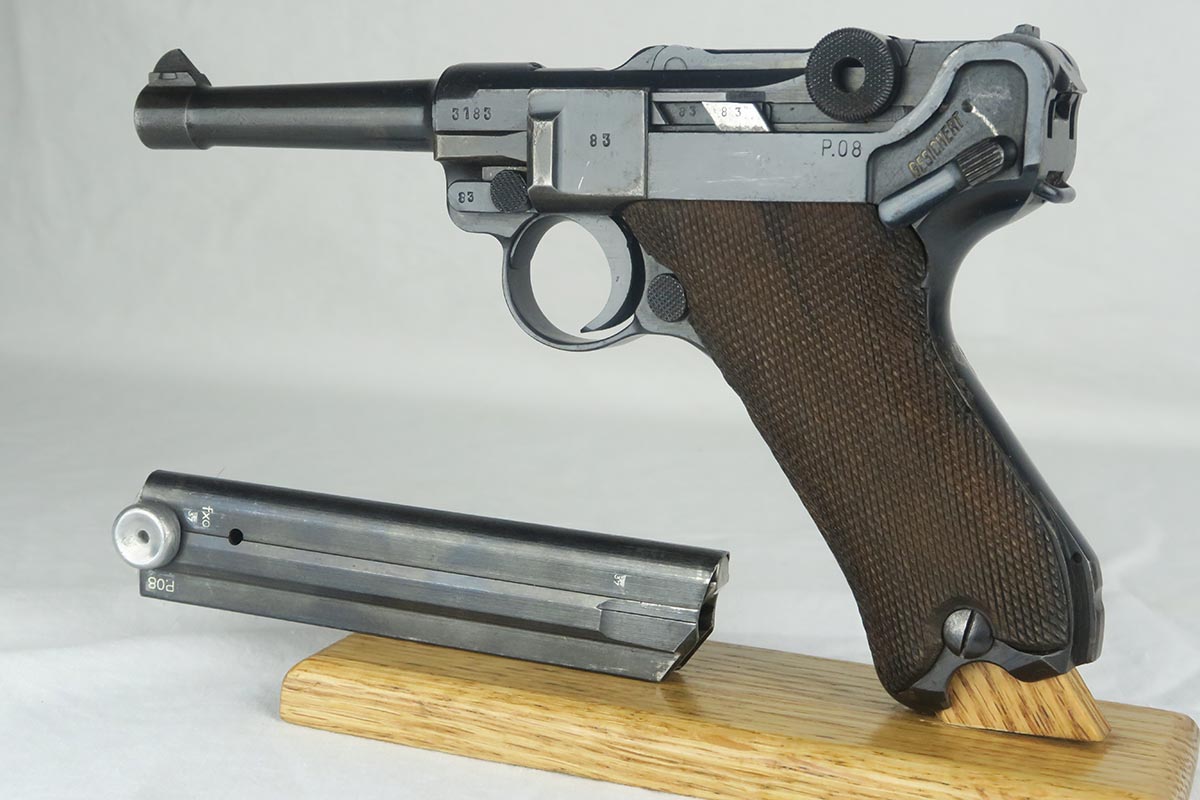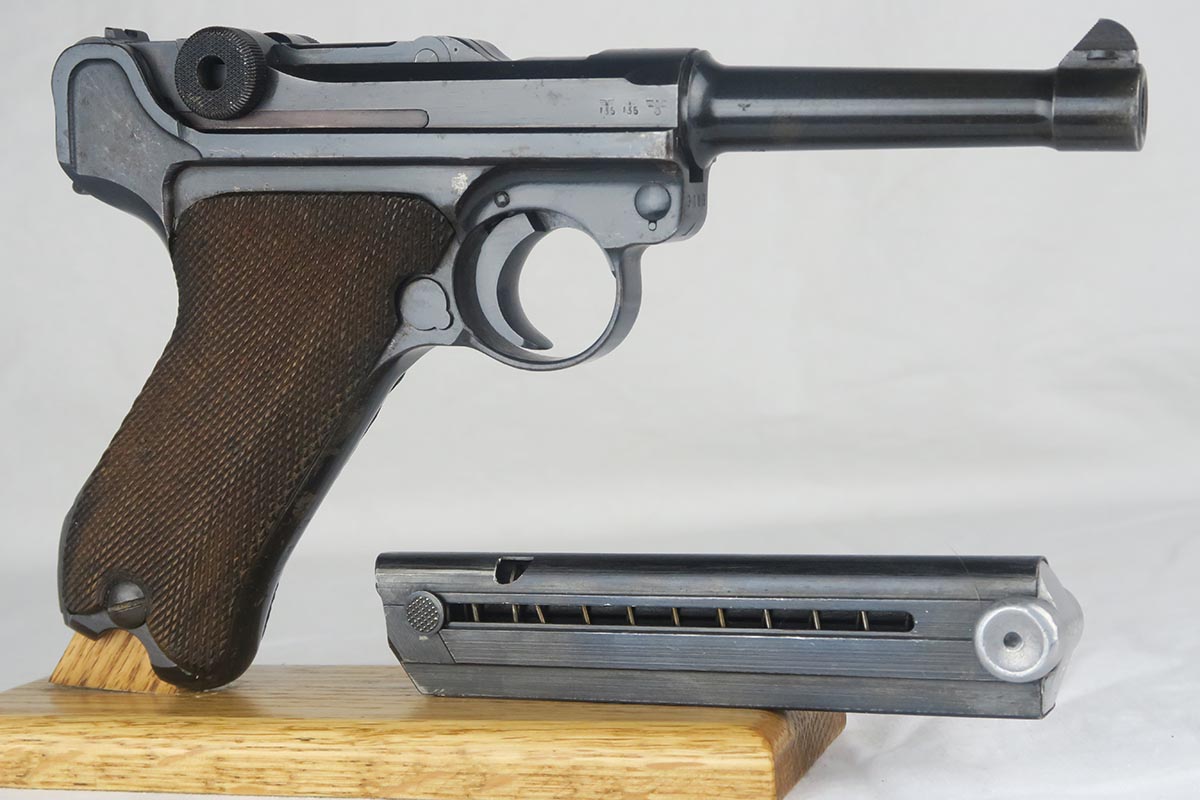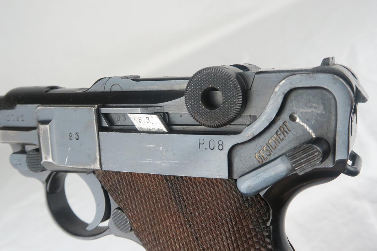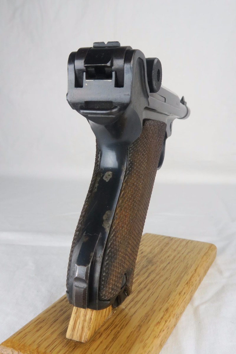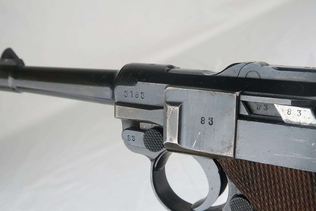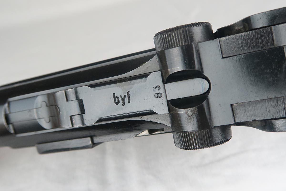 11/29/17 – This is a bit of an oddball Mauser luger from World War II.  It seems largely correct and all original, which matching small parts and grips.   The finish is original and rates somewhere in the 80’s, as the straps show some discoloration  where a solvent of some kind may have taken away some finish.  There is surface pinpricking on the barrel and sideplate.  But on the front strap, there appears to be a police unit marking.  World War II police lugers were not marked this way, but I’m also not sure why someone would attempt to fake this proof.  There is also a crude set of SS runes scratched into the back strap, but this would appear to be a GI embellishment to me, rather than a past collector trying to raise the value of the gun.  The grips are numbered to the gun, and the magazine is period correct (fxo) but numbered to a different pistol.  Shiny, strong bore.