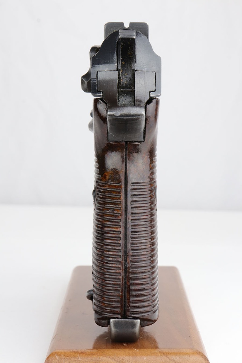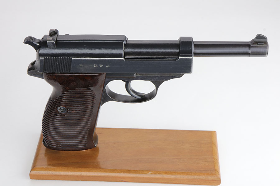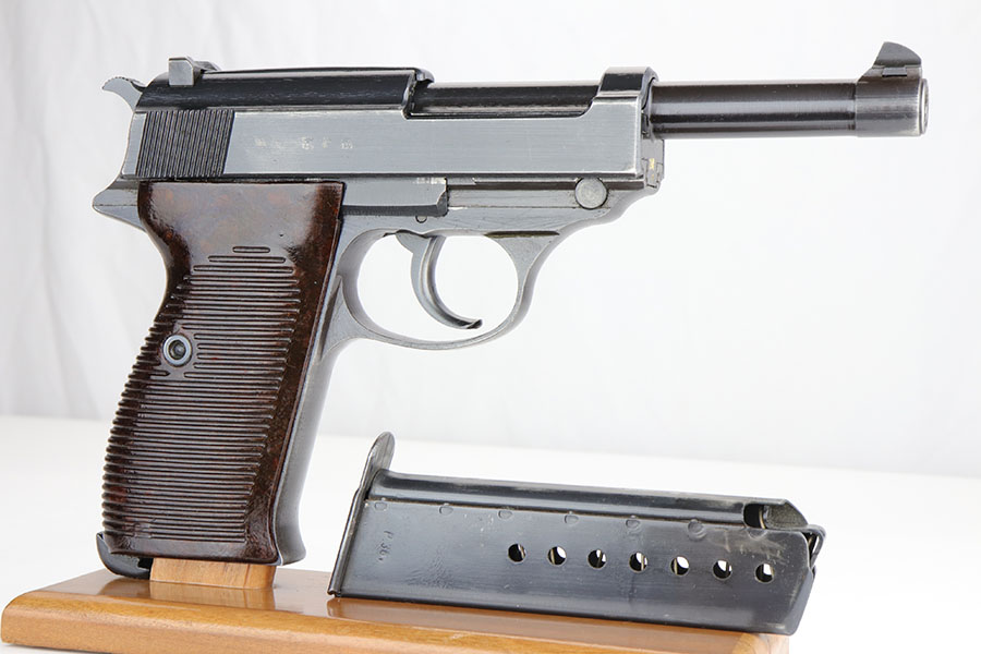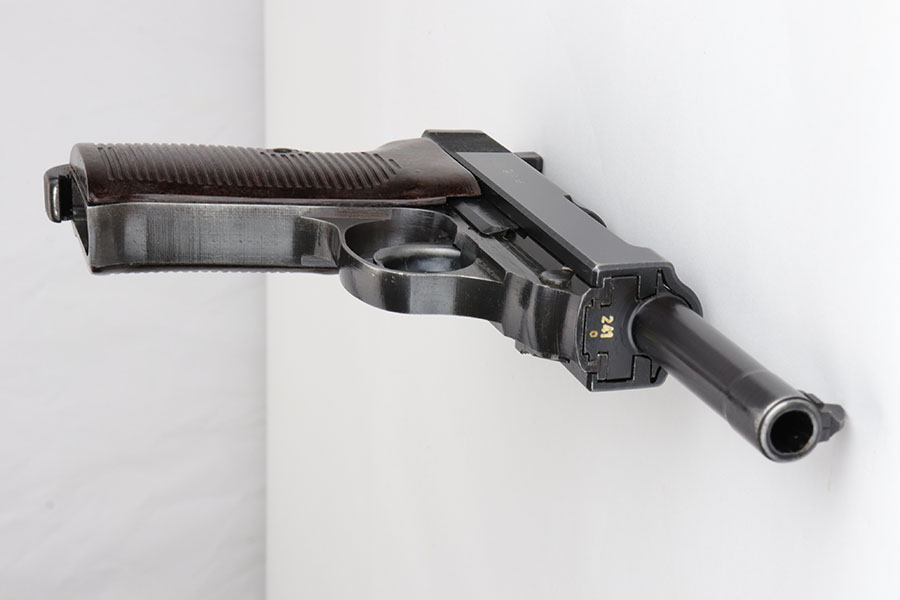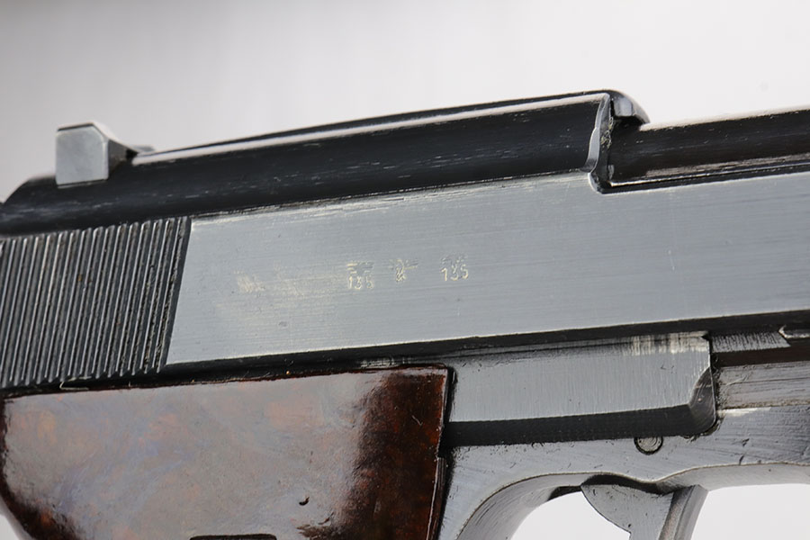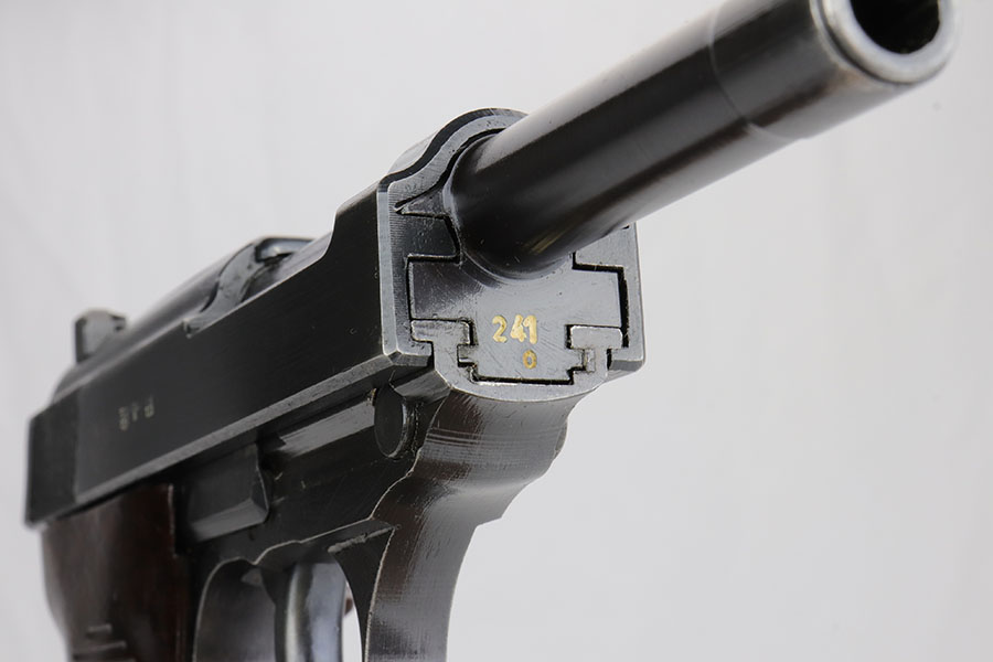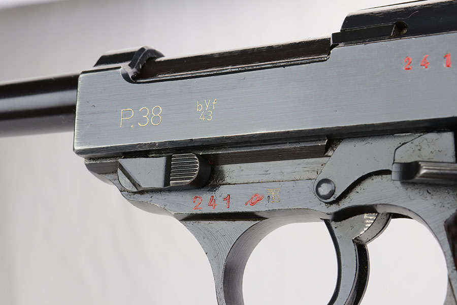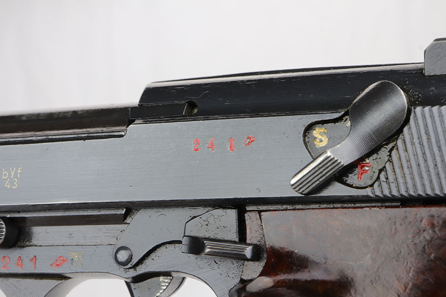 11/7/19 – This is an original 1943 production P.38 pistol made by Mauser. The pistol has very nice finish and is all matching and correct. There’s some light finish loss on the pistol, mostly on the front strap. There’s also edge wear on the slide and some thinning near the muzzle / barrel. Overall rates at about 92-94%. Oddly, the serial numbers are filled with red paint, see photos. We didn’t try to remove this, but it could be removed if desired. The bore is excellent with minimal signs of use.