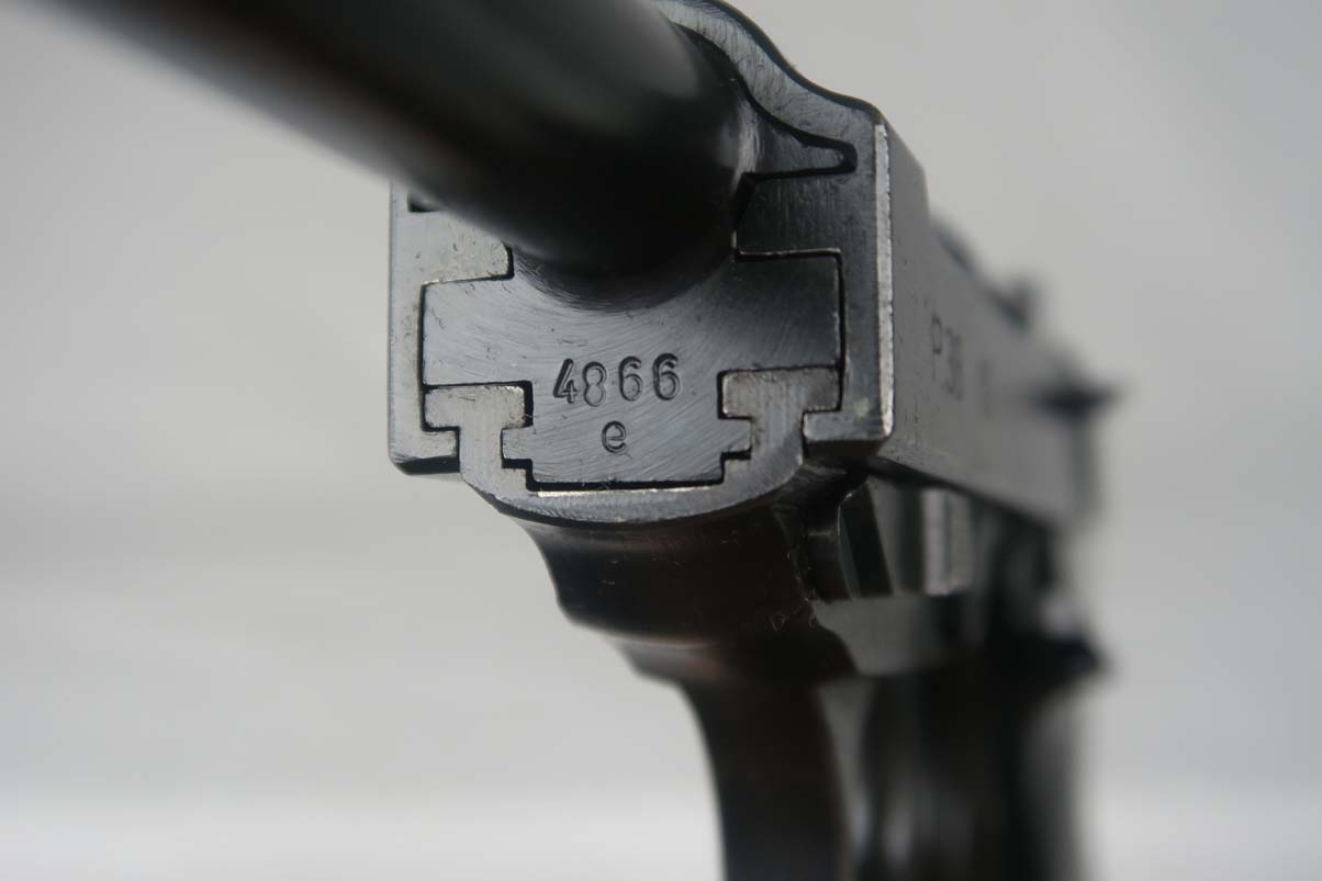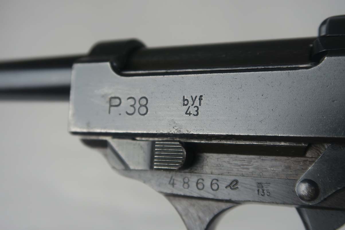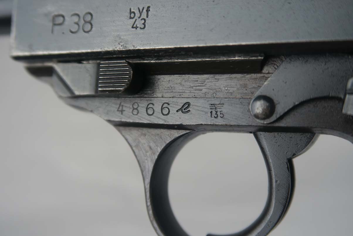 4/14/17 – This is a Mauser P.38, marked byf 43 on slide, in very nice original condition. It has a dust-blue finish, with about 95-96% bluing remaining. Majority of finish loss can be found on the trigger guard and the high edges. Proper Mauser grips are in excellent condition, and the magazine is marked E/135, just like the frame of the pistol. Near-mint bore.