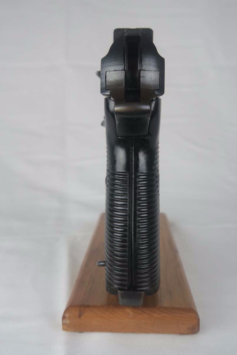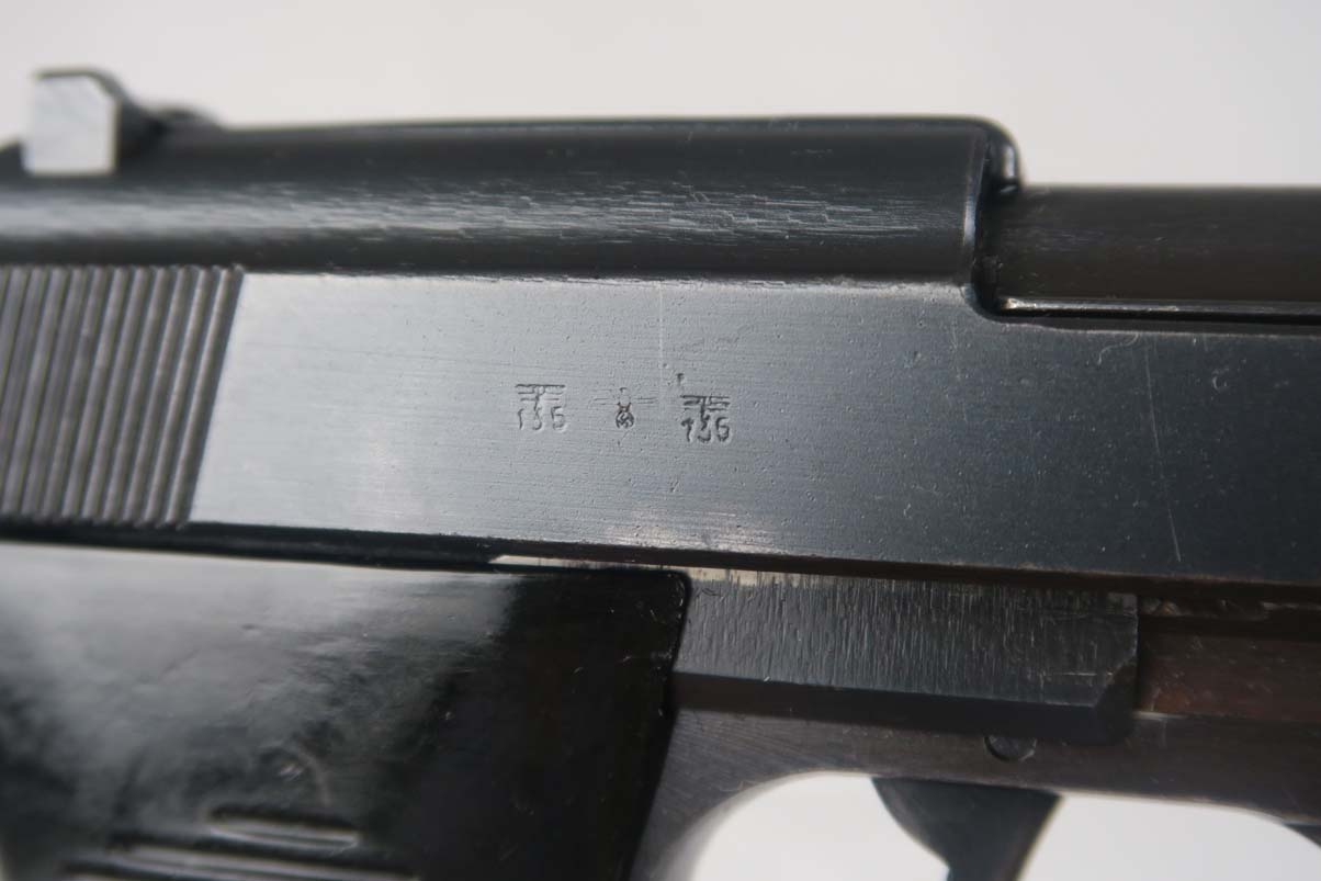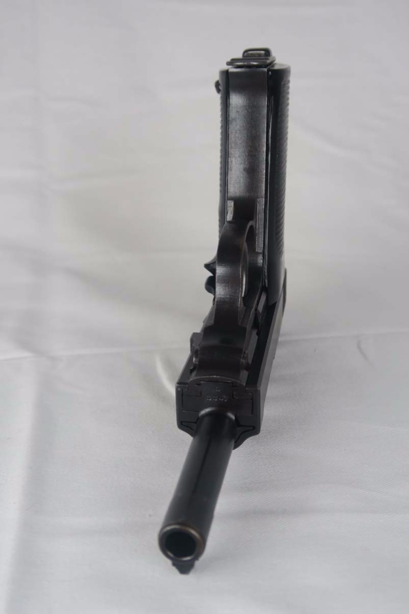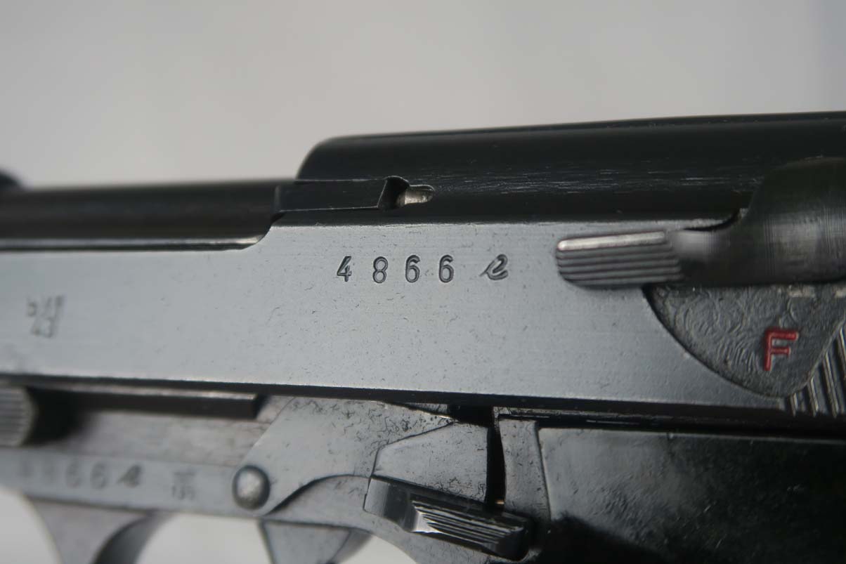 4/14/17 – This is a Mauser P.38, marked byf 43 on slide, in very nice original condition. It has a dust-blue finish, with about 95-96% bluing remaining. Majority of finish loss can be found on the trigger guard and the high edges. Proper Mauser grips are in excellent condition, and the magazine is marked E/135, just like the frame of the pistol. Near-mint bore.
