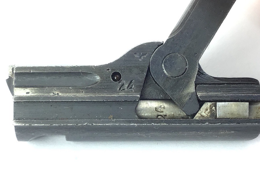 6/12/23 – This is a complete, authentic, numbers matching. (Number 24) Toggle Assembly for a WW2 era Mauser Luger. Bluing is 98% and all pieces function properly. Firing pin is fluted and numbers matching. Includes the breech block, extractor, springs, pins, firing pin and coupling link. Excellent piece.