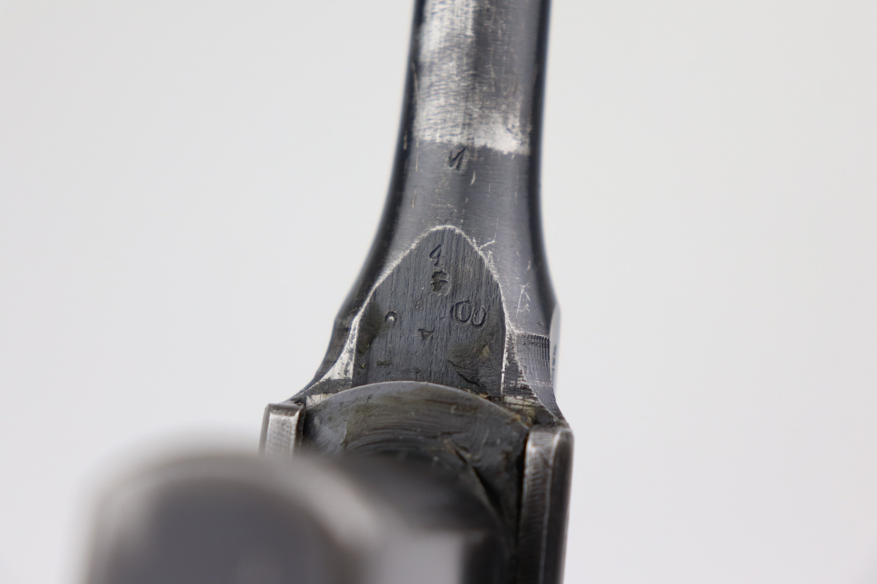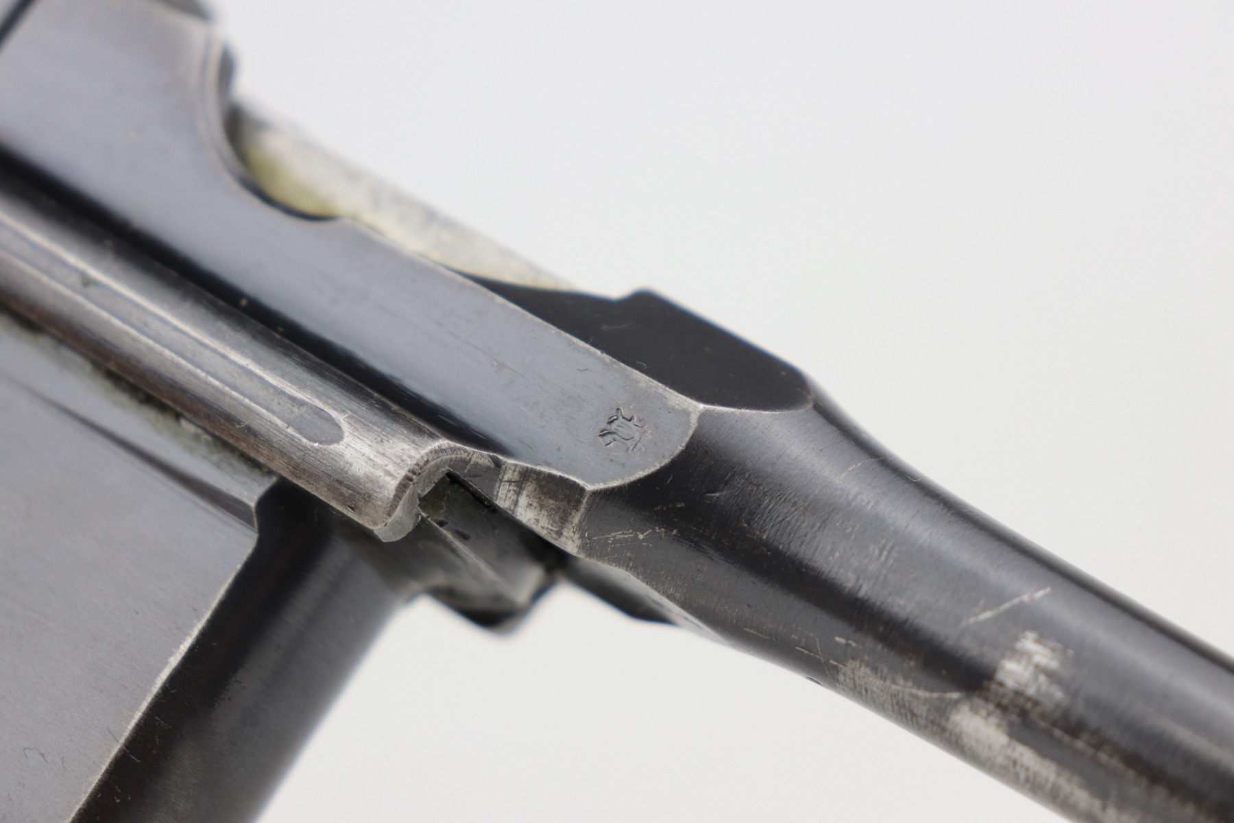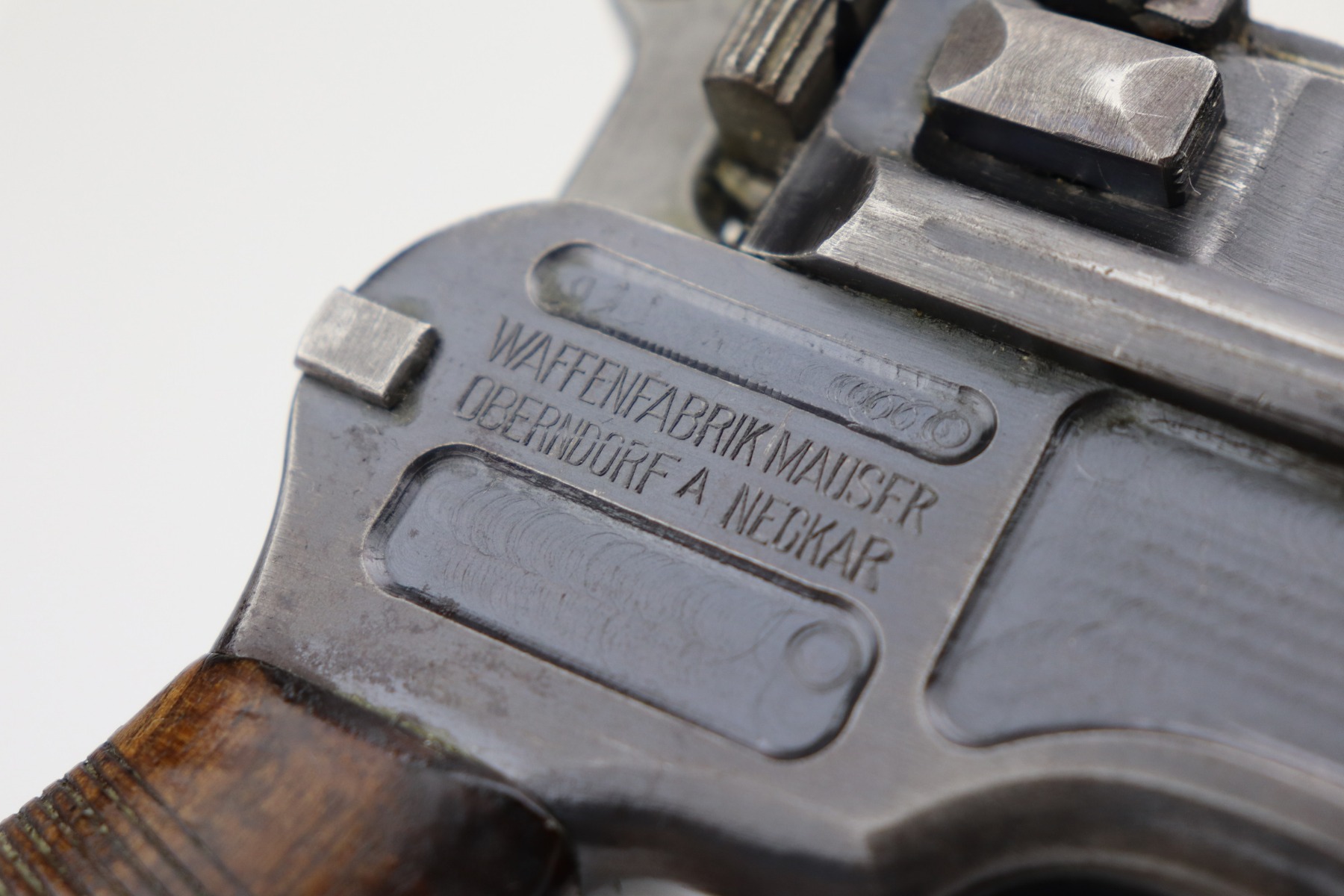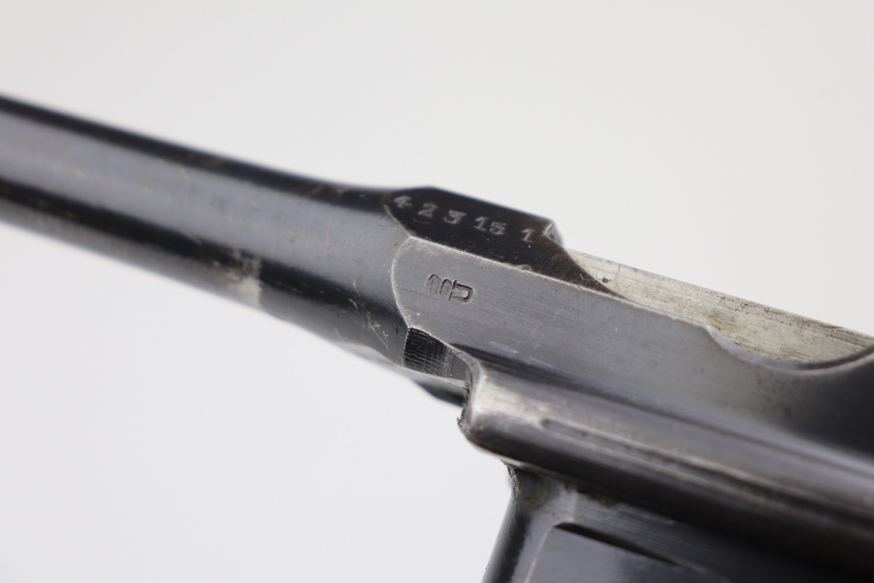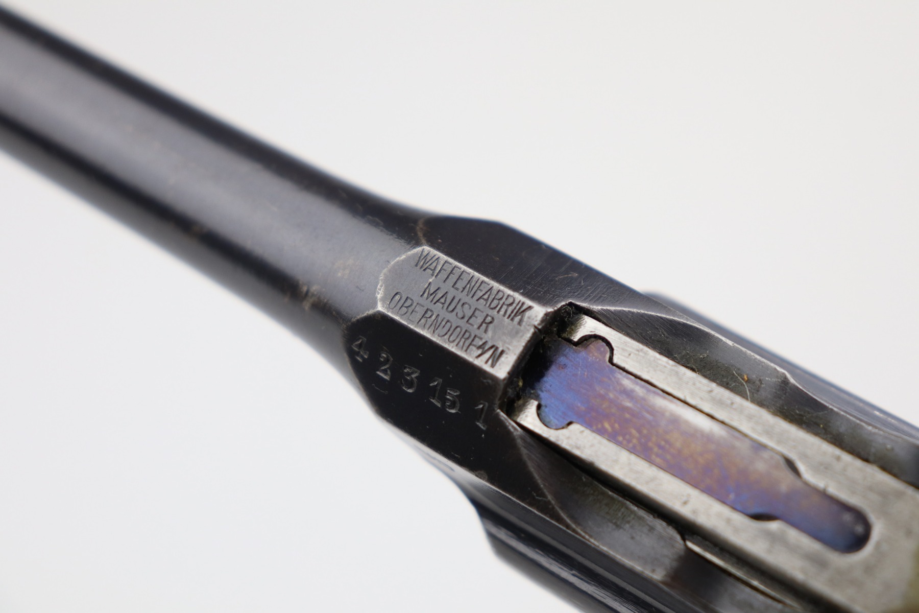 3/3/21 – This is a very nice example of a wartime commercial Mauser C96 Broomhandle manufactured in 1917-18. The gun is all matching and has retained somewhere between 85-90% of its original finish. There is thinning and patina on the back strap, minor wear on some of the high edges, and streaks of wear on the underside of the barrel. Some of the original fire-blue on the small parts is in tact. Very nice original matching grips. The bore has decent rifling, but there is oxidation throughout.