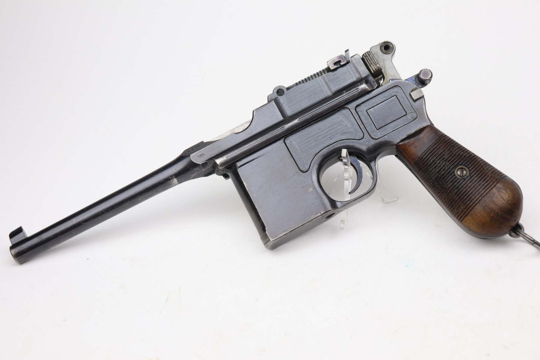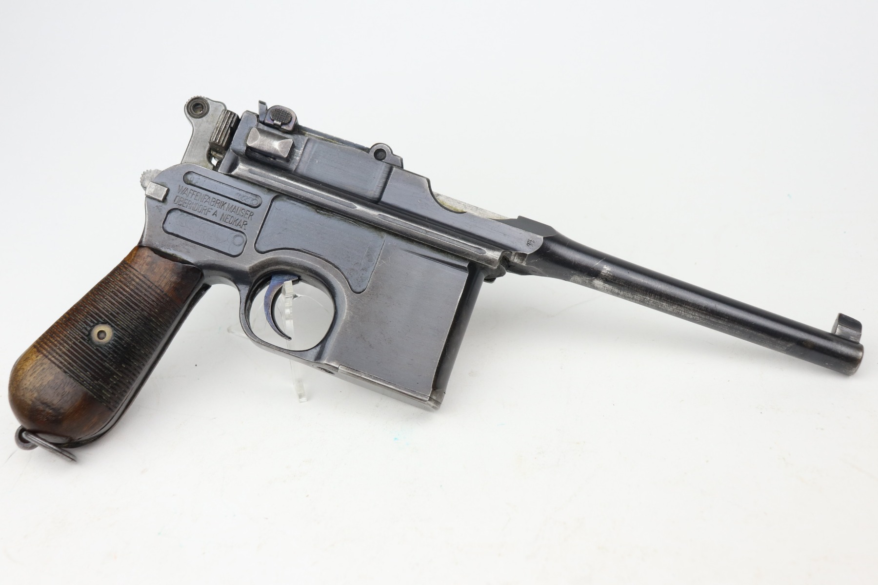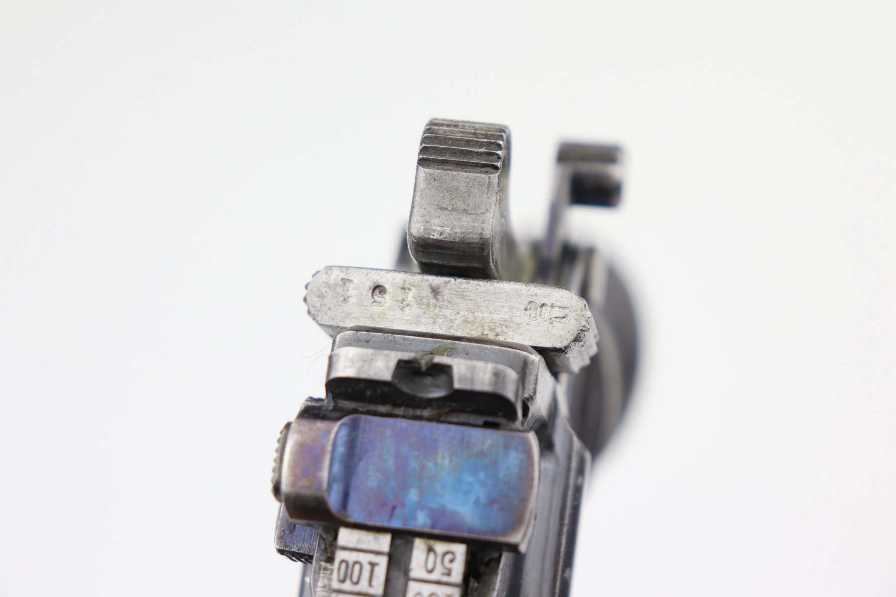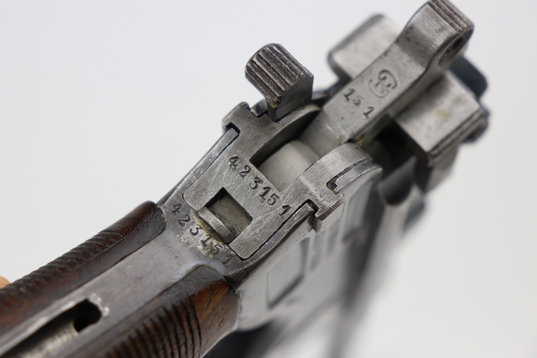 3/3/21 – This is a very nice example of a wartime commercial Mauser C96 Broomhandle manufactured in 1917-18. The gun is all matching and has retained somewhere between 85-90% of its original finish. There is thinning and patina on the back strap, minor wear on some of the high edges, and streaks of wear on the underside of the barrel. Some of the original fire-blue on the small parts is in tact. Very nice original matching grips. The bore has decent rifling, but there is oxidation throughout.