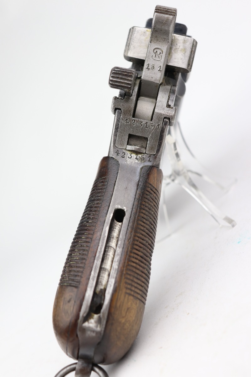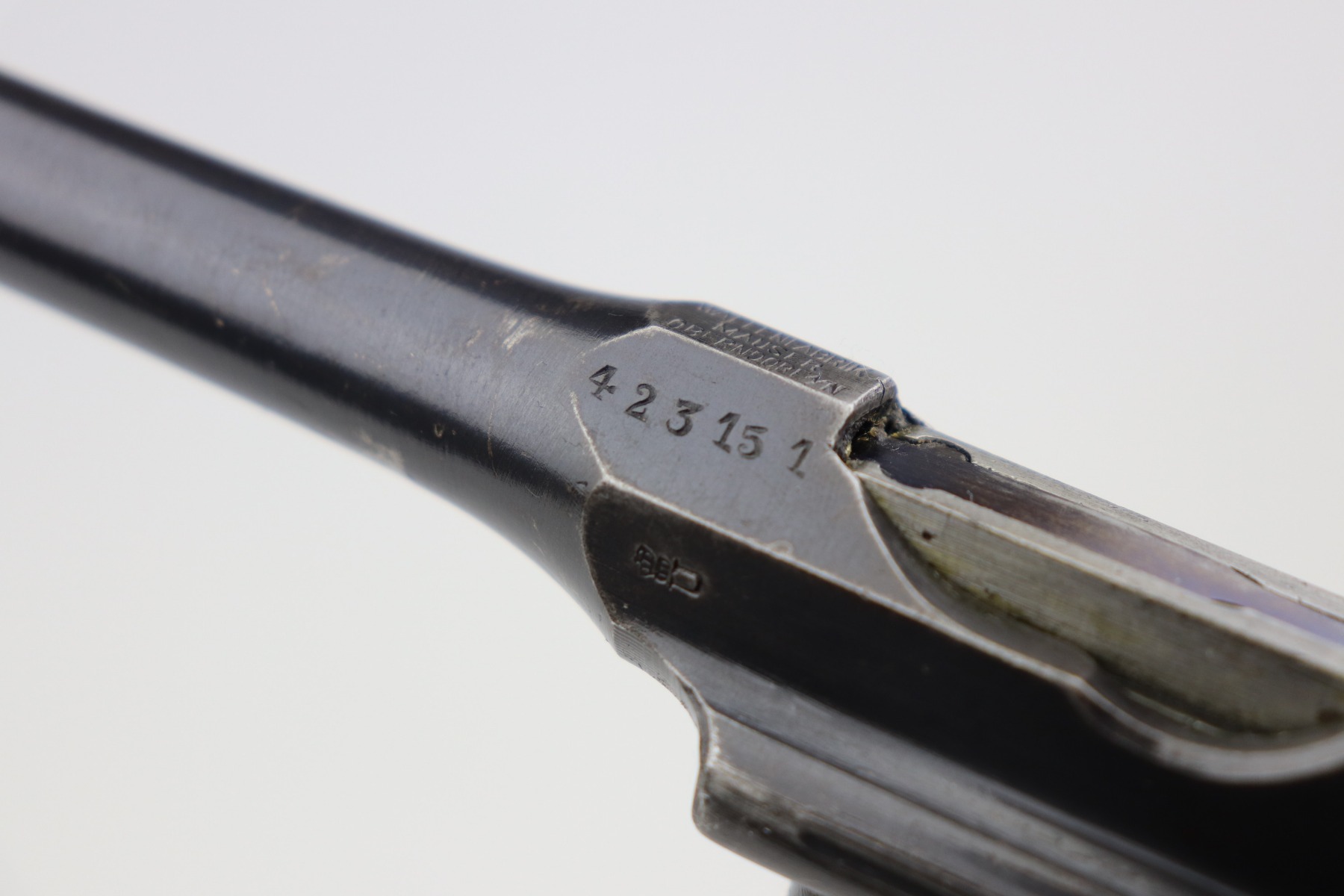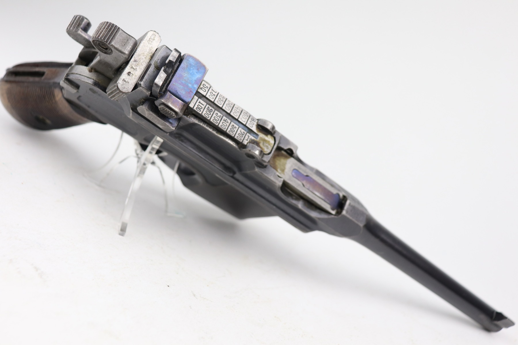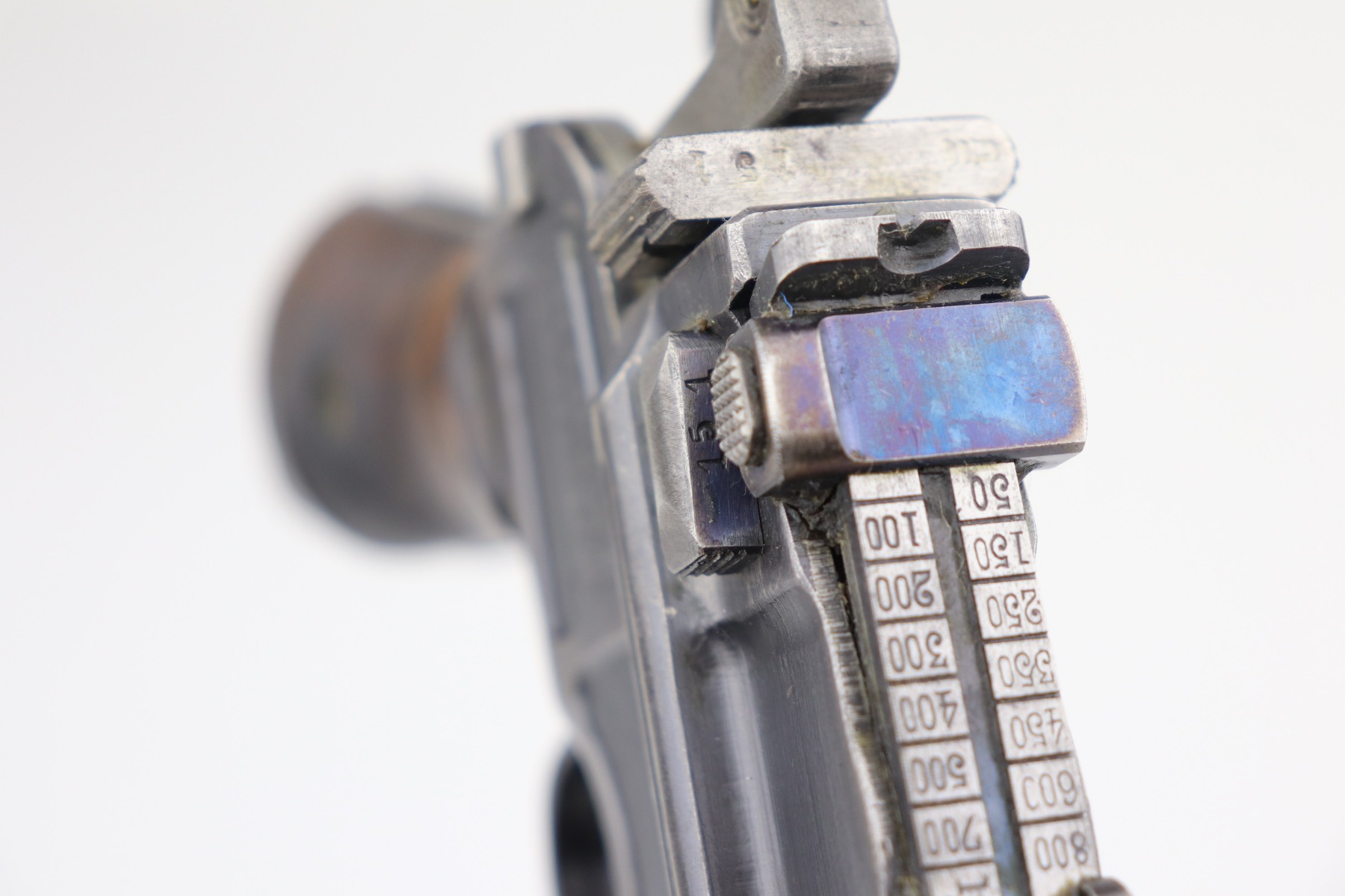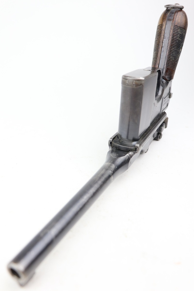 3/3/21 – This is a very nice example of a wartime commercial Mauser C96 Broomhandle manufactured in 1917-18. The gun is all matching and has retained somewhere between 85-90% of its original finish. There is thinning and patina on the back strap, minor wear on some of the high edges, and streaks of wear on the underside of the barrel. Some of the original fire-blue on the small parts is in tact. Very nice original matching grips. The bore has decent rifling, but there is oxidation throughout.