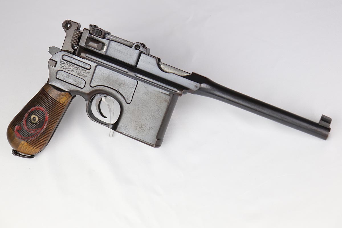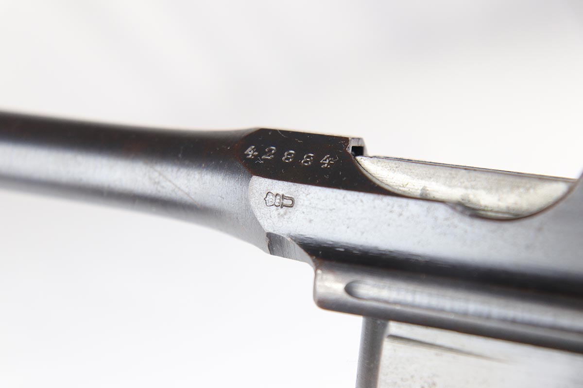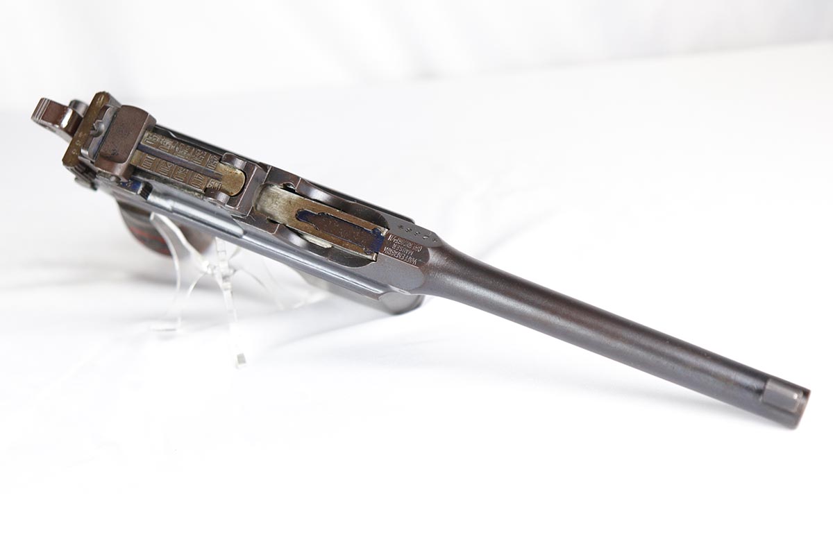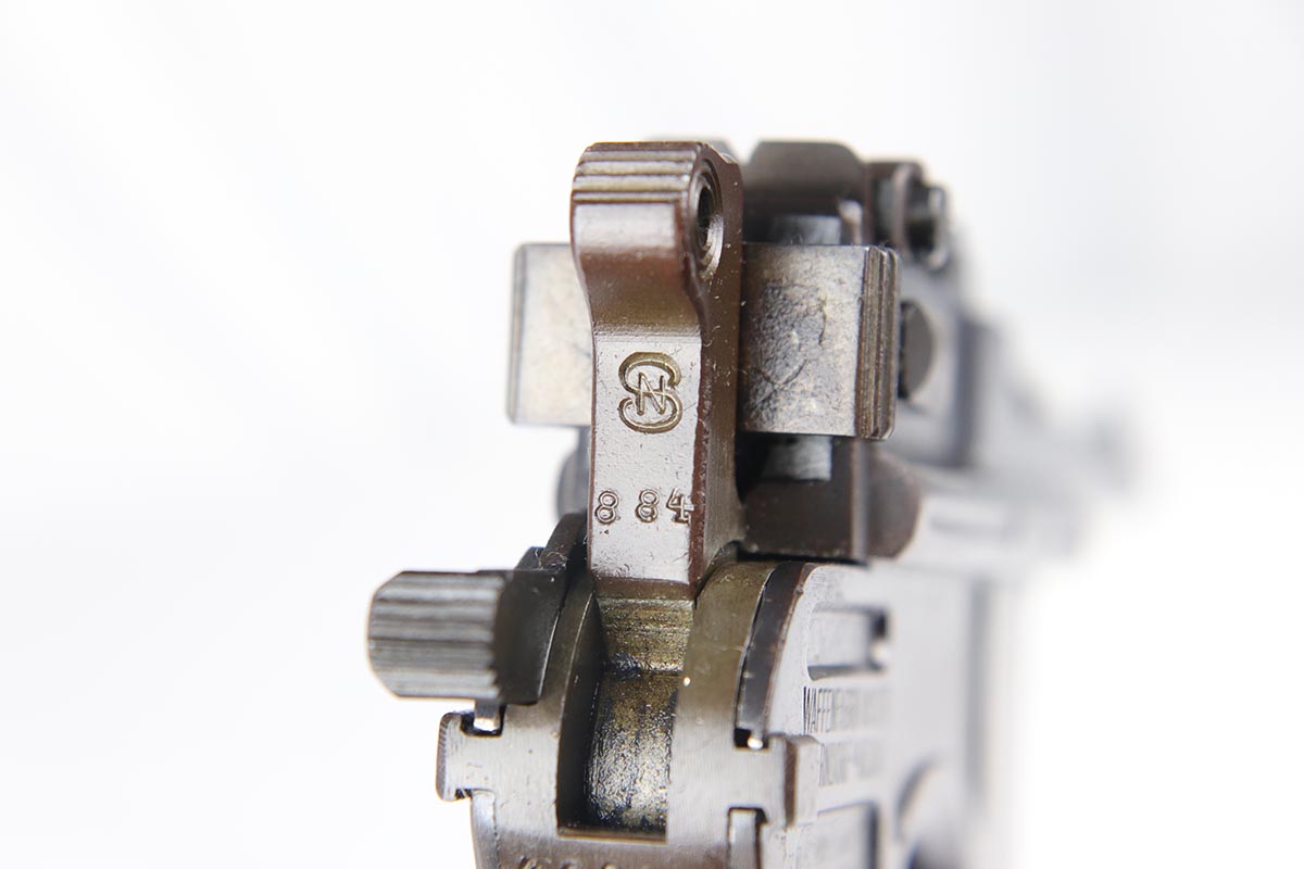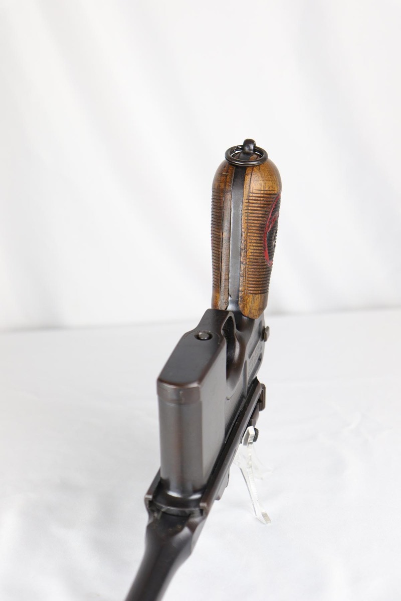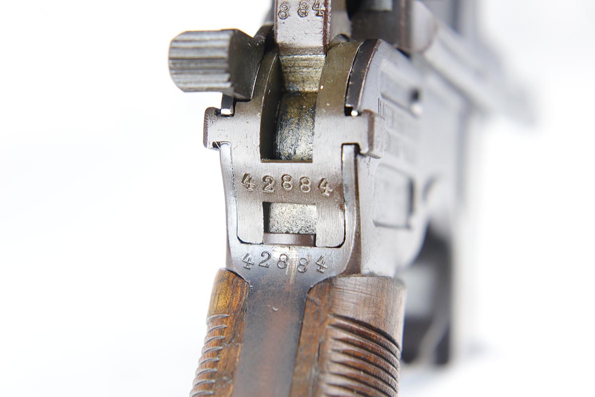 3/1/18 – This is an all original Mauser C96, also known as a Red 9.  The finish rates at about 98+%, with almost no visible wear, but there is patina throughout.  Grips are matching to the gun, and have the number 9 cut into them, and filled with red paint.  This was done to distinguish between the M1896/16 and the M1896/12.  It also denotes that the pistol was chambered in 9mm.  Because the added red 9 was accomplished by various regimental armorers in the field during war time, it varies in size, color and quality.   Minty bore.
