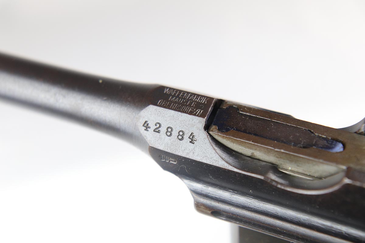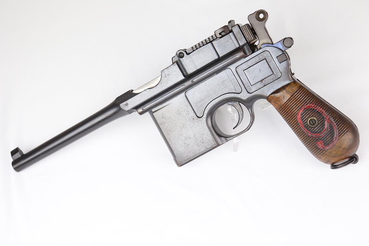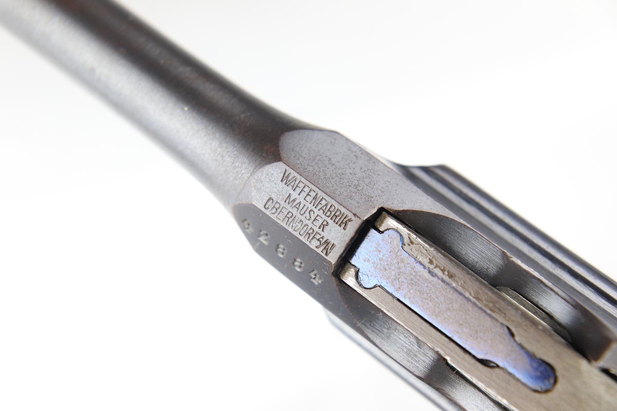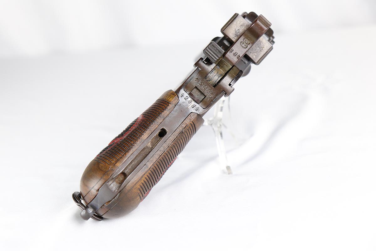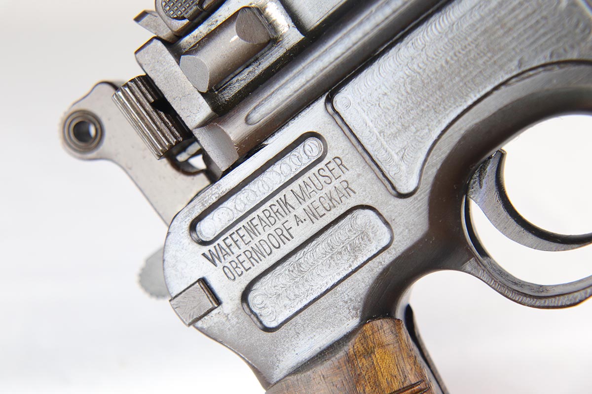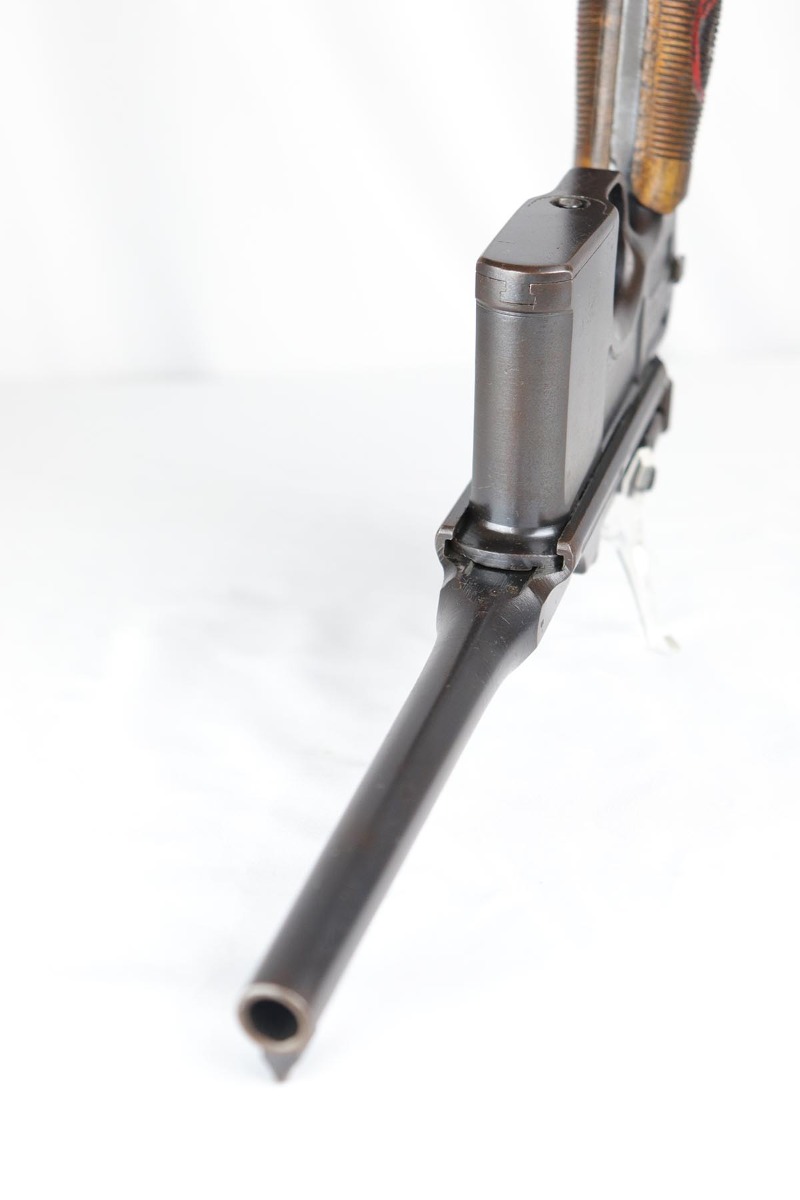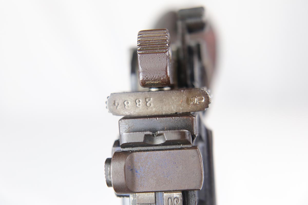 3/1/18 – This is an all original Mauser C96, also known as a Red 9.  The finish rates at about 98+%, with almost no visible wear, but there is patina throughout.  Grips are matching to the gun, and have the number 9 cut into them, and filled with red paint.  This was done to distinguish between the M1896/16 and the M1896/12.  It also denotes that the pistol was chambered in 9mm.  Because the added red 9 was accomplished by various regimental armorers in the field during war time, it varies in size, color and quality.   Minty bore.
