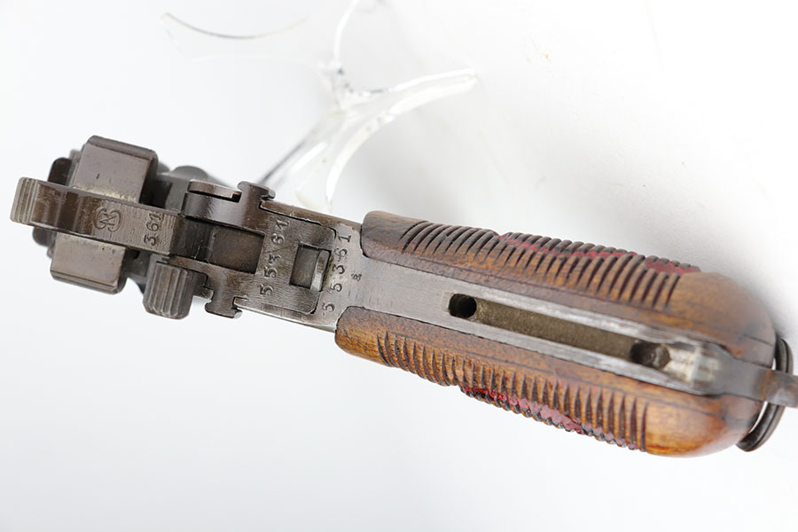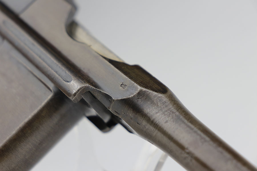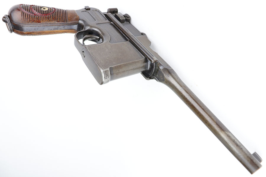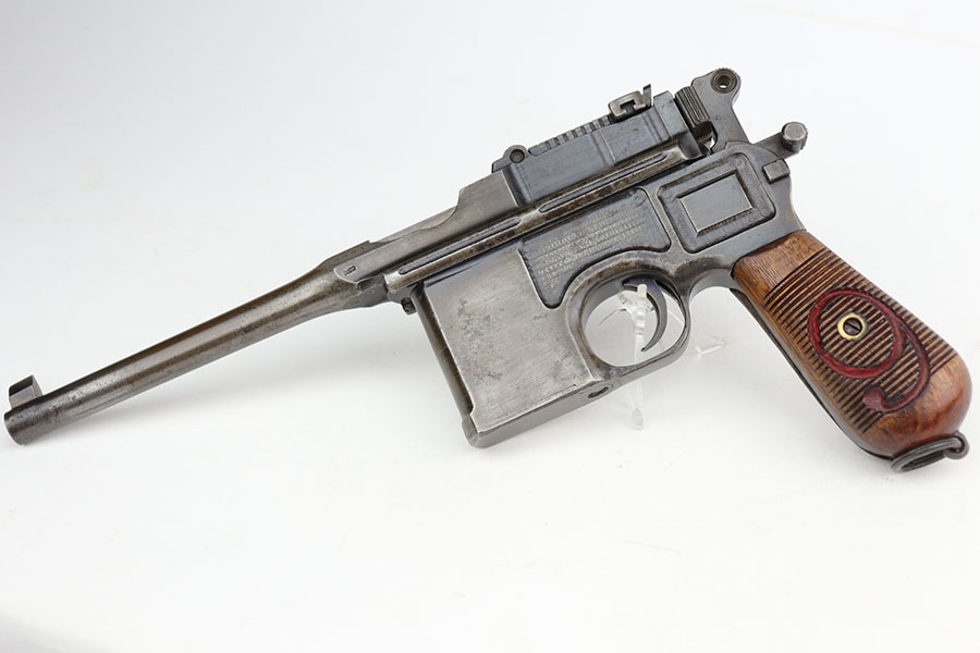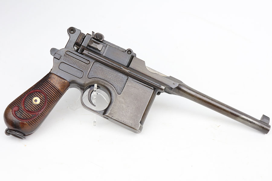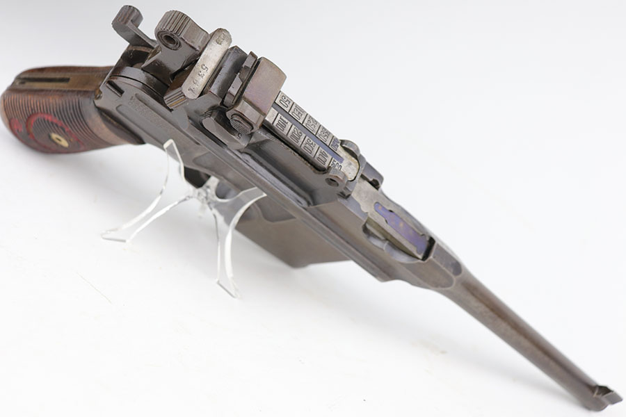2/321 – This is a “Red 9” Mauser C96 Broomhandle, chambered in 9mm. Unlike its commercial counterparts, “Red 9” Broomhandles were chambered in the more common 9mm Para caliber, which was used by the German Army and were marked with a large 9 on the grips which was then filled with red or orange paint to help German soldiers differentiate its caliber from the standard .30 mauser cartridge. Only about 130,000 of these very collectible guns were made, with only about 100,000 being accepted by the army and issued to the troops. Considered to be a substitute for a light carbine, they became very popular in trench warfare and were used by some of the Germany’s elite crack troops. This one is all matching and has retained about 60% of its original finish. There is general thinning, light brown patina, and spotty oxidation throughout. The grips are excellent and matching. The bore has great rifling with minor pin-pricking in the grooves.